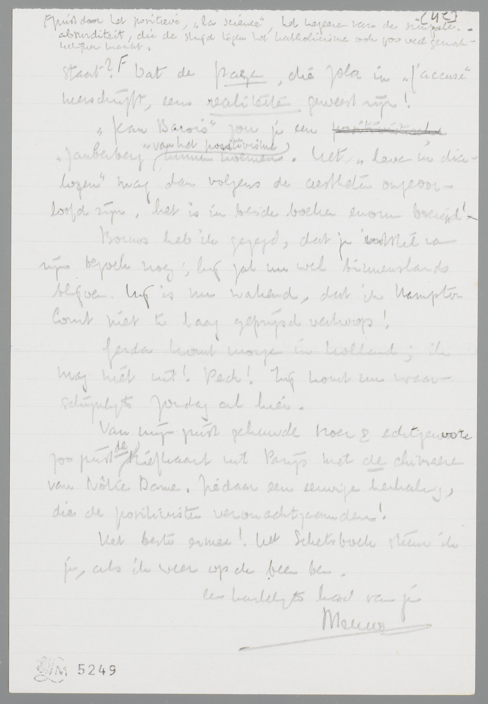 Heb jij ook niet het gevoel, dat de tijd van het positivisme ontzaglijk ver van je afstaat? Juist door het positieve, ‘la science’, het negeeren van de simpele absurditeit, die de strijd tegen het katholicisme ook zoo veel gemakkelijker maakt. Dat de frazen, die Zola in J'accuse neerschrijft, eens realiteiten geweest zijn!