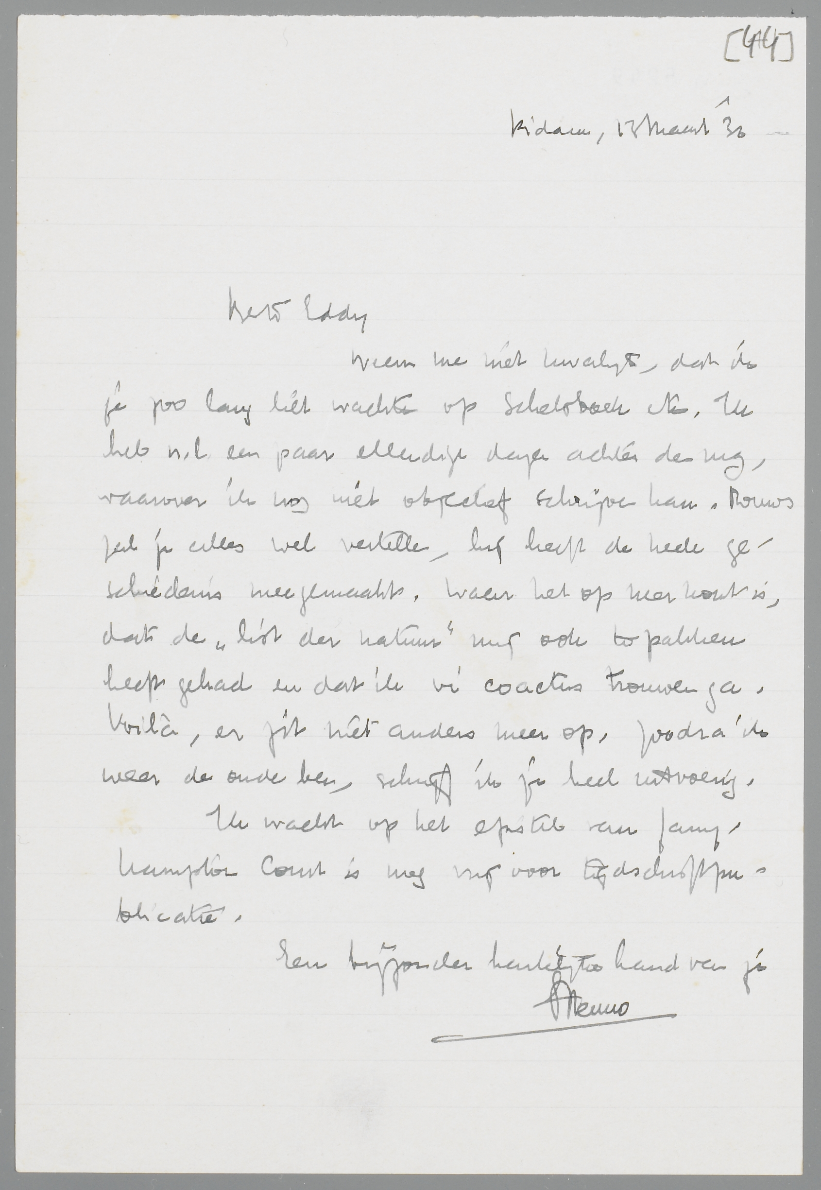 Bouws zal je alles wel vertellen, hij heeft de heele geschiedenis meegemaakt. Waar het op neer komt is, dat de ‘list der natuur’ mij ook te pakken heeft gehad en dat ik vi coactus trouwen ga. Voilà, er zit niet anders meer op. Zoodra ik weer de oude ben, schrijf ik je heel uitvoerig.