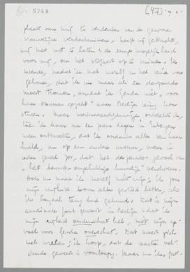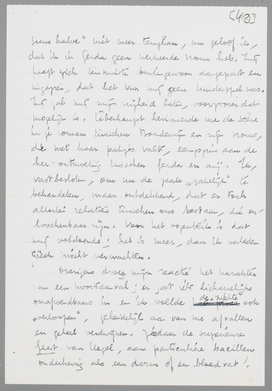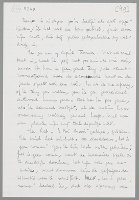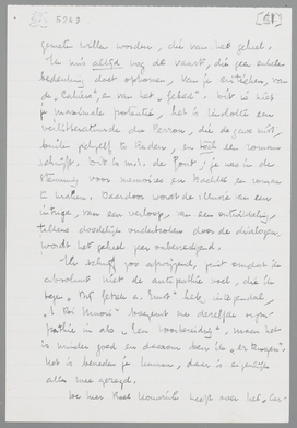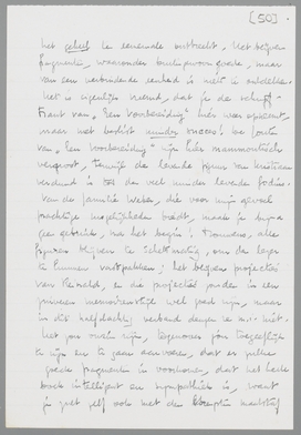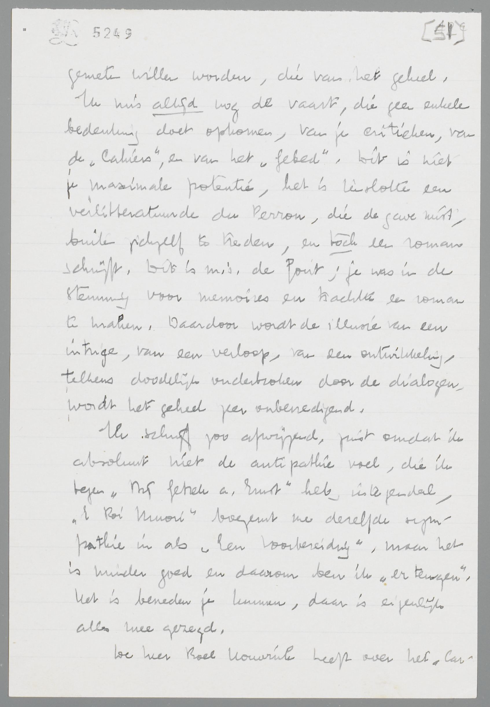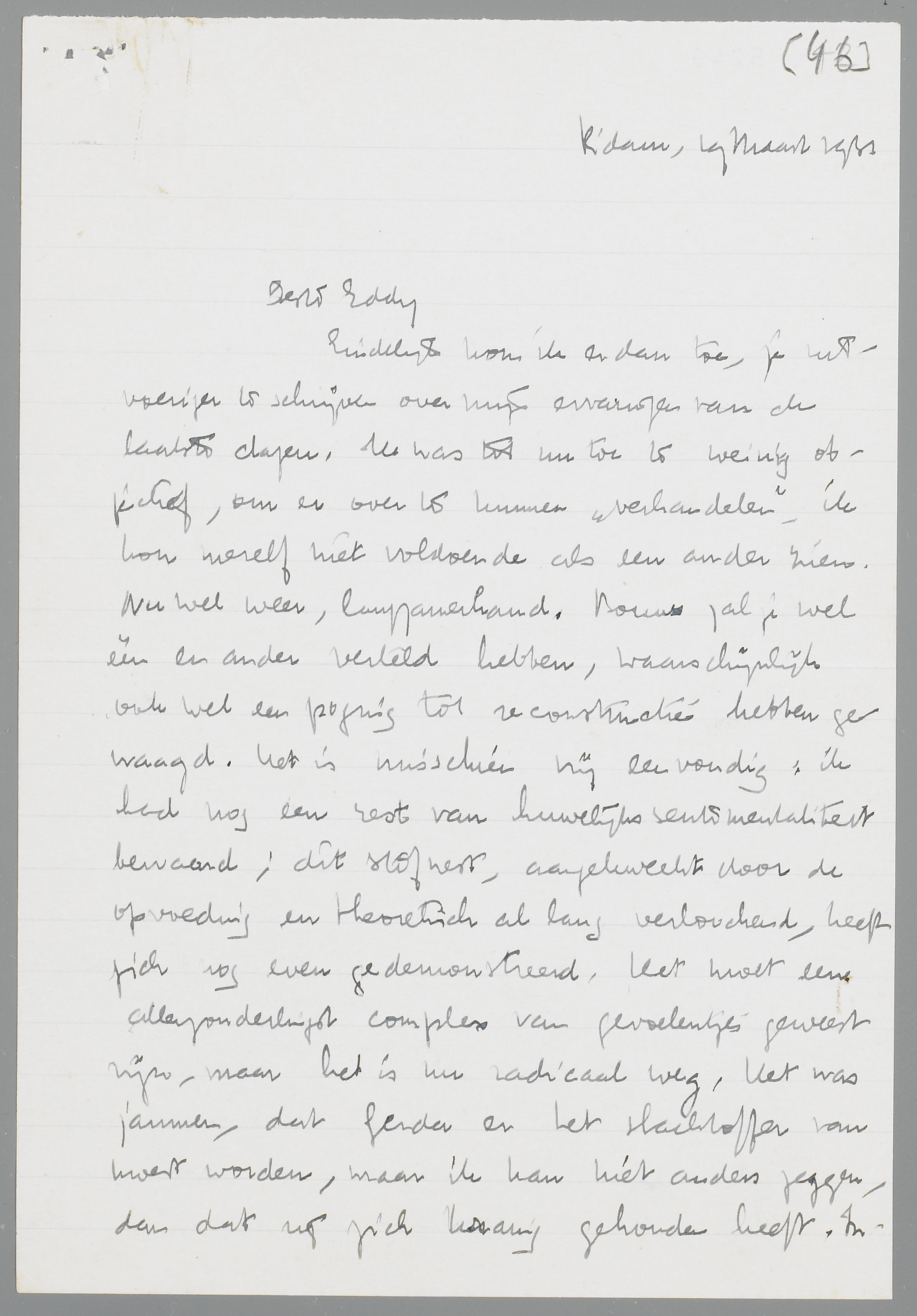 Ik heb E Poi Muori gelezen, gisteren. Ik vind het mislukt. De dooddoener ‘het is geen roman’ zou ik hier toch willen gebruiken; het is geen roman, want de memoires spelen er te duidelijk doorheen, het zijn ook geen memoires, want daarvoor zijn de gefingeerde situaties weer te manifest. Met ‘het is geen roman’ bedoel ik, dat de spanning van het geheel ten eenenmale ontbreekt. Het blijven fragmenten, waaronder buitengewoon goede, maar van een verbindende eenheid is niets te ontdekken. Het is eigenlijk vreemd, dat je de schrijftrant van Een Voorbereiding hier weer opneemt, maar met beslist minder succes! De fouten van Een Voorbereiding zijn hier mammoutisch vergroot, terwijl de levende figuur van Kristiaan verdund is tot den veel minder levenden Godius. Van de familie Weber, die voor mijn gevoel prachtige mogelijkheden biedt, maak je bijna geen gebruik, na het begin! Trouwens, alle figuren blijven te schetsmatig, om den lezer te kunnen vastpakken; het blijven projecties van Reinald, en die projecties zouden in een zuiveren memoirenstijl wel goed zijn, maar in dit halfslachtig verband deugen ze m.i. niet. Het zou onzin zijn, tegenover jou toegeeflijk te zijn en te gaan aanvoeren, dat er zulke goede fragmenten in voorkomen, dat het heele boek intelligent en sympathiek is, want je zult zelf ook met den strengsten maatstaf gemeten willen worden, die van het geheel. Ik mis altijd nog de vaart, die geen enkele bedenking doet opkomen, van je critieken, van de Cahiers, en van het Gebed. Dit is niet je maximale potentie, het is tenslotte een verlitteratuurde du Perron, die de gave mist, buiten zichzelf te treden, en toch een roman schrijft. Dit is m.i. de fout; je was in de stemming voor memoires en trachtte een roman te maken. Daardoor wordt de illusie van een intrige, van een verloop, van een ontwikkeling, telkens doodelijk onderbroken door de dialogen, wordt het geheel zeer onbevredigend.