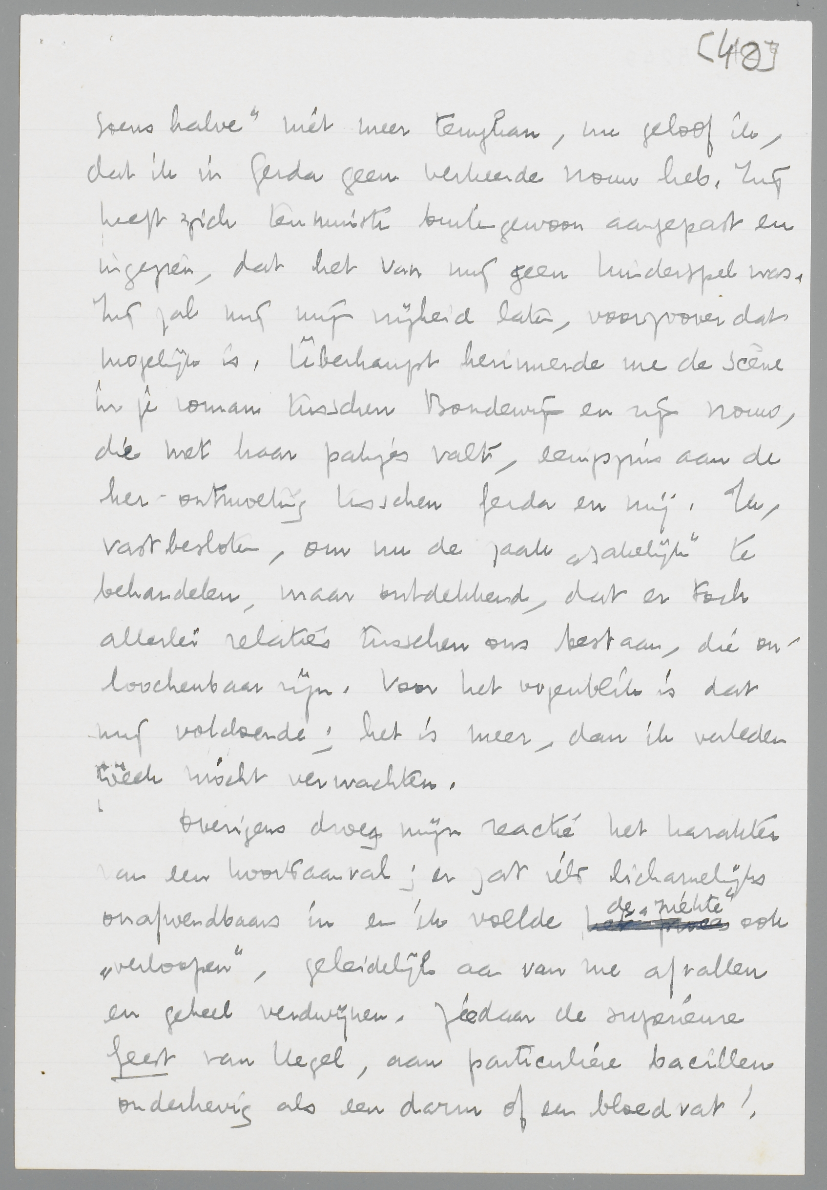 Overigens droeg mijn reactie het karakter van een koortsaanval; er zat iets lichamelijks onafwendbaars in en ik voelde de ‘ziekte’ ook ‘verloopen’, geleidelijk aan van me afvallen en geheel verdwijnen. Ziedaar de superieure Geest van Hegel, aan particuliere bacillen onderhevig als een darm of een bloedvat!