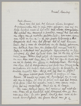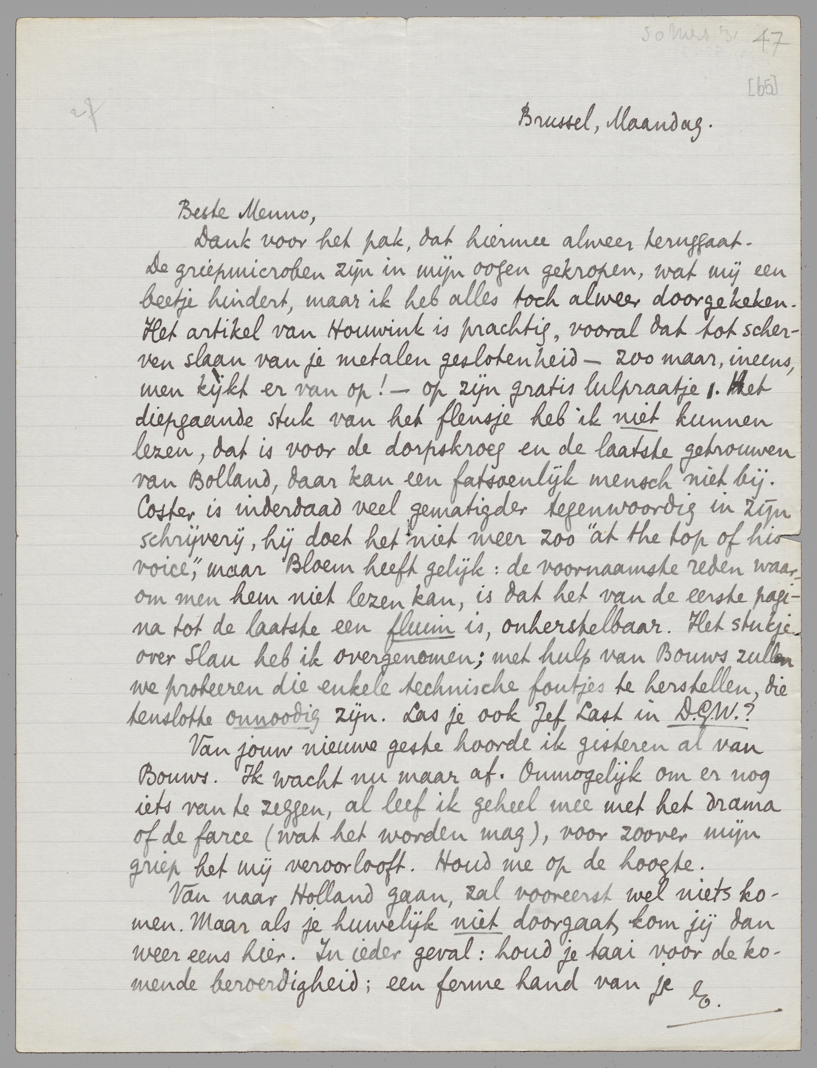 Dank voor het pak, dat hiermee alweer teruggaat. De griepmicroben zijn in mijn oogen gekropen, wat mij een beetje hindert, maar ik heb alles toch alweer doorgekeken. Het artikel van Houwink is prachtig, vooral dat tot scherven slaan van je metalen geslotenheid - zoo maar, ineens, men kijkt ervan op! - op zijn gratis lulpraatje. Het diepgaande stuk van het flensje heb ik niet kunnen lezen, dat is voor de dorpskroeg en de laatste getrouwen van Bolland, daar kan een fatsoenlijk mensch niet bij. Coster is inderdaad veel gematigder tegenwoordig in zijn schrijverij, hij doet het niet meer zoo ‘at the top of his voice’, maar Bloem heeft gelijk: de voornaamste reden waarom men hem niet lezen kan, is dat het van de eerste pagina tot de laatste een fluim is, onherstelbaar. Het stukje over Slau heb ik overgenomen; met hulp van Bouws zullen we probeeren die enkele technische foutjes te herstellen, die tenslotte onnoodig zijn. Las je ook Jef Last in D.G.W.?