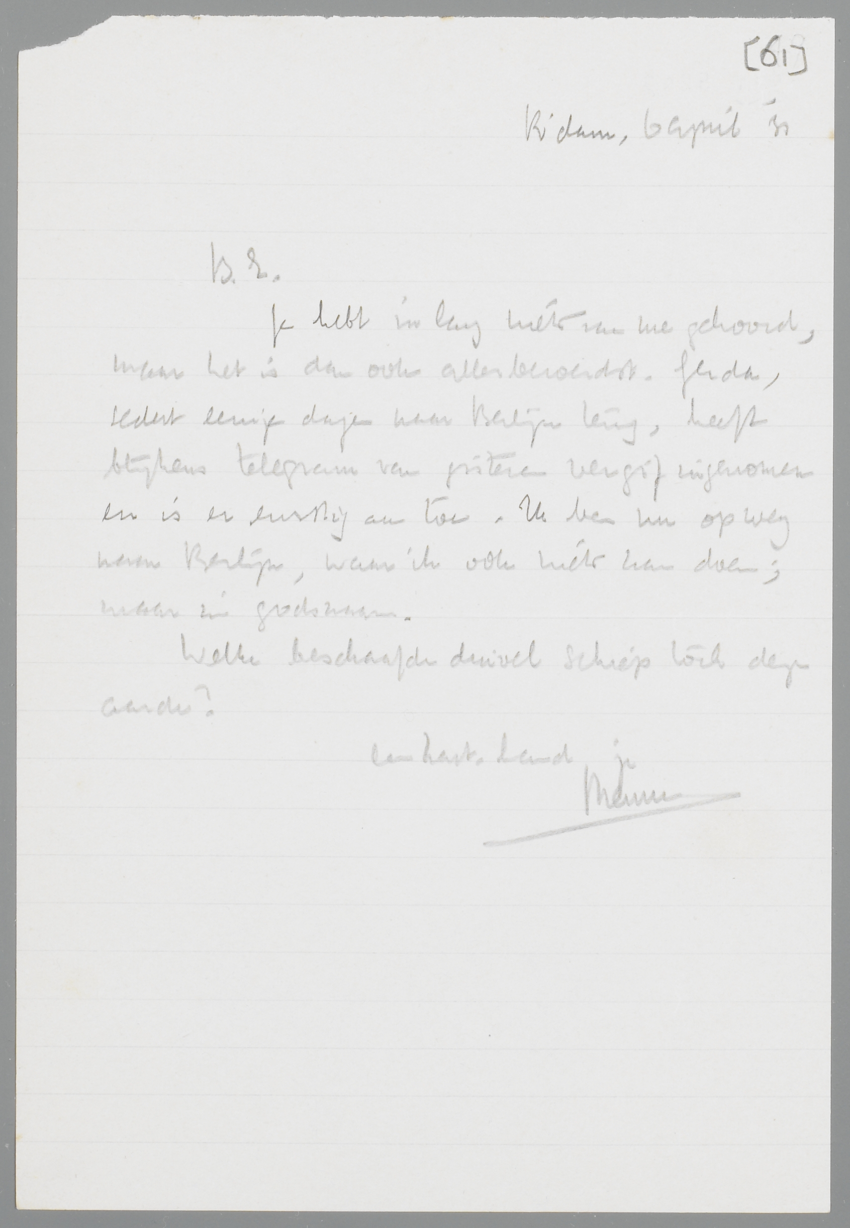 Gerda, sedert eenige dagen naar Berlijn terug, heeft blijkens telegram van gisteren vergif ingenomen en is er ernstig aan toe. Ik ben nu op weg naar Berlijn, waar ik ook niets kan doen; maar in godsnaam.
