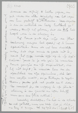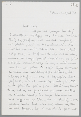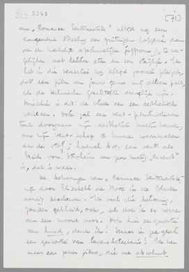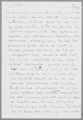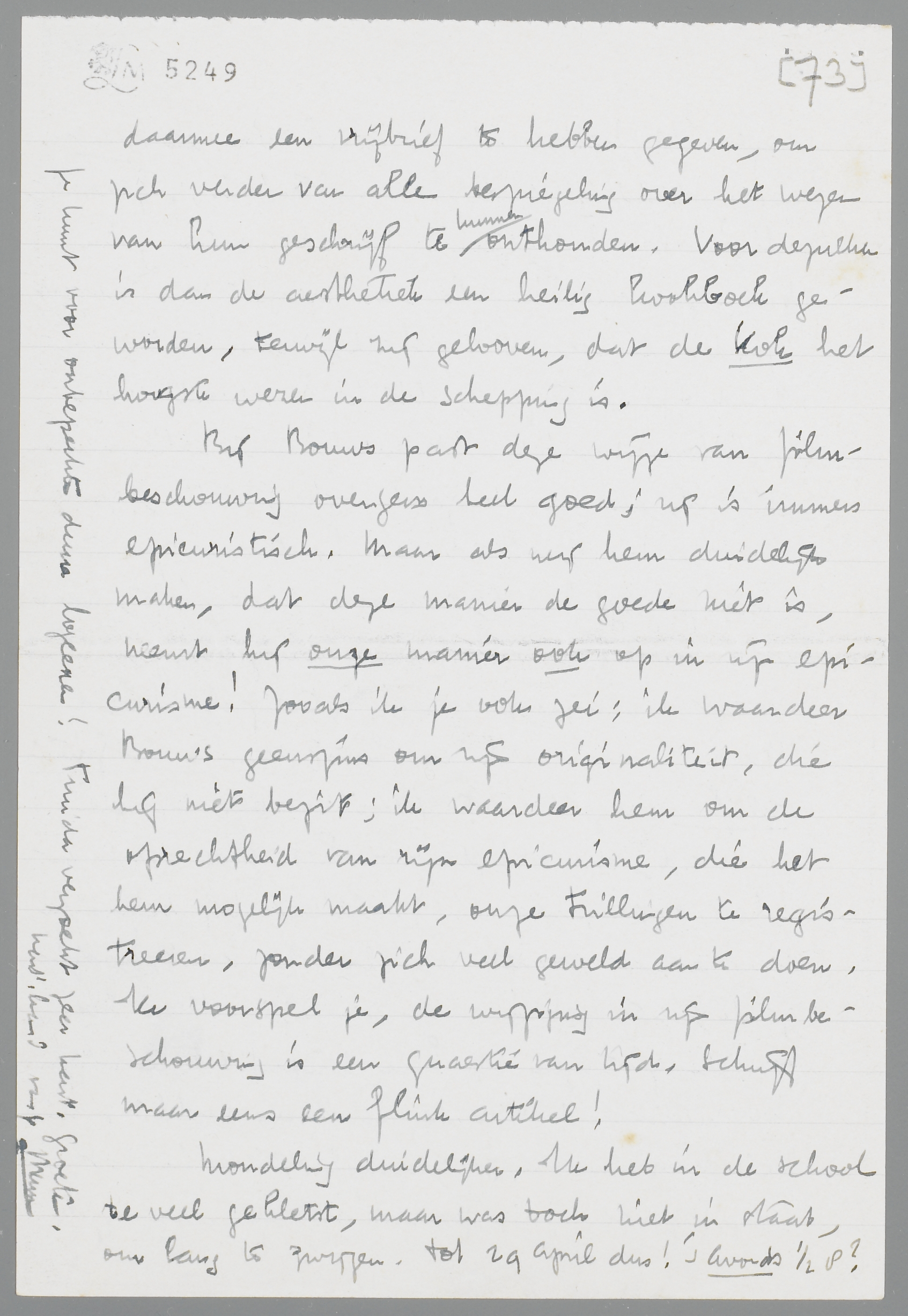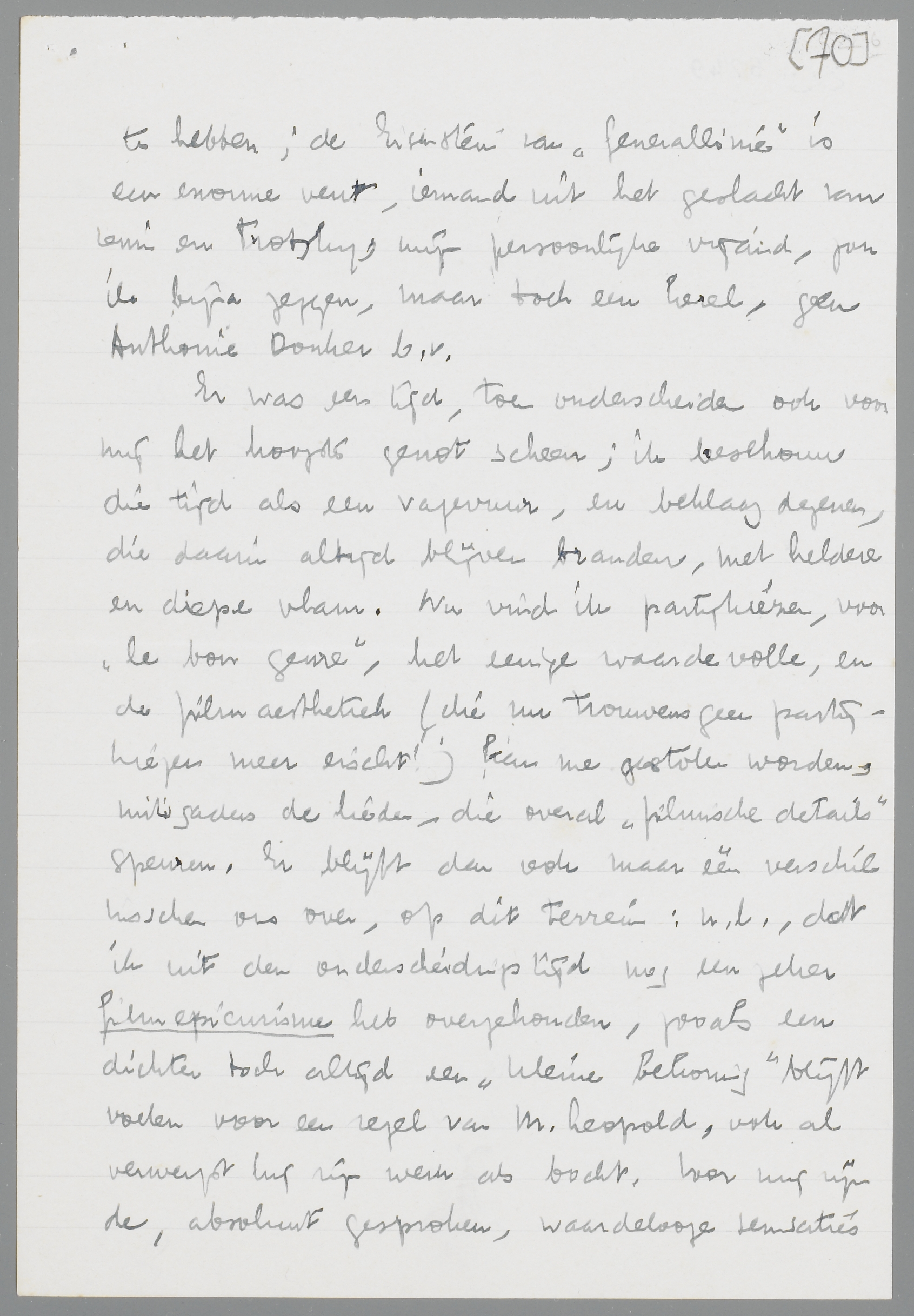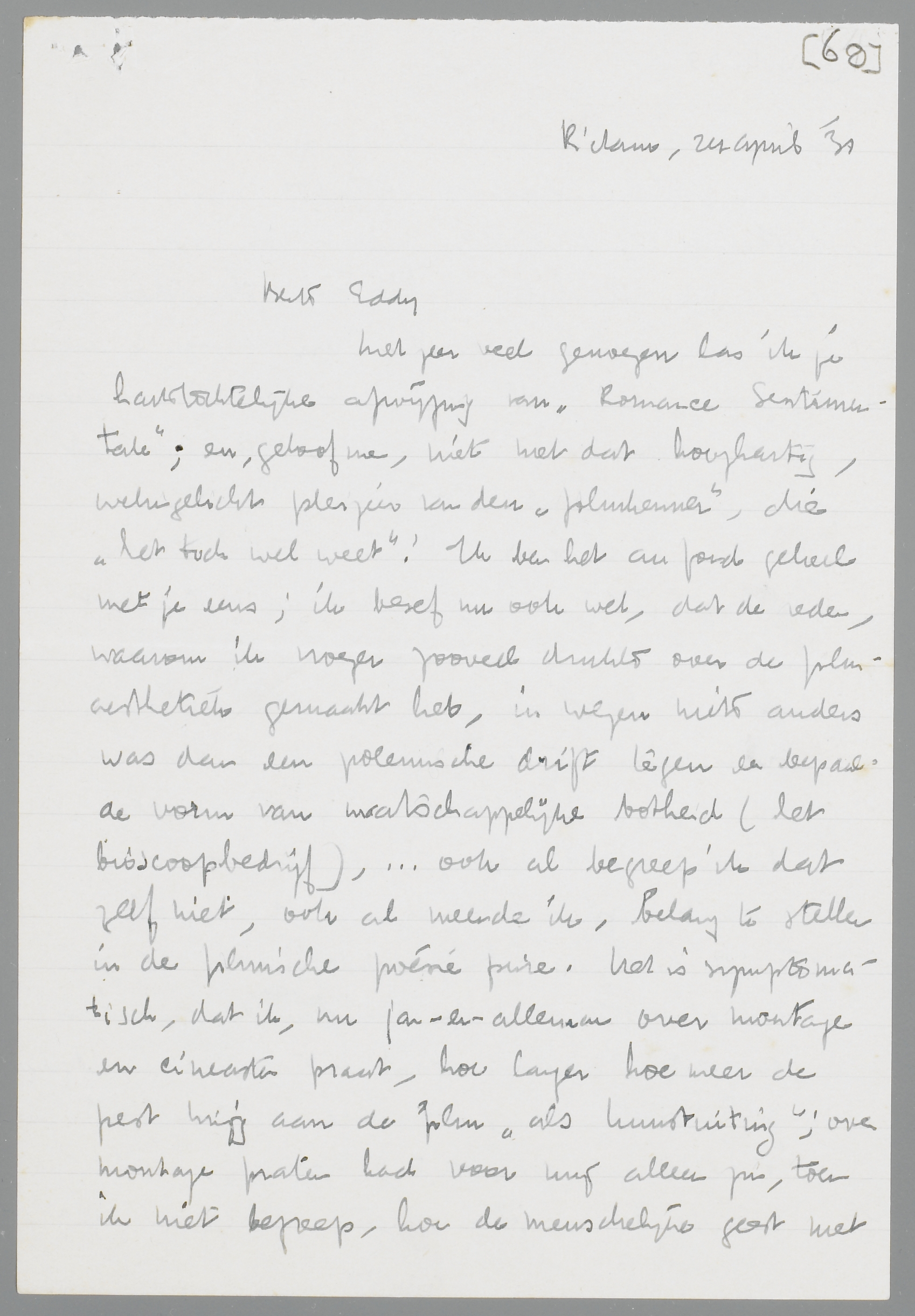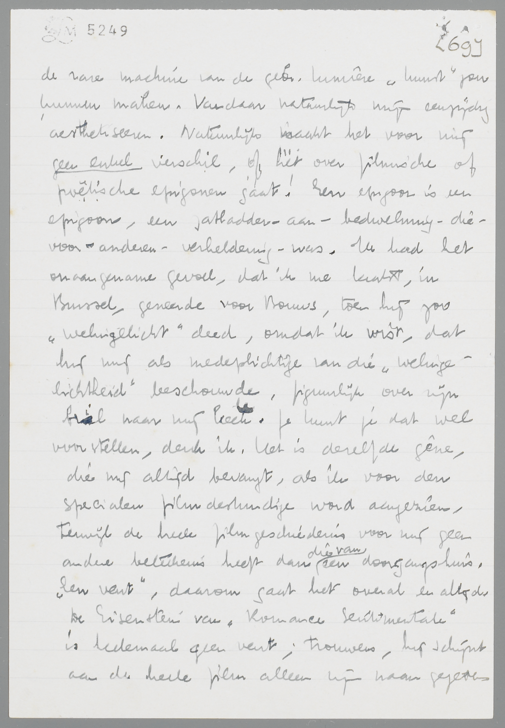 Met zeer veel genoegen las ik je hartstochtelijke afwijzing van Romance Sentimentale; en, geloof me, niet met dat hooghartig, welingelicht pleizier van den ‘filmkenner’, die ‘het toch wel weet’! Ik ben het au fond geheel met je eens; ik besef nu ook wel, dat de reden, waarom ik vroeger zooveel drukte over de filmaesthetiek gemaakt heb, in wezen niets anders was dan een polemische drift tegen een bepaalde vorm van maatschappelijke botheid (het bioscoopbedrijf),... ook al begreep ik dat zelf niet, ook al meende ik, belang te stellen in de filmische poësie pure. Het is symptomatisch, dat ik, nu jan-en-alleman over montage en cineasten praat, hoe langer hoe meer de pest krijg aan de film ‘als kunstuiting’; over montage praten had voor mij alleen zin, toen ik niet begreep, hoe de menschelijke geest met de rare machine van de gebr. Lumière ‘kunst’ zou kunnen maken. Vandaar natuurlijk mijn eenzijdig aesthetiseeren. Natuurlijk maakt het voor mij geen enkel verschil, of het over filmische of poëtische epigonen gaat! Een epigoon is een epigoon, een zatladder-aan-bedwelming-die-voor-anderen-verheldering-was. Ik had het onaangename gevoel, dat ik me laatst, in Brussel, geneerde voor Bouws, toen hij zoo ‘welingelicht’ deed, omdat ik wist, dat hij mij als medeplichtige van die ‘welingelichtheid’ beschouwde, figuurlijk over zijn bril naar mij keek. Je kunt je dat wel voorstellen, denk ik. Het is dezelfde gêne, die mij altijd bevangt, als ik voor den specialen filmdeskundige word aangezien, terwijl de heele filmgeschiedenis voor mij geen andere beteekenis heeft dan die van een doorgangshuis. ‘Een vent’, daarom gaat het overal en altijd. De Eisenstein van Romance Sentimentale is heelemaal geen vent; trouwens, hij schijnt aan de heele film alleen zijn naam gegeven te hebben; de Eisenstein van Generallinie is een enorme vent, iemand uit het geslacht van Lenin en Trotsky, mijn persoonlijke vijand, zou ik bijna zeggen, maar toch een kerel, geen Anthonie Donker b.v.