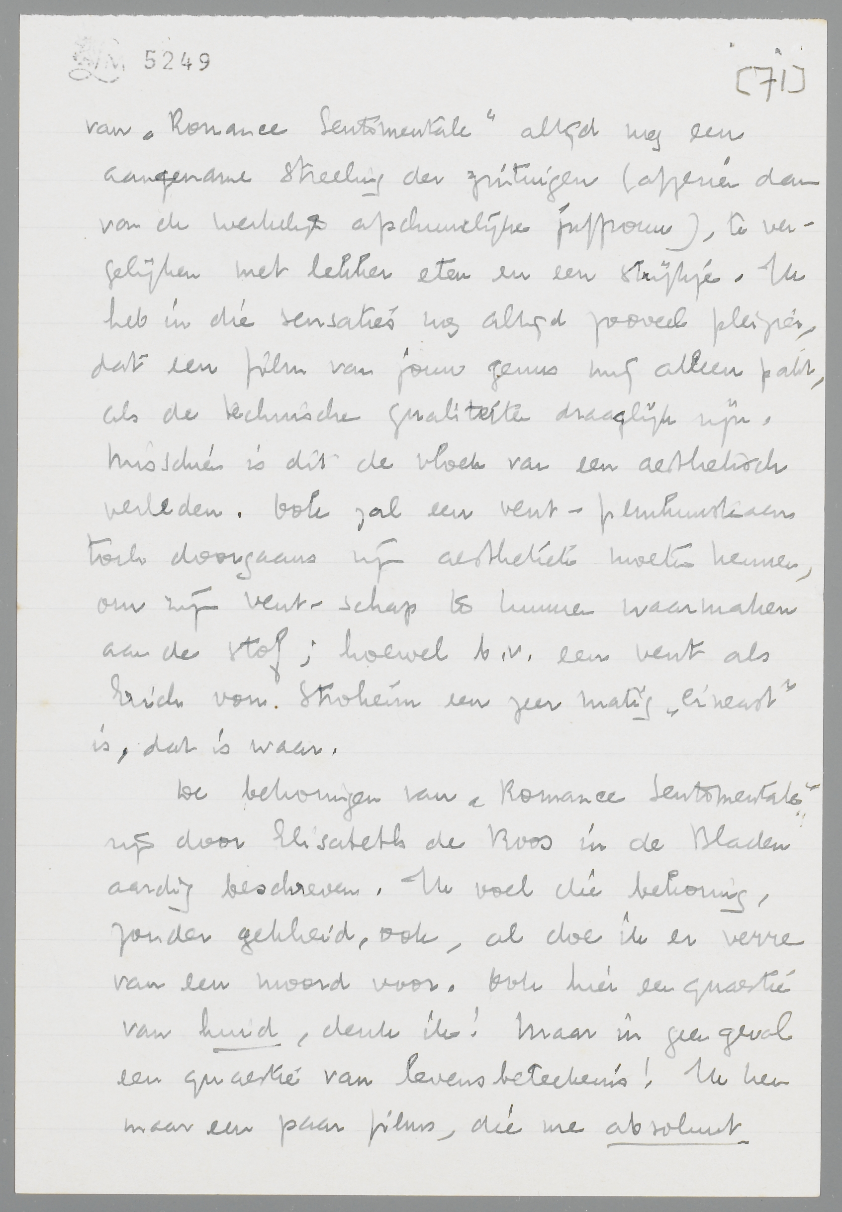Er was een tijd, toen onderscheiden ook voor mij het hoogste genot scheen; ik beschouw die tijd als een vagevuur, en beklaag degenen, die daarin altijd blijven branden, met heldere en diepe vlam. Nu vind ik partijkiezen, voor ‘le bon genre’, het eenige waardevolle, en de filmaesthetiek (die nu trouwens geen partijkiezen meer eischt!) kan me gestolen worden, mitsgaders de lieden, die overal ‘filmische details’ speuren. Er blijft dan ook maar één verschil tusschen ons over, op dit terrein: n.l., dat ik uit den onderscheidingstijd nog een zeker filmepicurisme heb overgehouden, zooals een dichter toch altijd een ‘kleine bekoring’ blijft voelen voor een regel van M. Leopold, ook al verwerpt hij zijn werk als bocht. Voor mij zijn de, absoluut gesproken, waardelooze sensaties van Romance Sentimentale altijd nog een aangename streeling der zintuigen (afgezien dan van de werkelijk afschuwelijke juffrouw), te vergelijken met lekker eten en een strijkje. Ik heb in die sensaties nog altijd zooveel pleizier, dat een film van jouw genus mij alleen pakt, als de technische qualiteiten draaglijk zijn. Misschien is dit de vloek van een aesthetisch verleden. Ook zal een vent-filmkunstenaar toch doorgaans zijn aesthetiek moeten kennen, om zijn ventschap te kunnen waarmaken aan de stof; hoewel b.v. een vent als Erich von Stroheim een zeer matig ‘cineast’ is, dat is waar.