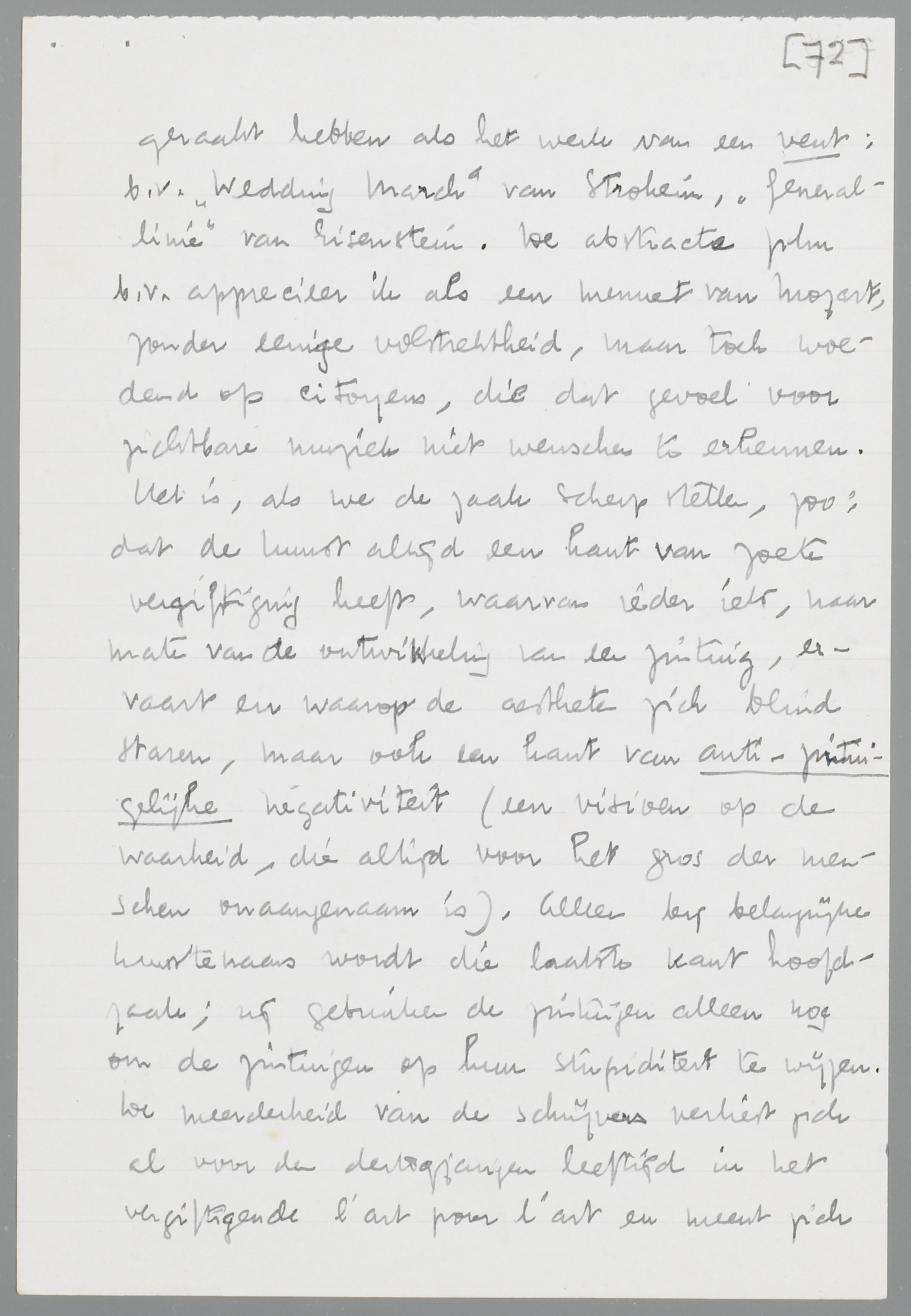De bekoringen van Romance Sentimentale zijn door Elisabeth de Roos in de Bladen aardig beschreven. Ik voel die bekoring, zonder gekheid, ook, al doe ik er verre van een moord voor. Ook hier een quaestie van huid, denk ik! Maar in geen geval een quaestie van levensbeteekenis! Ik ken maar een paar films, die me absoluut geraakt hebben als het werk van een vent: b.v. Wedding March van Stroheim, Generallinie van Eisenstein. De abstracte film b.v. apprecieer ik als een menuet van Mozart, zonder eenige volstrektheid, maar toch woedend op citoyens, die dat gevoel voor zichtbare muziek niet wenschen te erkennen. Het is, als we de zaak scherp stellen, zoo: dat de kunst altijd een kant van zoete vergiftiging heeft, waarvan ieder iets, naar mate van de ontwikkeling van een zintuig, ervaart en waarop de aestheten zich blind staren, maar ook een kant van anti-zintuigelijke negativiteit (een visioen op de waarheid, die altijd voor het gros der menschen onaangenaam is). Alleen bij belangrijke kunstenaars wordt die laatste kant hoofdzaak; zij gebruiken de zintuigen alleen nog om de zintuigen op hun stupiditeit te wijzen. De meerderheid van de schrijvers verliest zich al voor den dertigjarigen leeftijd in het vergiftigde l'art pour l'art en meent zich daarmee een vrijbrief te hebben gegeven, om zich verder van alle bespiegeling over het wezen van hun geschrijf te kunnen onthouden. Voor dezulken is dan de aesthetiek een heilig kookboek geworden, terwijl zij gelooven, dat de kok het hoogste wezen in de schepping is.