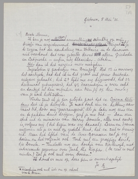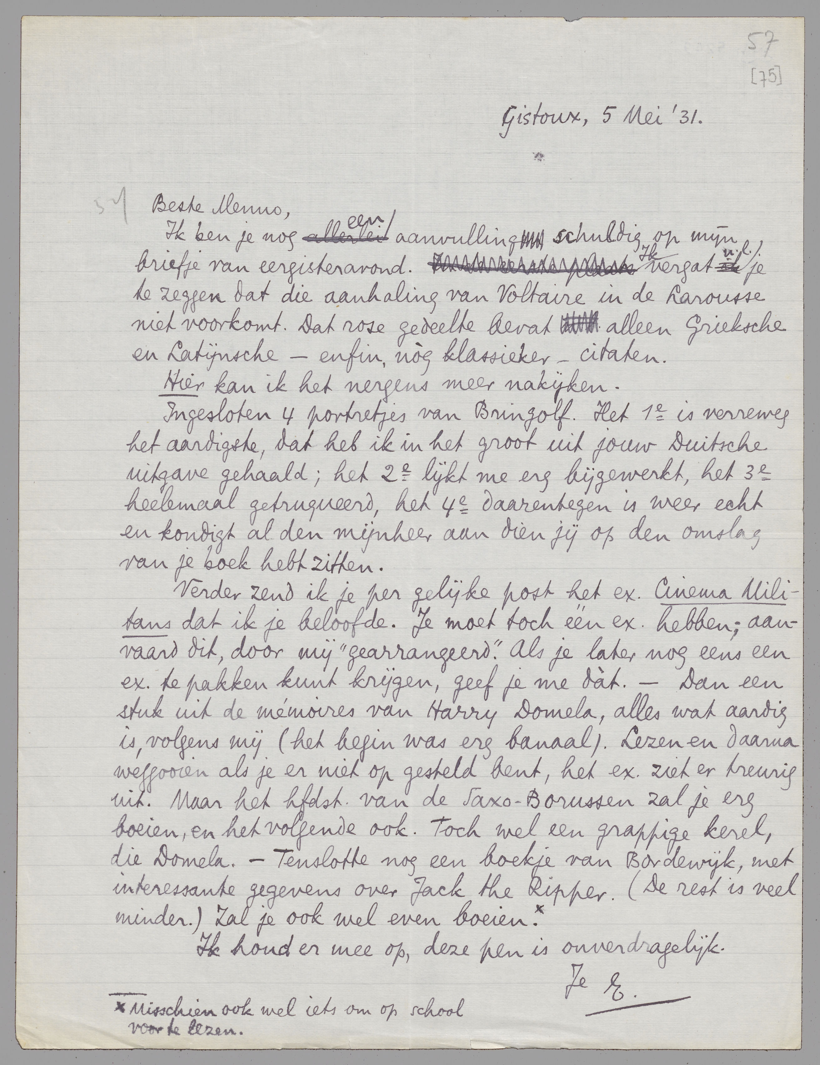 Verder zend ik je per gelijke post het ex. Cinema Militans dat ik je beloofde. Je moet toch één ex. hebben; aanvaard dit, door mij ‘gearrangeerd’. Als je later nog eens een ex. te pakken kunt krijgen, geef je me dàt. - Dan een stuk uit de mémoires van Harry Domela, alles wat aardig is, volgens mij (het begin was erg banaal). Lezen en daarna weggooien als je er niet op gesteld bent, het ex. ziet er treurig uit. Maar het hfdst. van de Saxo-Borussen zal je erg boeien, en het volgende ook. Toch wel een grappige kerel, die Domela. - Tenslotte nog een boekje van Bordewijk, met interessante gegevens over Jack the Ripper. (De rest is veel minder.) Zal je ook wel even boeien. Misschien ook wel iets om op school voor te lezen.