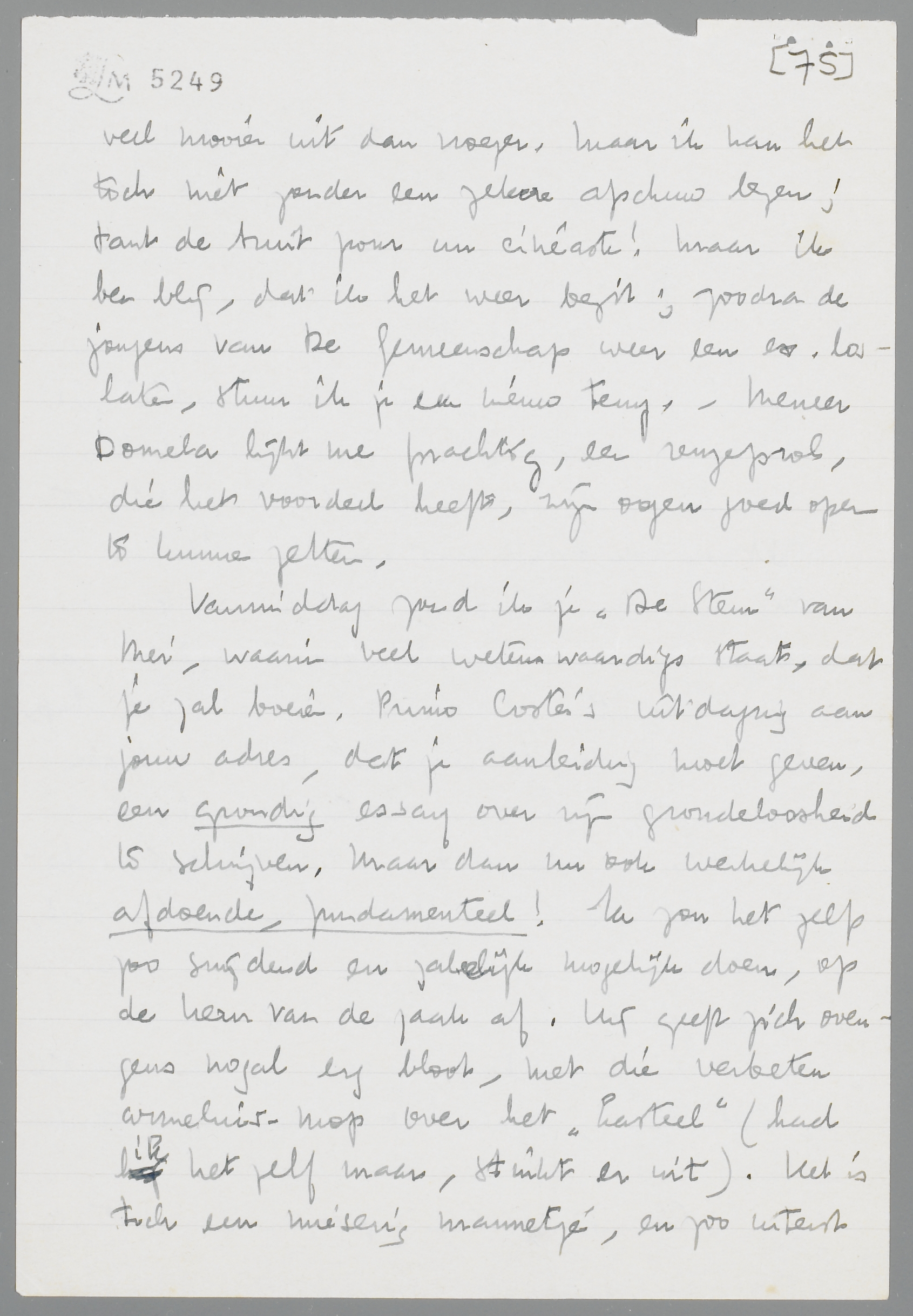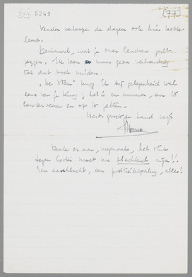 Cinema Militans ziet er in dit costuum veel mooier uit dan vroeger. Maar ik kan het toch niet zonder een zekere afschuw lezen; tant de bruit pour un cinéaste! Maar ik ben blij, dat ik het weer bezit; zoodra de jongens van De Gemeenschap weer een ex. loslaten, stuur ik je een nieuw terug. - Meneer Domela lijkt me prachtig, een reuzeprol, die het voordeel heeft, zijn oogen goed open te kunnen zetten.