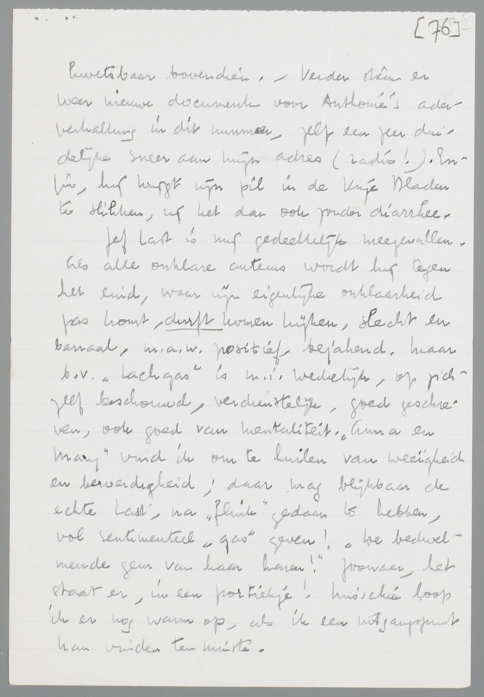 Jef Last is mij gedeeltelijk meegevallen. Als alle onklare auteurs wordt hij tegen het eind, waar zijn eigenlijke onklaarheid pas komt, durft komen kijken, slecht en banaal, m.a.w. positief, bejahend. Maar b.v. Lachgas is m.i. werkelijk, op zichzelf beschouwd, verdienstelijk, goed geschreven, ook goed van mentaliteit. Anna en Mary vind ik om te huilen van weeïgheid en beroerdigheid; daar mag blijkbaar de echte Last, na ‘flink’ gedaan te hebben, vol sentimenteel ‘gas’ geven! ‘De bedwelmende geur van haar haren!’ Zoowaar, het staat er, in een portiekje! Misschien loop ik er nog warm op, als ik een uitgangspunt kan vinden ten minste.