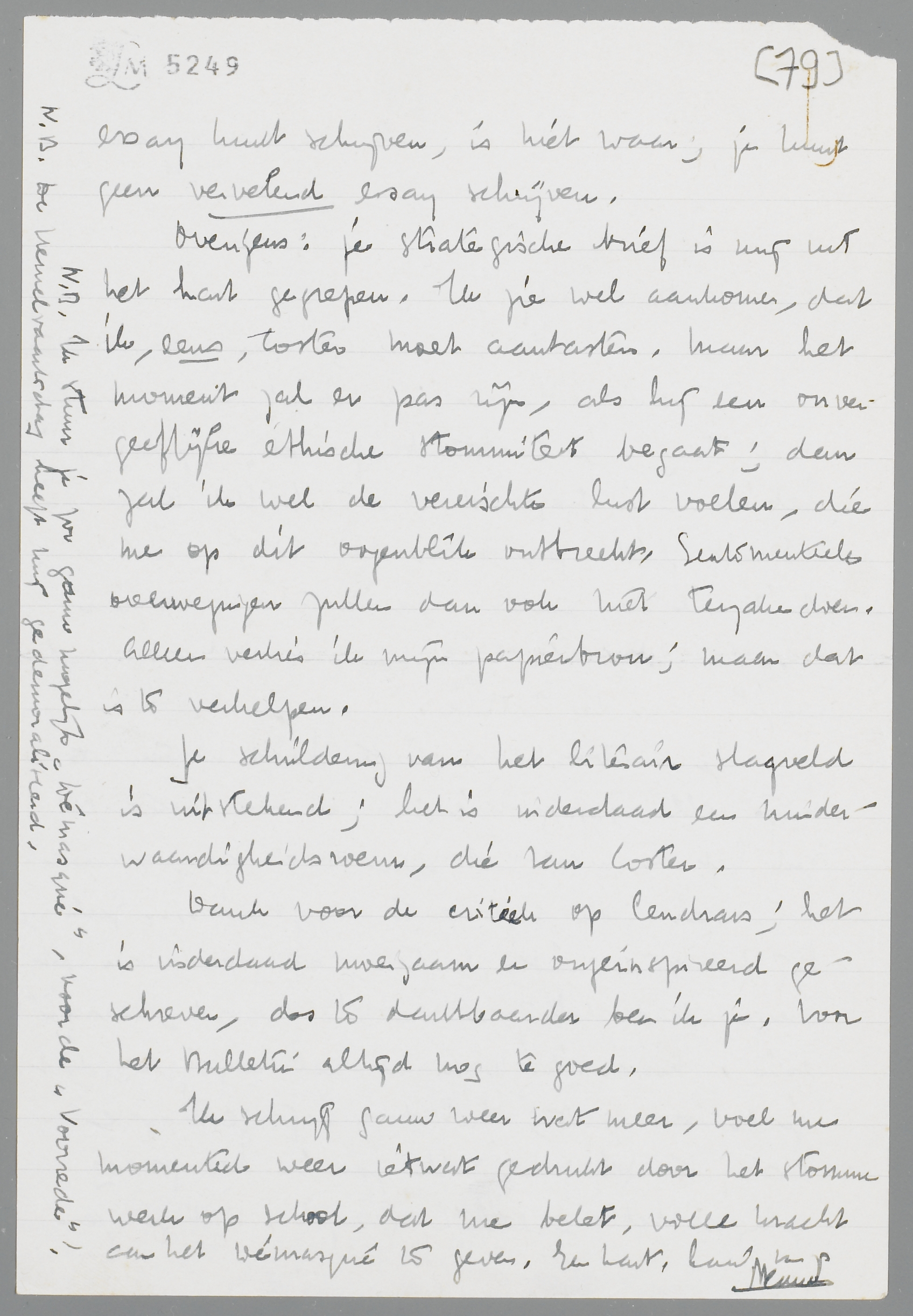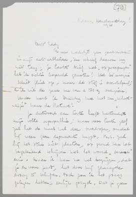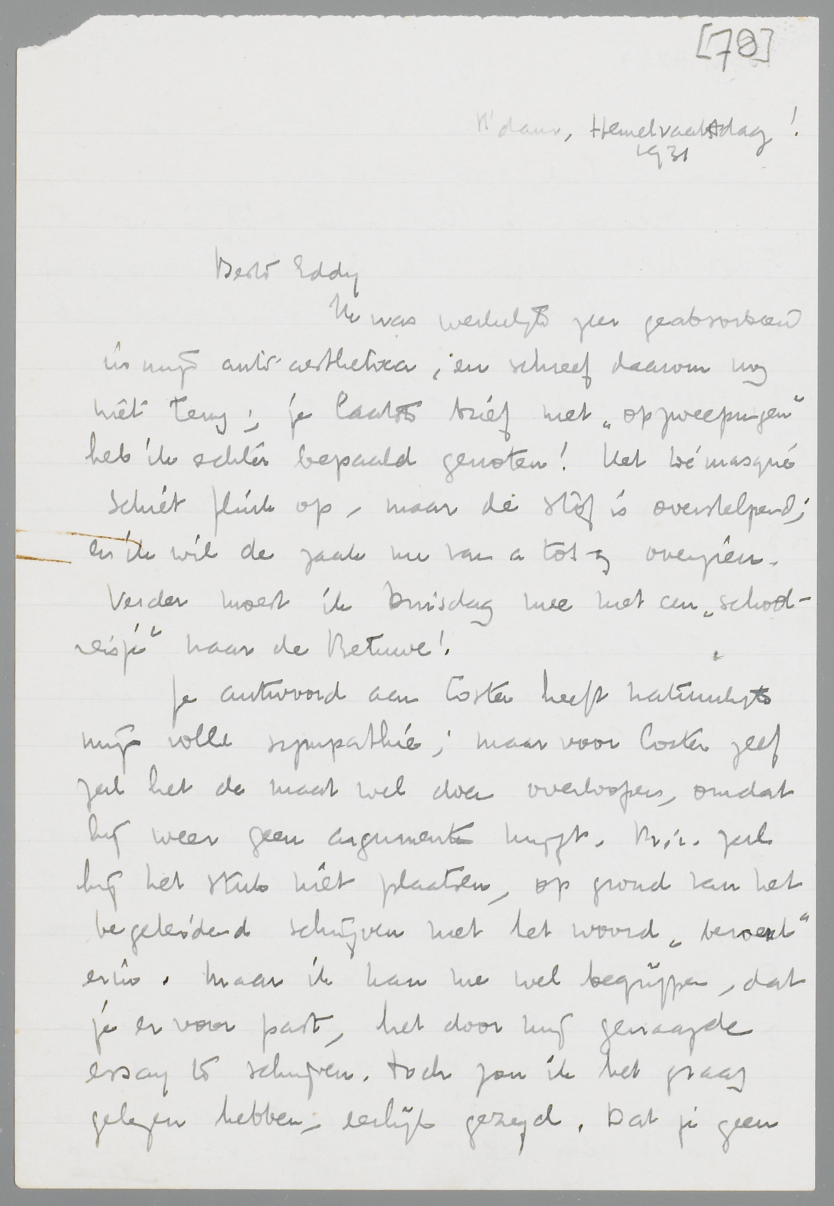 Ik was werkelijk zeer geabsorbeerd in mijn antiaesthetica, en schreef daarom nog niet terug; je laatste brief met ‘opzweepingen’ heb ik echter bepaald genoten! Het Démasqué schiet flink op, maar de stof is overstelpend; en ik wil de zaak nu van a tot z overzien. Verder moest ik Dinsdag mee met een ‘schoolreisje’ naar de Betuwe!