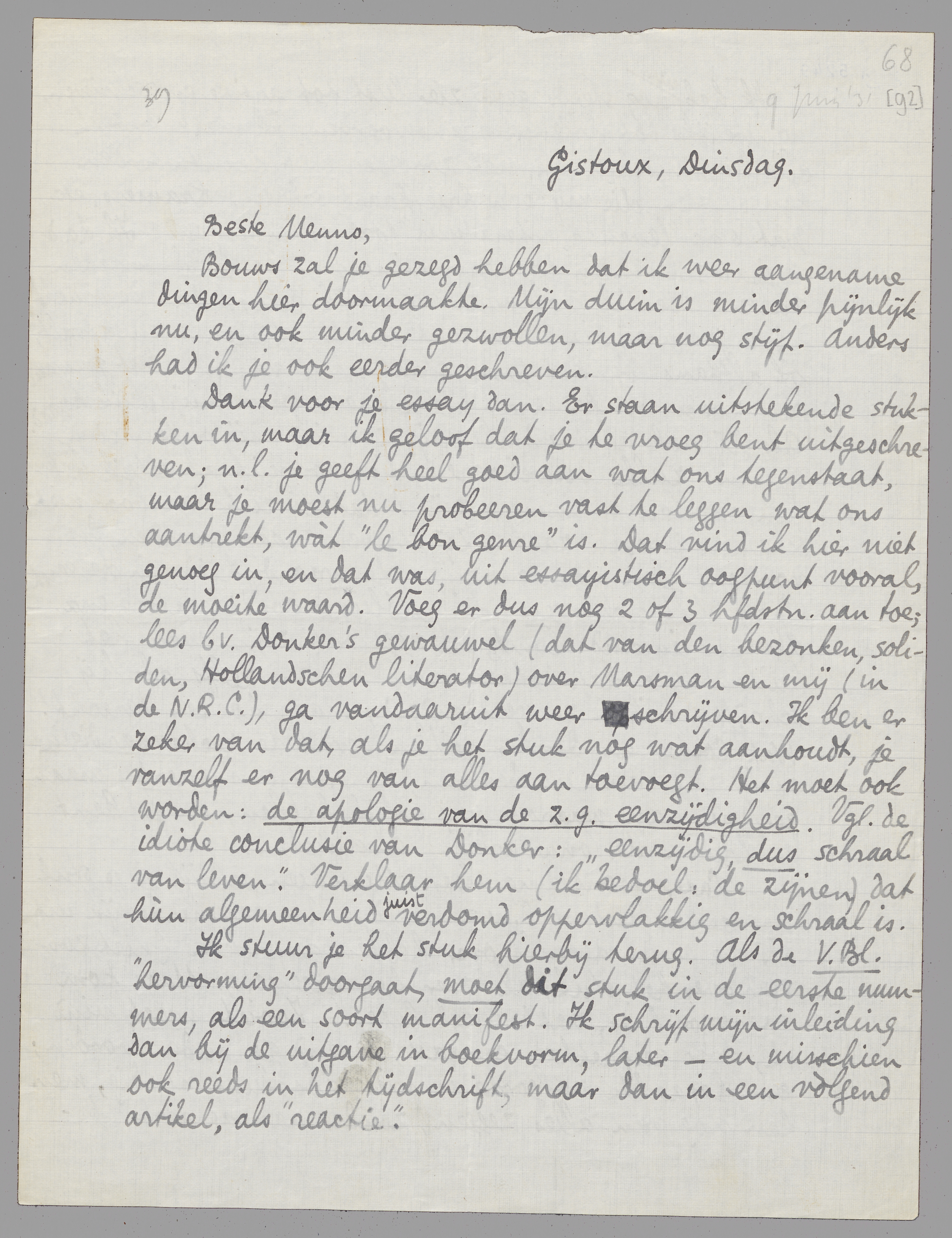 Dank voor je essay dan. Er staan uitstekende stukken in, maar ik geloof dat je te vroeg bent uitgeschreven; n.l. je geeft heel goed aan wat ons tegenstaat, maar je moest nu probeeren vast te leggen wat ons aantrekt, wàt ‘le bon genre’ is. Dat vind ik hier niet genoeg in, en dat was, uit essayistisch oogpunt vooral, de moeite waard. Voeg er dus nog 2 of 3 hfdstn. aan toe; lees bv. Donker's gewauwel (dat van den bezonken, soliden, Hollandschen literator) over Marsman en mij (in de N.R.C.), ga vandaaruit weer schrijven. Ik ben er zeker van dat, als je het stuk nog wat aanhoudt, je vanzelf er nog van alles aan toevoegt. Het moet ook worden de apologie van de z.g eenzijdigheid. Vgl. de idiote conclusie van Donker: ‘eenzijdig, dus schraal van leven’. Verklaar hem (ik bedoel: de zijnen) dat hùn algemeenheid juist verdomd oppervlakkig en schraal is.