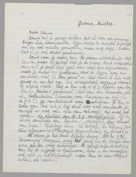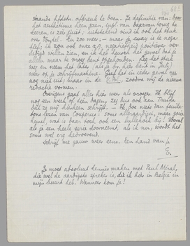 Overigens gaat alles hier weer als vroeger. Ik blijf nog een week of tien dagen, zeg dus ook aan Truida dat ze mij hierheen schrijft. - Ik doe niets dan feuilletons lezen van Couperus: soms alleraardigst, maar goeie hemel, wat is daar toch ook een lullekoek bij! Vooral als je een heele serie doorneemt, als ik nu, wordt het soms wel erg bedroevend. Schrijf me gauw weer eens. Een hand van je