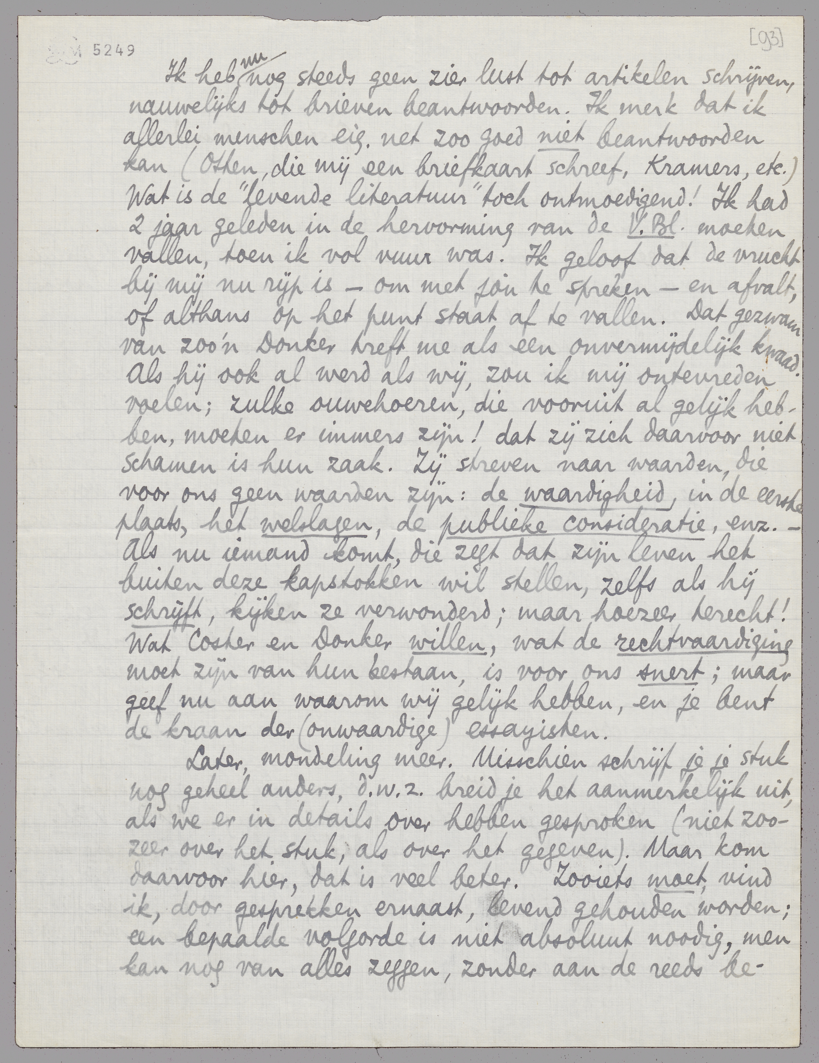 Ik heb nu nog steeds geen zier lust tot artikelen schrijven, nauwelijks tot brieven beantwoorden. Ik merk dat ik allerlei menschen eig. net zoo goed niet beantwoorden kan (Otten, die mij een briefkaart schreef, Kramers, etc.) Wat is de ‘levende literatuur’ toch ontmoedigend! Ik had 2 jaar geleden in de hervorming van de V.Bl. moeten vallen, toen ik vol vuur was. Ik geloof dat de vrucht bij mij nu rijp is - om met jou te spreken - en afvalt, of althans op het punt staat af te vallen. Dat gezwam van zoo'n Donker treft me als een onvermijdelijk kwaad. Als hij ook al werd als wij, zou ik mij ontevreden voelen; zulke ouwehoeren, die vooruit al gelijk hebben, moeten er immers zijn! dat zij zich daarvoor niet schamen is hun zaak. Zij streven naar waarden, die voor ons geen waarden zijn: de waardigheid, in de eerste plaats, het welslagen, de publieke consideratie, enz. - Als nu iemand komt, die zegt dat zijn leven het buiten deze kapstokken wil stellen, zelfs als hij schrijft, kijken ze verwonderd; maar hoezeer terecht! Wat Coster en Donker willen, wat de rechtvaardiging moet zijn van hun bestaan, is voor ons snert; maar geef nu aan waarom wij gelijk hebben, en je bent de kraan der (onwaardige) essayisten.