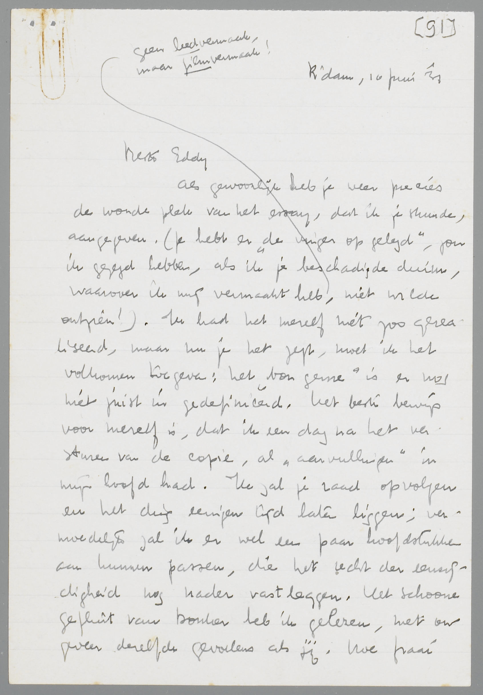 Als gewoonlijk heb je weer precies de wonde plek van het essay, dat ik je stuurde, aangegeven. (Je hebt er ‘de vinger op gelegd’, zou ik gezegd hebben, als ik je beschadigde duim, waarover ik mij vermaakt heb, geen leedvermaak maar filmvermaak! niet wilde ontzien!) Ik had het mezelf niet zoo gerealiseerd, maar nu je het zegt, moet ik het volkomen toegeven: het ‘bon genre’ is er nog niet juist in gedefinieerd. Het beste bewijs voor mezelf is, dat ik een dag na het versturen van de copie, al ‘aanvullingen’ in mijn hoofd had. Ik zal je raad opvolgen en het ding eenigen tijd laten liggen; vermoedelijk zal ik er wel een paar hoofdstukken aan kunnen passen, die het recht der eenzijdigheid nog nader vastleggen. Het schoone gefluit van Donker heb ik gelezen, met ongeveer dezelfde gevoelens als jij. Hoe fraai weet toch die man zich uit te drukken en hoe schitterend danst hij tusschen de eieren der critische objecten door! Ik kon niet nalaten hem nogmaals een brief te schrijven, ook om hem zijn belachelijke ‘antwoord’ even te verwijten; het helpt weliswaar niet, maar hij mag dan toch nog wel eens iets hooren, dat hem misschien één moment onaangenaam is.