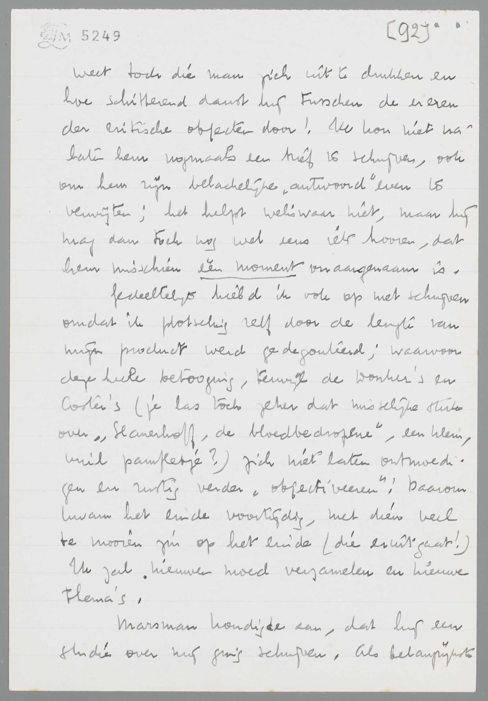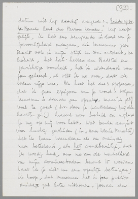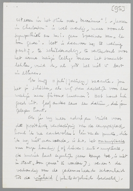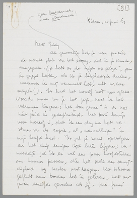 Gedeeltelijk hield ik ook op met schrijven omdat ik plotseling zelf door de lengte van mijn product werd gedegouteerd; waarvoor deze heele betooging, terwijl de Donker's en Coster's (je las toch zeker dat misselijke stuk over ‘Slauerhoff, de bloedbedropene’, een klein, vuil pamfletje?) zich niet laten ontmoedigen en rustig verder ‘objectiveeren’!) Daarom kwam het einde voortijdig, met dien veel te mooien zin op het einde (die er uit gaat!) Ik zal nieuwen moed verzamelen en nieuwe thema's.