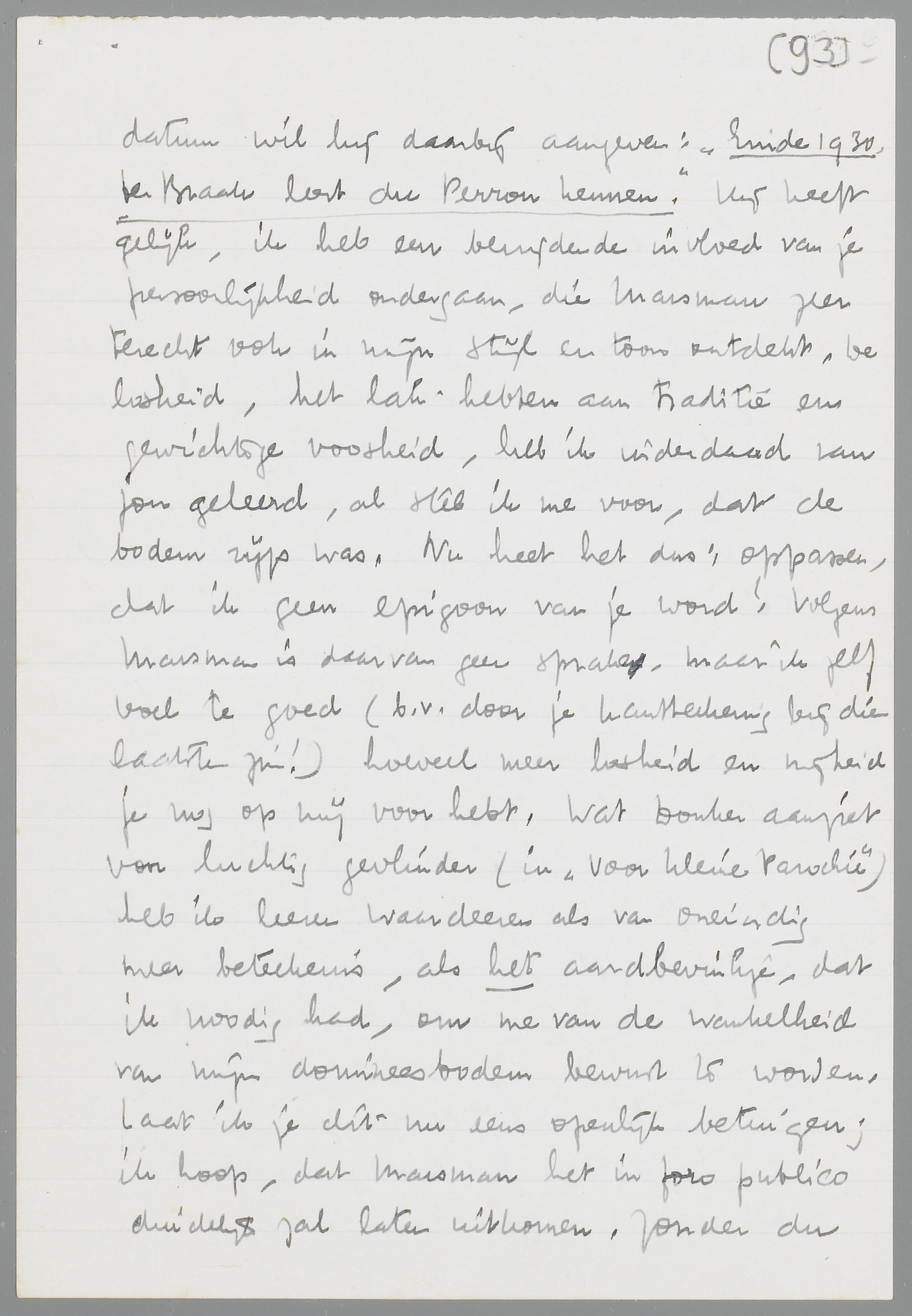 Marsman kondigde aan, dat hij een studie over mij ging schrijven. Als belangrijkste datum wil hij daarbij aangeven: ‘Einde 1930. ter Braak leert du Perron kennen’. Hij heeft gelijk, ik heb een bevrijdende invloed van je persoonlijkheid ondergaan, die Marsman zeer terecht ook in mijn stijl en toon ontdekt. De losheid, het lak-hebben aan traditie en gewichtige voosheid, heb ik inderdaad van jou geleerd, al stel ik me voor, dat de bodem rijp was. Nu heet het dus: oppassen, dat ik geen epigoon van je word! Volgens Marsman is daarvan geen sprake, maar ik zelf voel te goed (b.v. door je kantteekening bij die laatste zin!) hoeveel meer losheid en vrijheid je nog op mij voor hebt. Wat Donker aanziet voor luchtig gevlinder (in Voor kleine Parochie) heb ik leeren waardeeren als van oneindig meer beteekenis, als het aardbevinkje, dat ik noodig had, om me van de wankelheid van mijn domineesbodem bewust te worden. Laat ik je dit nu eens openlijk betuigen; ik hoop, dat Marsman het in foro publico duidelijk zal laten uitkomen. Zonder du Perron, zegt Marsman terecht, had ter Braak niet over de ‘gravité’ kunnen schrijven, zooals hij het deed. -