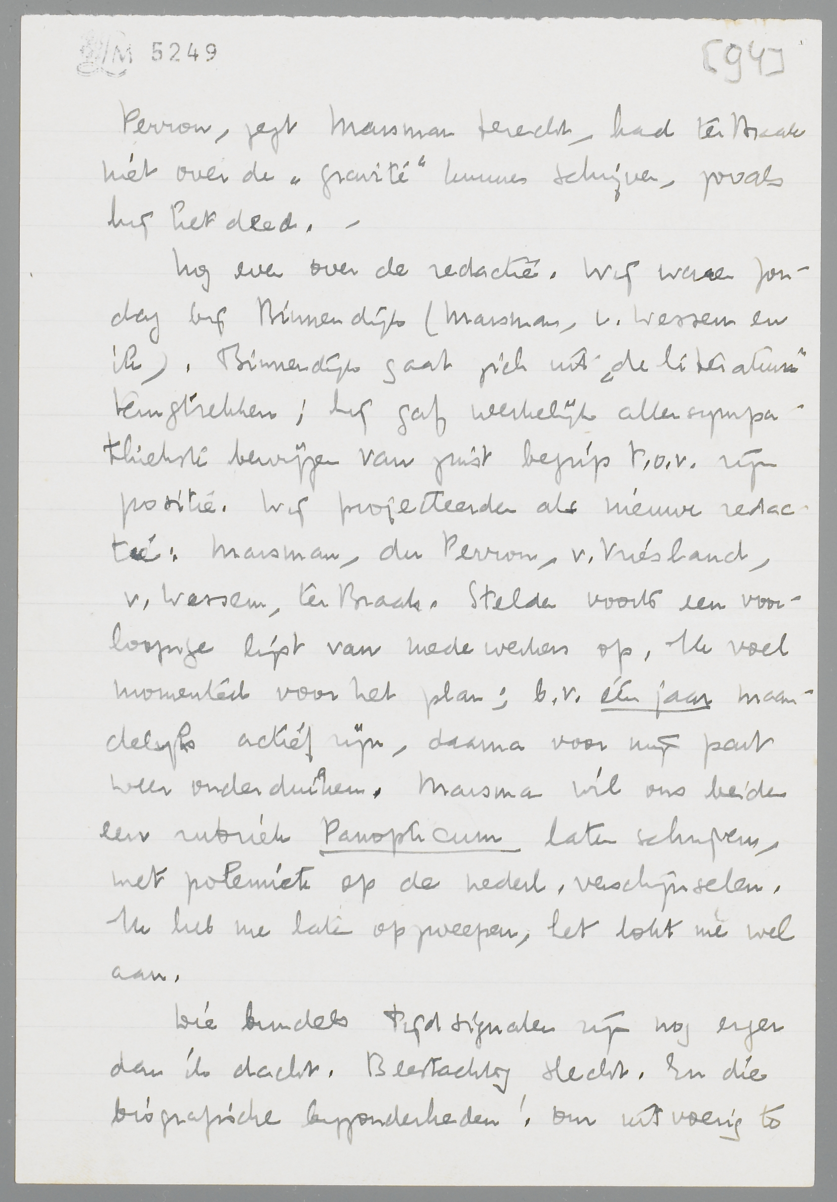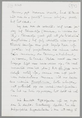 Nog even over de redactie. Wij waren Zondag bij Binnendijk (Marsman, v. Wessem en ik). Binnendijk gaat zich uit ‘de literatuur’ terugtrekken; hij gaf werkelijk allersympathiekste bewijzen van juist begrip t.o.v. zijn positie. Wij projecteerden als nieuwe redactie: Marsman, du Perron, v. Vriesland, v. Wessem, ter Braak. Stelden voorts een voorloopige lijst van medewerkers op. Ik voel momenteel voor het plan; b.v. één jaar maandelijks actief zijn, daarna voor mijn part weer onderduiken. Marsman wil ons beiden een rubriek Panopticum laten schrijven, met polemiek op de nederl. verschijnselen. Ik heb me laten opzweepen, het lokt me wel aan.