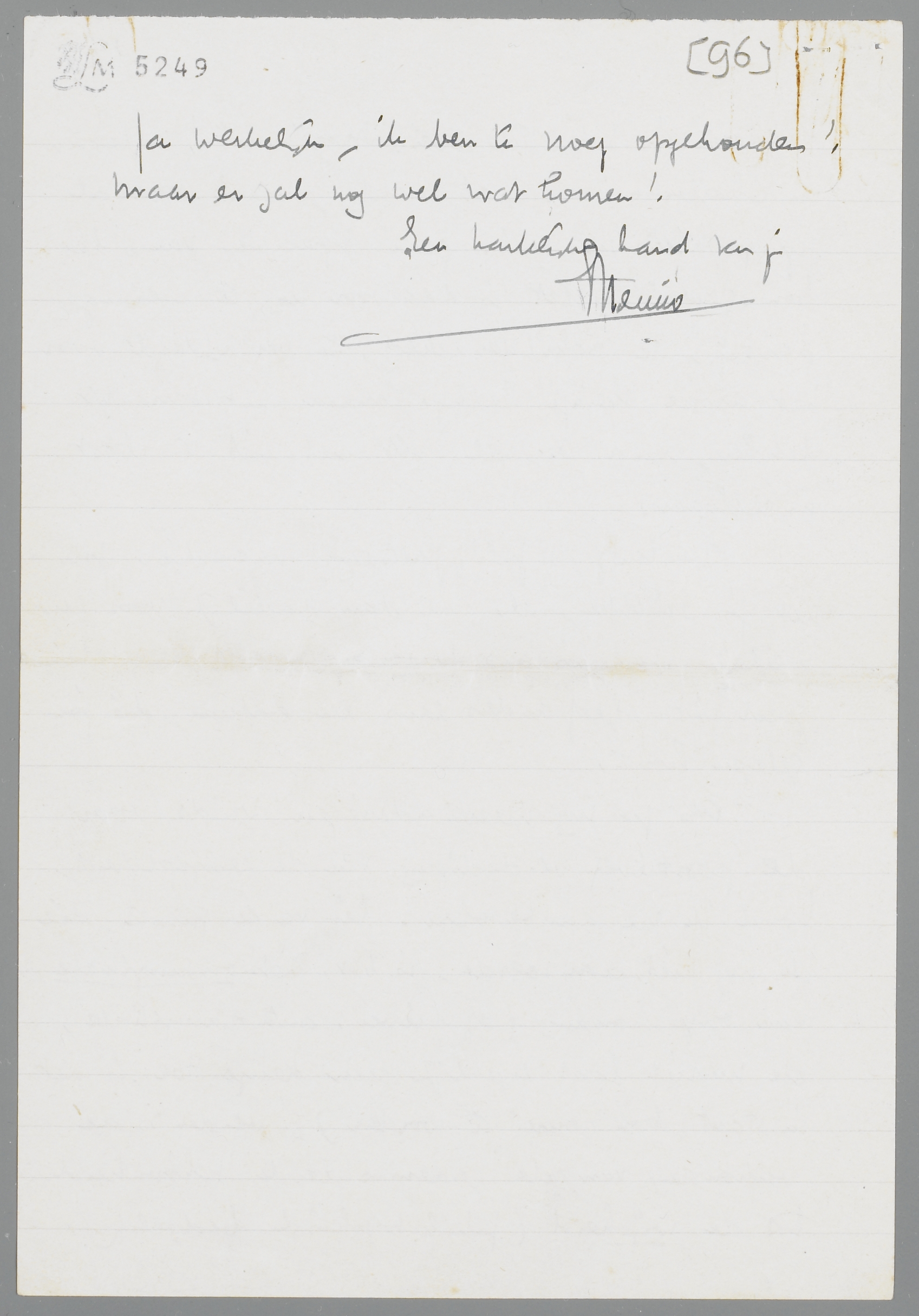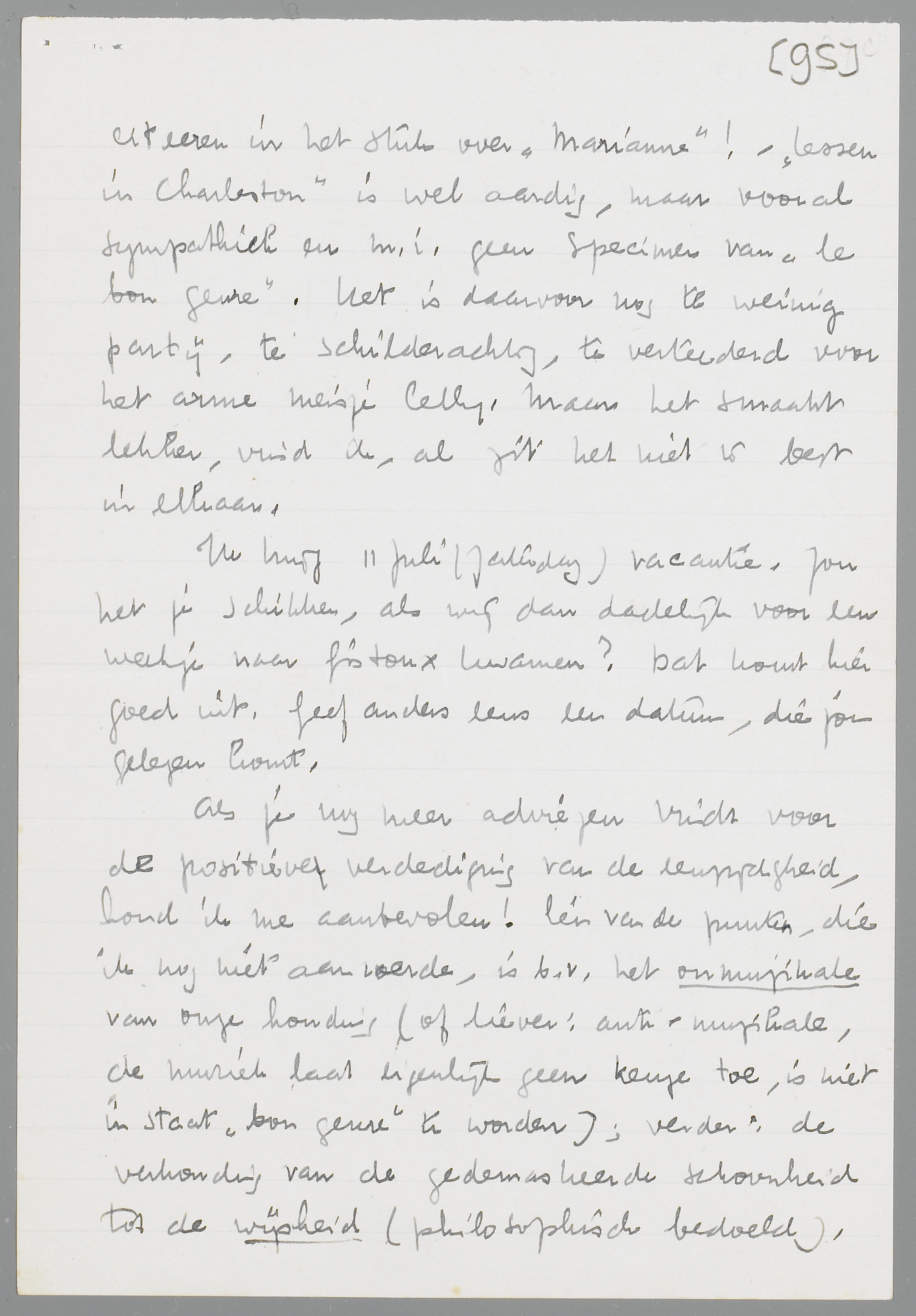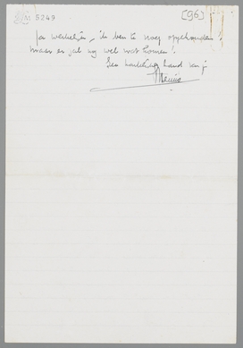 Als je nog meer adviezen vindt voor de positieve verdediging van de eenzijdigheid, houd ik me aanbevolen! Eén van de punten, die ik nog niet aanroerde, is b.v. het onmuzikale van onze houding (of liever: anti-muzikale, de muziek laat eigenlijk geen keuze toe, is niet in staat ‘bon genre’ te worden); verder: de verhouding van de gedemaskeerde schoonheid tot de wijsheid (philosophisch bedoeld). Ja werkelijk, ik ben te vroeg opgehouden! Maar er zal nog wel wat komen!