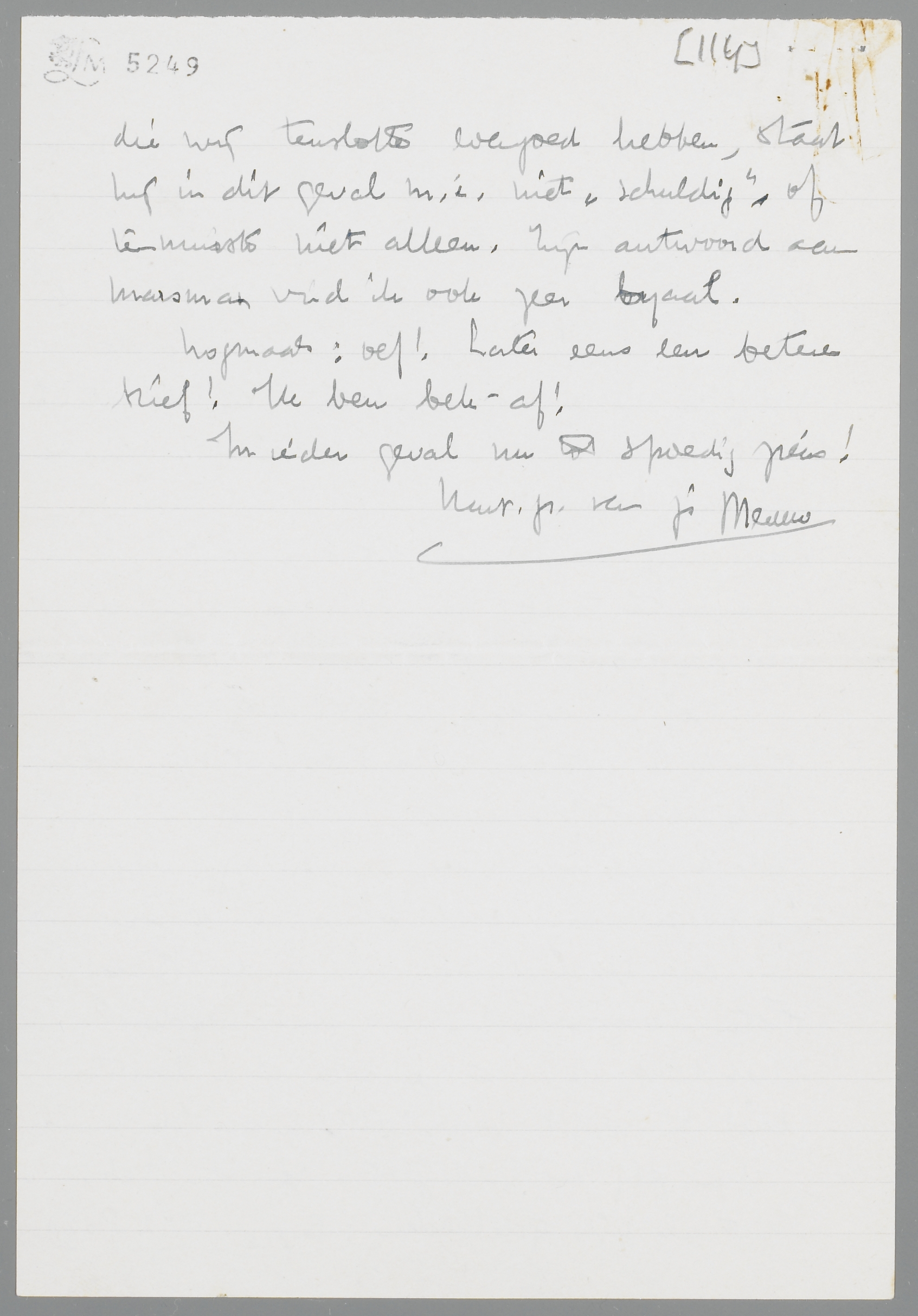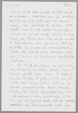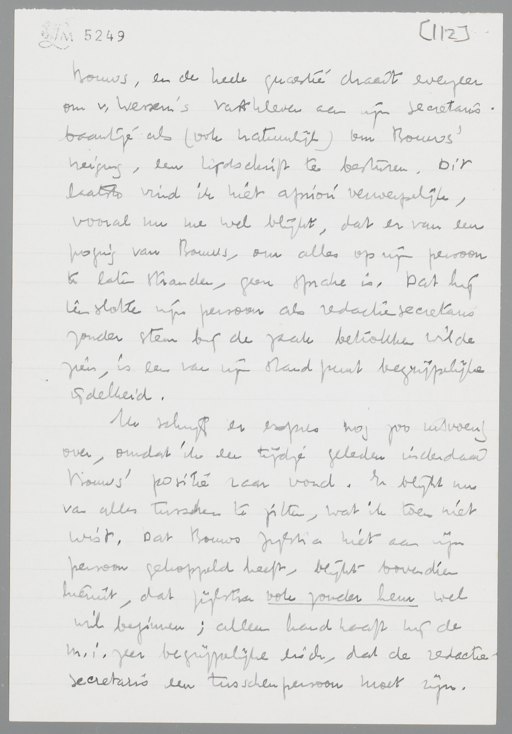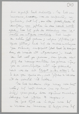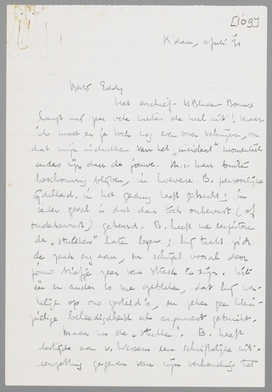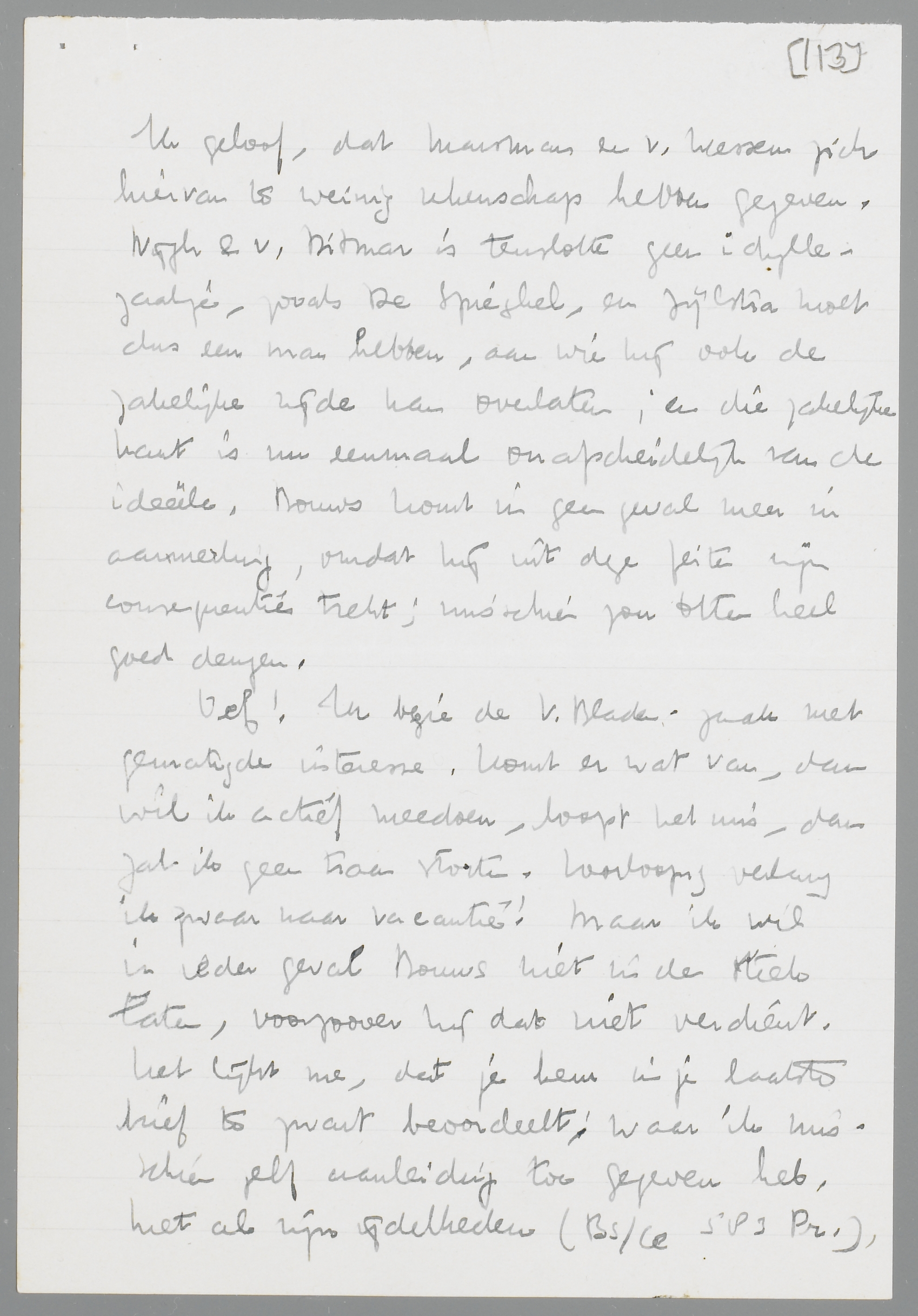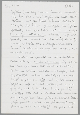 Het archief V. Bladen-Bouws hangt mij zeer vele meters de keel uit! Maar ik moet er je toch nog even over schrijven, omdat mijn indrukken van het ‘incident’ momenteel anders zijn dan de jouwe. M.i. kan buiten beschouwing blijven, in hoeverre B. persoonlijke ijdelheid in het geding heeft gebracht; in ieder geval is dat dan toch onbewust (of onderbewust) gebeurd. B. heeft me eergisteren de ‘stukken’ laten lezen; hij trekt zich de zaak erg aan, en schijnt vooral door jouw briefje zeer van streek te zijn. Uit één en ander is me gebleken, dat hij werkelijk op ons gesteld is, en zeker geen kleinzielige beleedigdheid als argument gebruikt.