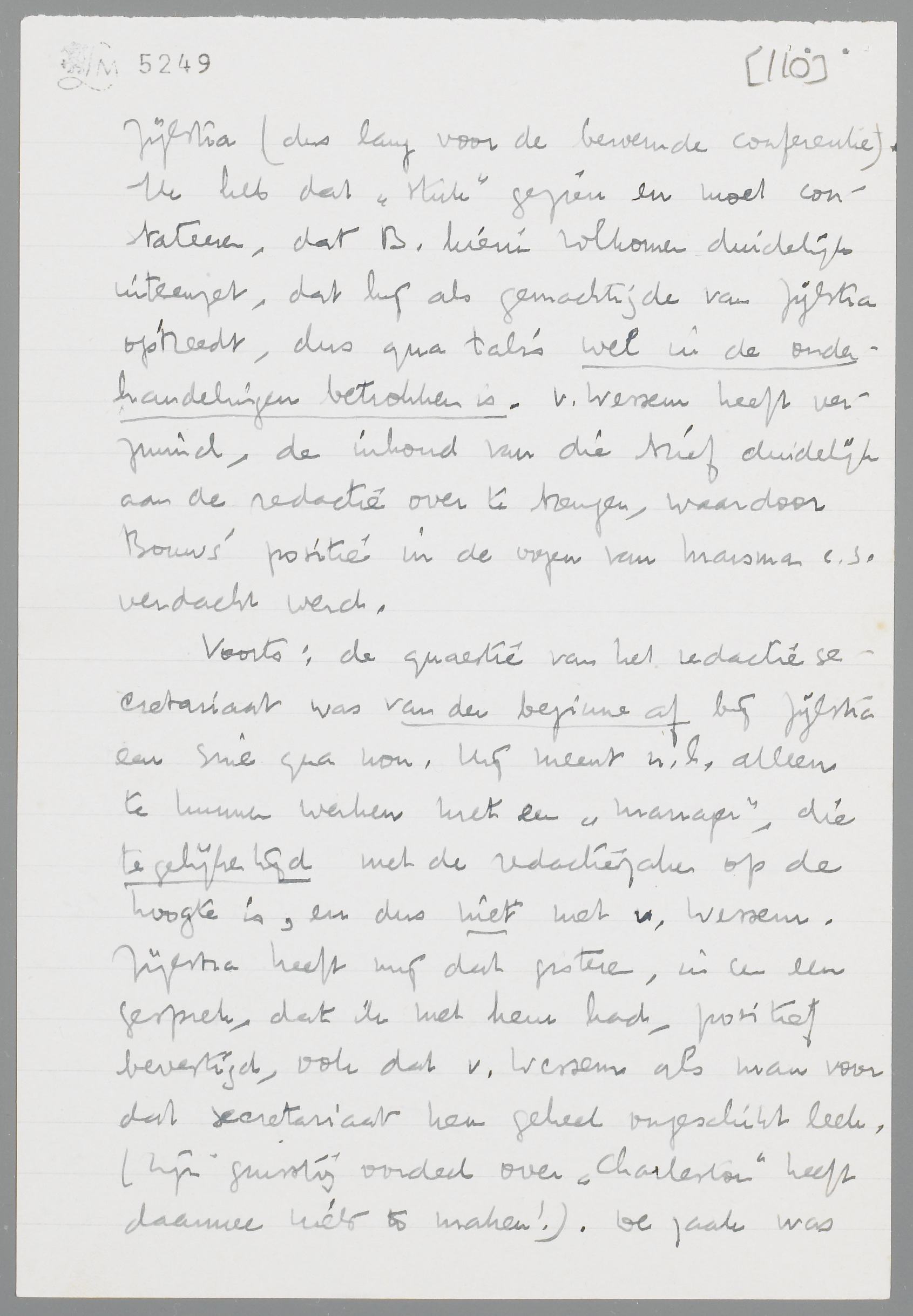 Maar nu de ‘stukken’. B. heeft destijds aan v. Wessem een schriftelijke uiteenzetting gegeven van zijn verhouding tot Zijlstra (dus lang voor de beroemde conferentie). Ik heb dat ‘stuk’ gezien en moet constateeren, dat B. hierin volkomen duidelijk uiteenzet, dat hij als gemachtigde van Zijlstra optreedt, dus qua talis wel in de onderhandelingen betrokken is. v. Wessem heeft verzuimd, de inhoud van die brief duidelijk aan de redactie over te brengen, waardoor Bouws' positie in de oogen van Marsman c.s. verdacht werd.