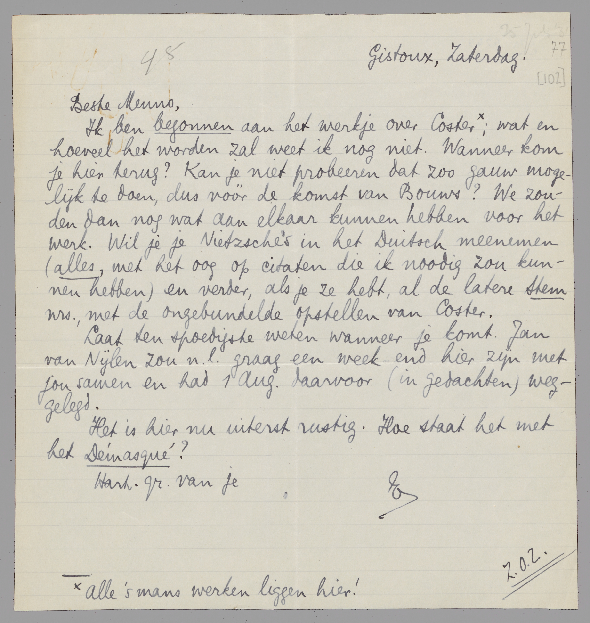 Ik ben begonnen aan het werkje over Coster*; wat en hoeveel het worden zal weet ik nog niet. Wanneer kom je hier terug? Kan je niet probeeren dat zoo gauw mogelijk te doen, dus vóór de komst van Bouws? We zouden dan nog wat aan elkaar kunnen hebben voor het werk. Wil je je Nietzsche's in het Duitsch meenemen (alles, met het oog op citaten, die ik noodig zou kunnen hebben) en verder, als je ze hebt, al de latere Stem nrs., met de ongebundelde opstellen van Coster.