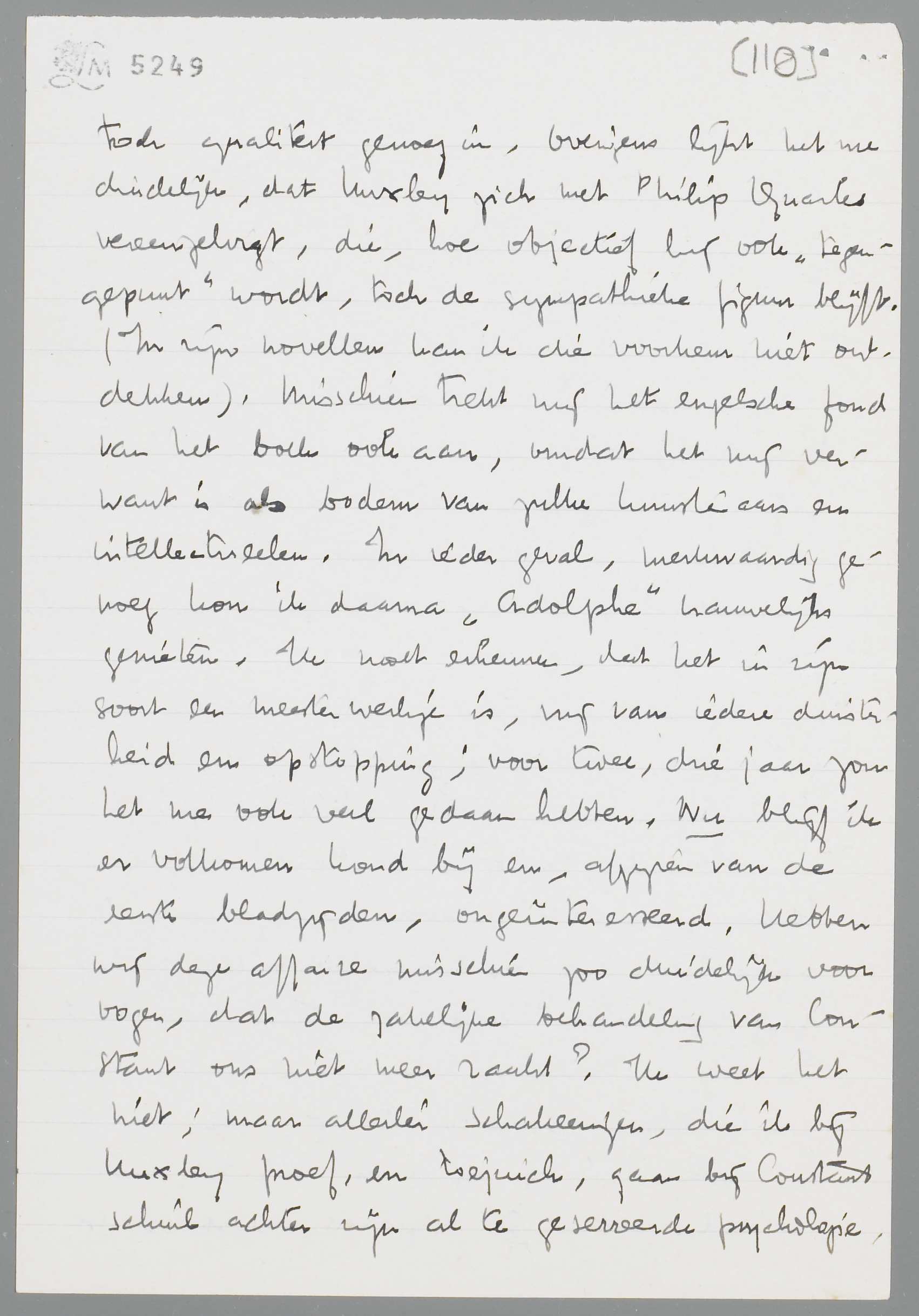 Ik heb Point Counter Point uitgelezen, benevens Adolphe. Voor Huxley koester ik après tout toch een enorme bewondering; hij ging me in het tweede deel steeds meer boeien. Er mag van alles op hem aan te merken zijn: een uitstekend psycholoog is hij zeker en zijn ‘systeem’ is op den duur toch ook niet vervelend. Het is te uitgebreid, maar er zit toch qualiteit genoeg in. Overigens lijkt het me duidelijk, dat Huxley zich met Philip Quarles vereenzelvigt, die, hoe objectief hij ook ‘tegenpunt’ wordt, toch de sympathieke figuur blijft. (In zijn novellen kan ik die voorkeur niet ontdekken). Misschien trekt mij het engelsche fond van het boek ook aan, omdat het mij verwant is als bodem van zulke kunstenaars en intellectueelen. In ieder geval, merkwaardig genoeg kon ik daarna Adolphe nauwelijks genieten. Ik moet erkennen, dat het in zijn soort een meesterwerkje is, vrij van iedere duisterheid en opstopping; voor twee, drie jaar zou het me ook veel gedaan hebben. Nu blijf ik er volkomen koud bij en, afgezien van de eerste bladzijden, ongeïnteresseerd. Hebben wij deze affaire misschien zoo duidelijk voor oogen, dat de zakelijke behandeling van Constant ons niet meer raakt? Ik weet het niet; maar allerlei schakeeringen, die ik bij Huxley proef, en toejuich, gaan bij Constant schuil achter zijn al te geserreerde psychologie. Ik zou zelf zoo'n boekje nooit kunnen schrijven; maar ik heb voor mezelf ook het gevoel, dat ik het niet verlang te schrijven, dat het me eigenlijk geen belang inboezemt. Zooals ik zeg, alleen de eerste bladzijden (de expositie van Adolphe's mentaliteit) hebben me getroffen; de rest blijft me bij als een meesterlijk schema, waarin juist alles, wat ik nu problematisch zou willen zien, ontbreekt. Toch zou ik Adolphe onvoorwaardelijk tot le bon genre willen rekenen, omdat het absoluut helder en muzikaal tegelijk is, zonder concessies naar één van beide kanten. Alleen: het verraste mij niet meer; ik wist eigenlijk al, dat het zoo zou zijn, zou moeten zijn. Ik geloof, dat Constant oprecht is, als hij in het voorwoord zegt, dat het boek hem ‘fort indifférent’ is geworden. Geen valsche bescheidenheid ongetwijfeld; als dit geval afgeschud is, blijkt het eigenlijk al een erg gewoon gevalletje, ook voor den schrijver zelf, volkomen eerlijk verantwoord, maar niet belangrijker geworden, dan het op zichzelf was, toen het geleefd werd. Voor hypocrieten op liefdesgebied is Adolphe natuurlijk een model, dat zij zich kunnen aantrekken; voor anderen, die geen speciale hypocrisie bezitten op dit punt, heeft het zijn verrassing grootendeels verloren, lijkt me. Ik voelde de tijd, de afstand van de jaren, toen ik Adolphe las; een bedenkelijk teeken, niet voor Constant, maar voor de verhouding Constant - ter Braak.