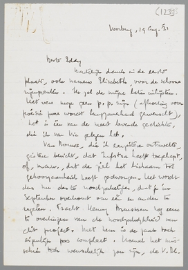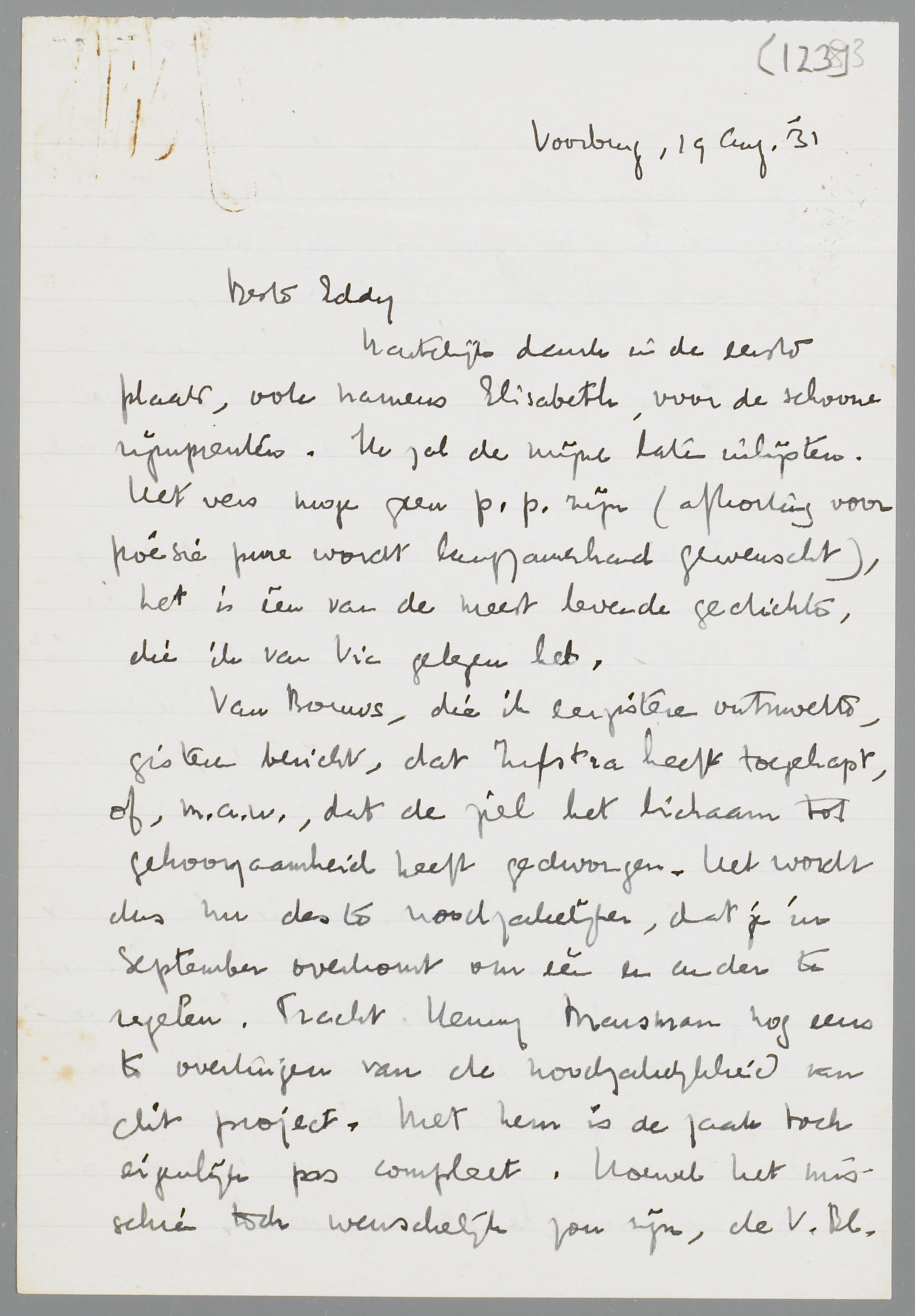 Van Bouws, die ik eergisteren ontmoette, gisteren bericht, dat Zijlstra heeft toegehapt, of, m.a.w., dat de ziel het lichaam tot gehoorzaamheid heeft gedwongen. Het wordt dus nu des te noodzakelijker, dat je in September overkomt om één en ander te regelen. Tracht Henny Marsman nog eens te overtuigen van de noodzakelijkheid van dit project. Met hem is de zaak toch eigenlijk pas compleet. Hoewel het misschien toch wenschelijk zou zijn, de V. Bl. te laten verdwijnen en door een nieuwe naam aan te geven, dat er nieuwe plannen zijn. Geef me in ieder geval spoedig bericht over je ‘onderhandelingen’ met Marsman.