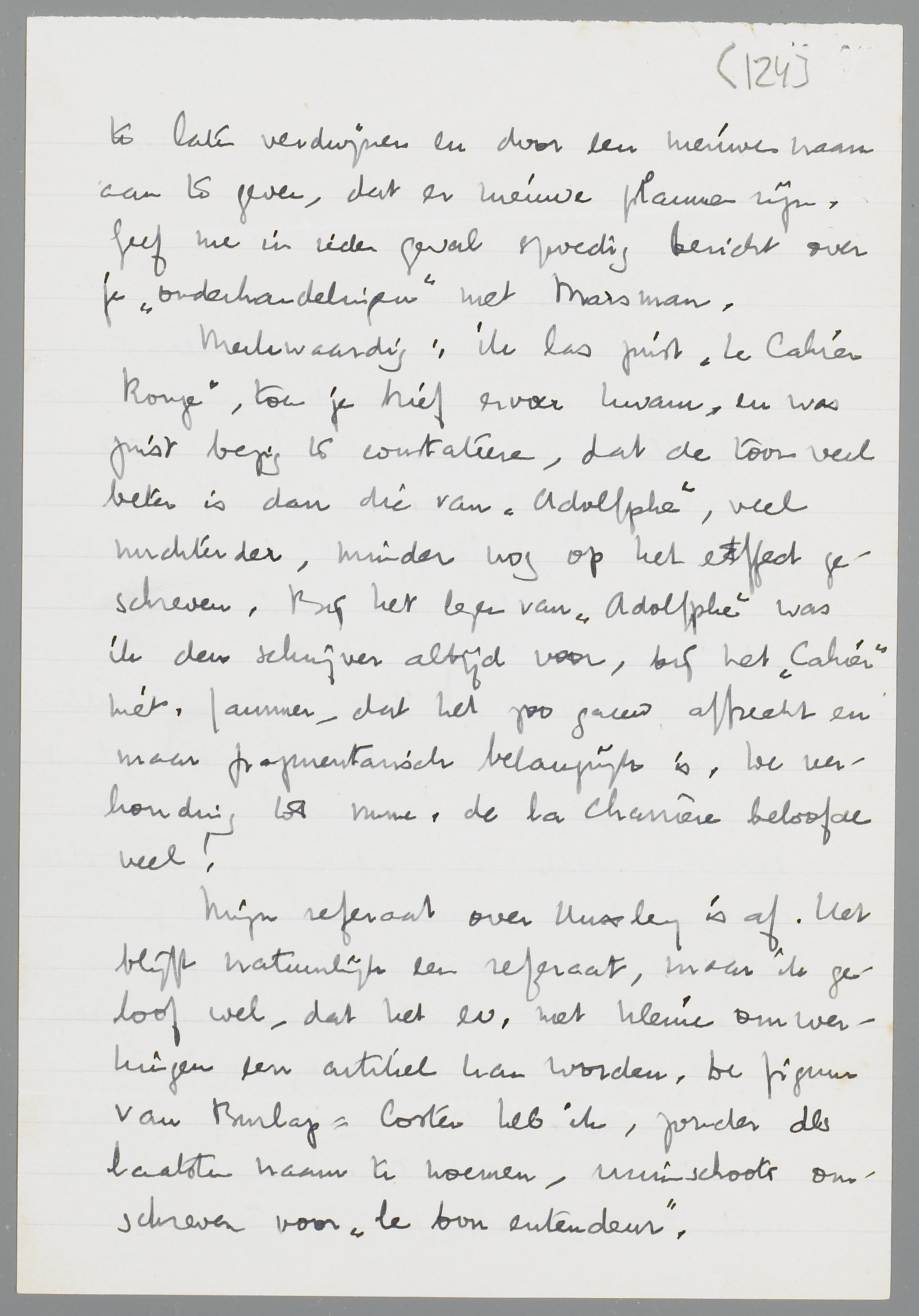Merkwaardig: ik las juist Le Cahier Rouge, toen je brief erover kwam, en was juist bezig te constateeren, dat de toon veel beter is dan die van Adolphe, veel nuchterder, minder nog op het effect geschreven. Bij het lezen van Adolphe was ik den schrijver altijd voor, bij het Cahier niet. Jammer, dat het zoo gauw afbreekt en maar fragmentarisch belangrijk is. De verhouding tot Mme. de la Charrière beloofde veel!
