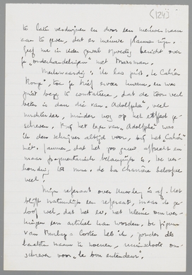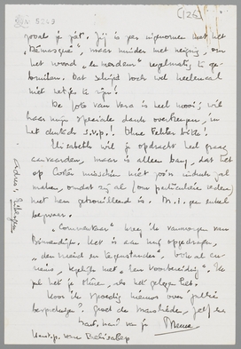 Binnendijk sprak Zondag over H.C., onder het gedonder der aether-kanonnen (er woedde n.l. net een cycloon in Doetichem). Het was een zeer sympathieke inleiding, hoewel eenige verwijten aan mijn anti-aesthetische vooroordeelen niet ontbraken. Hij heeft ‘schat, schat’ geciteerd, dat wij juist uit de proeven hadden verwijderd! Overigens vrees ik, dat weinig luisteraars er iets van begrepen zullen hebben, gegeven het niet - verschenen - zijn en de artillerie van Onzen Lieven Heer.