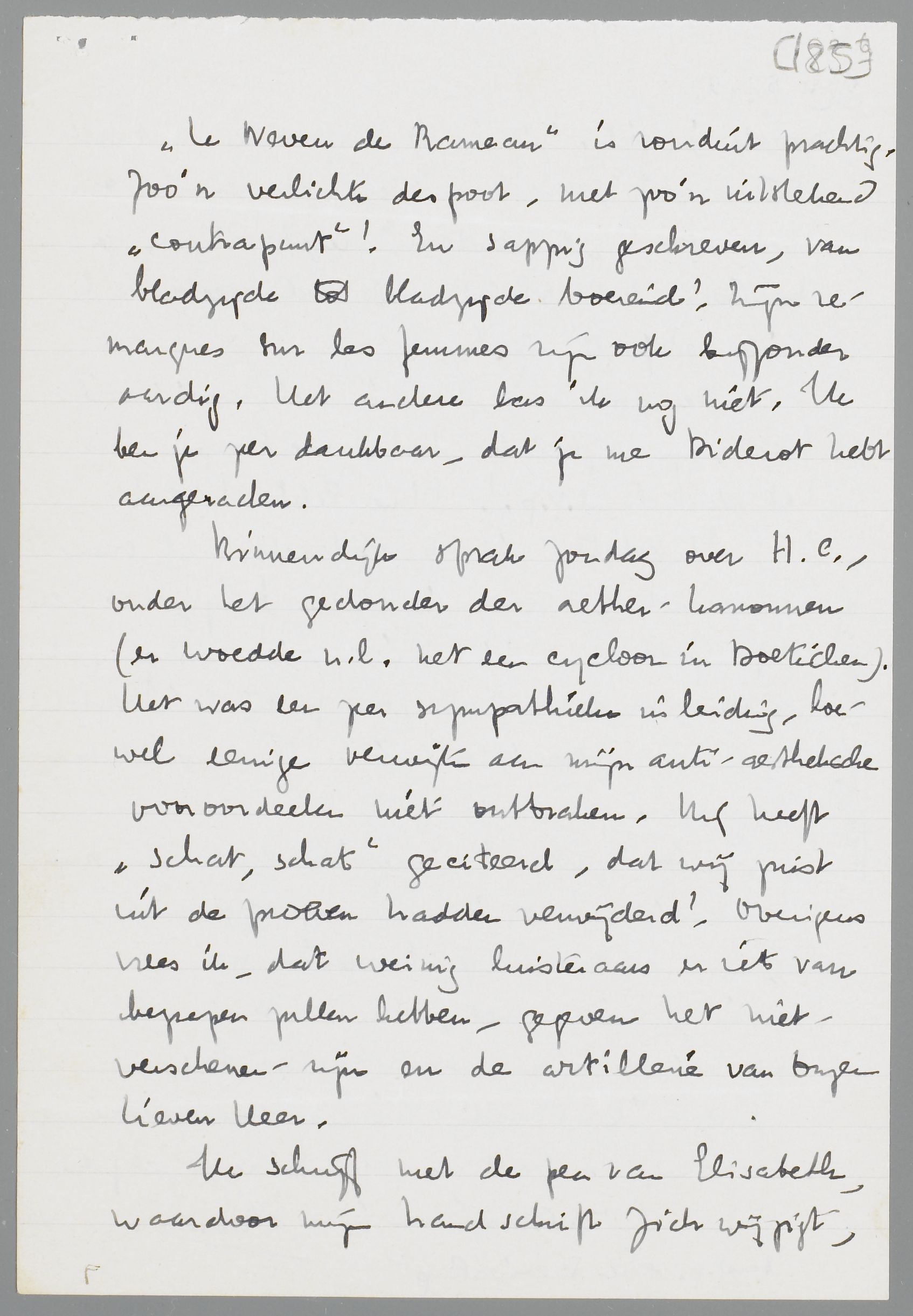 Le Neveu de Rameau is ronduit prachtig. Zoo'n verlichte despoot, met zoo'n uitstekend ‘contrapunt’! En sappig geschreven, van bladzijde tot bladzijde boeiend! Zijn remarques sur les femmes zijn ook bijzonder aardig. Het andere las ik nog niet. Ik ben je zeer dankbaar, dat je me Diderot hebt aangeraden.
