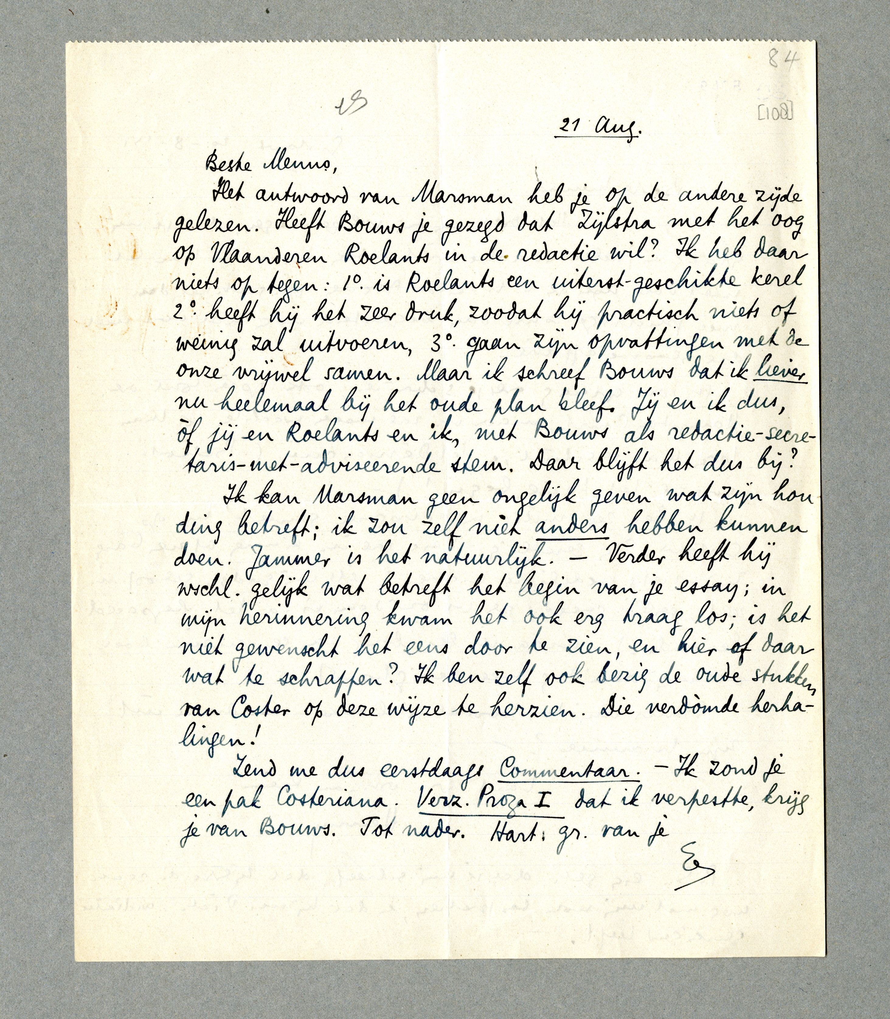Het antwoord van Marsman heb je op de andere zijde gelezen. Heeft Bouws je gezegd dat Zijlstra met het oog op Vlaanderen Roelants in de redactie wil? Ik heb daar niets op tegen: 1o. is Roelants een uiterst-geschikte kerel, 2o. heeft hij het zeer druk, zoodat hij practisch niets of weinig zal uitvoeren, 3o. gaan zijn opvattingen met de onze vrijwel samen. Maar ik schreef Bouws dat ik liever nu heelemaal bij het oude plan bleef. Jij en ik dus, òf jij en Roelants en ik, met Bouws als redactie-secretaris-met-adviseerende stem. Daar blijft het dus bij?