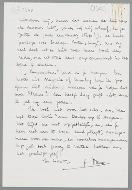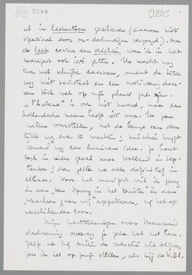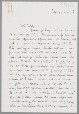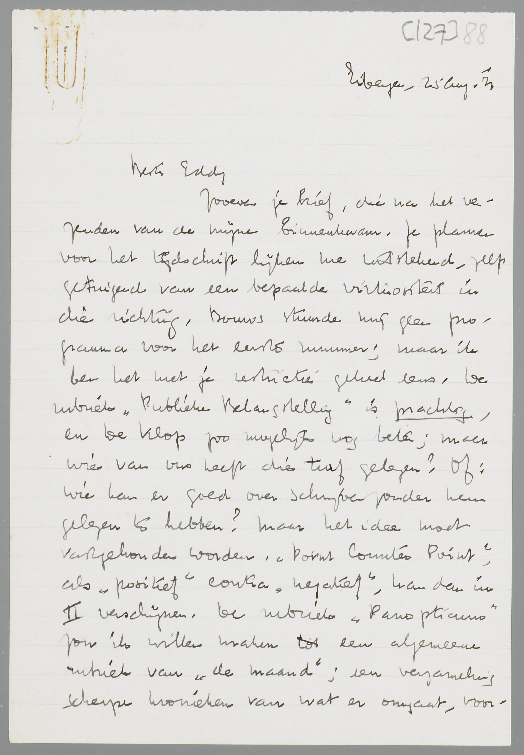 Zooeven je brief, die na het verzenden van de mijne binnenkwam. Je plannen voor het tijdschrift lijken me uitstekend, zelfs getuigend van een bepaalde virtuositeit in die richting. Bouws stuurde mij geen programma voor het eerste nummer; maar ik ben het met je restrictie geheel eens. De rubriek ‘Publieke Belangstelling’ is prachtig, en De Klop zoo mogelijk nog beter; maar wie van ons heeft die turf gelezen? Of: wie kan er goed over schrijven zonder hem gelezen te hebben? Maar het idee moet vastgehouden worden. Point Counter Point, als ‘positief’ contra ‘negatief’, kan dan in II verschijnen.