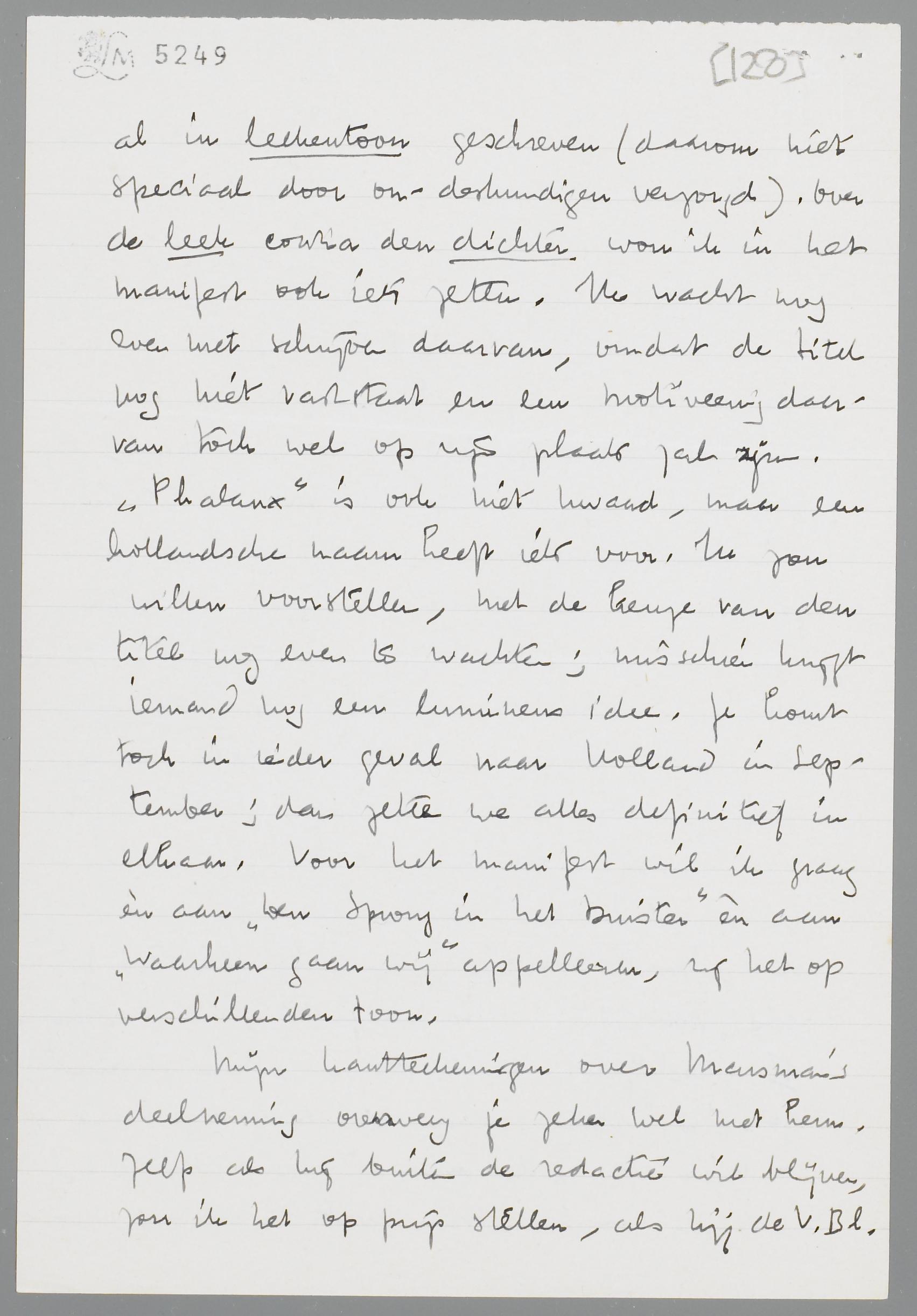 De rubriek ‘Panopticum’ zou ik willen maken tot een algemeene rubriek van ‘de maand’; een verzameling scherpe kronieken van wat er omgaat, vooral in leekentoon geschreven (daarom niet speciaal door ondeskundigen verzorgd). Over de leek contra den dichter wou ik in het manifest ook iets zetten. Ik wacht nog even met schrijven daarvan, omdat de titel nog niet vaststaat en een motiveering daarvan toch wel op zijn plaats zal zijn. Phalanx is ook niet kwaad, maar een hollandsche naam heeft iets voor. Ik zou willen voorstellen, met de keuze van den titel nog even te wachten; misschien krijgt iemand nog een lumineus idee. Je komt toch in ieder geval naar Holland in September; dan zetten we alles definitief in elkaar. Voor het manifest wil ik graag èn aan Den Sprong in het Duister èn aan Waarheen gaan wij appelleeren, zij het op verschillenden toon.