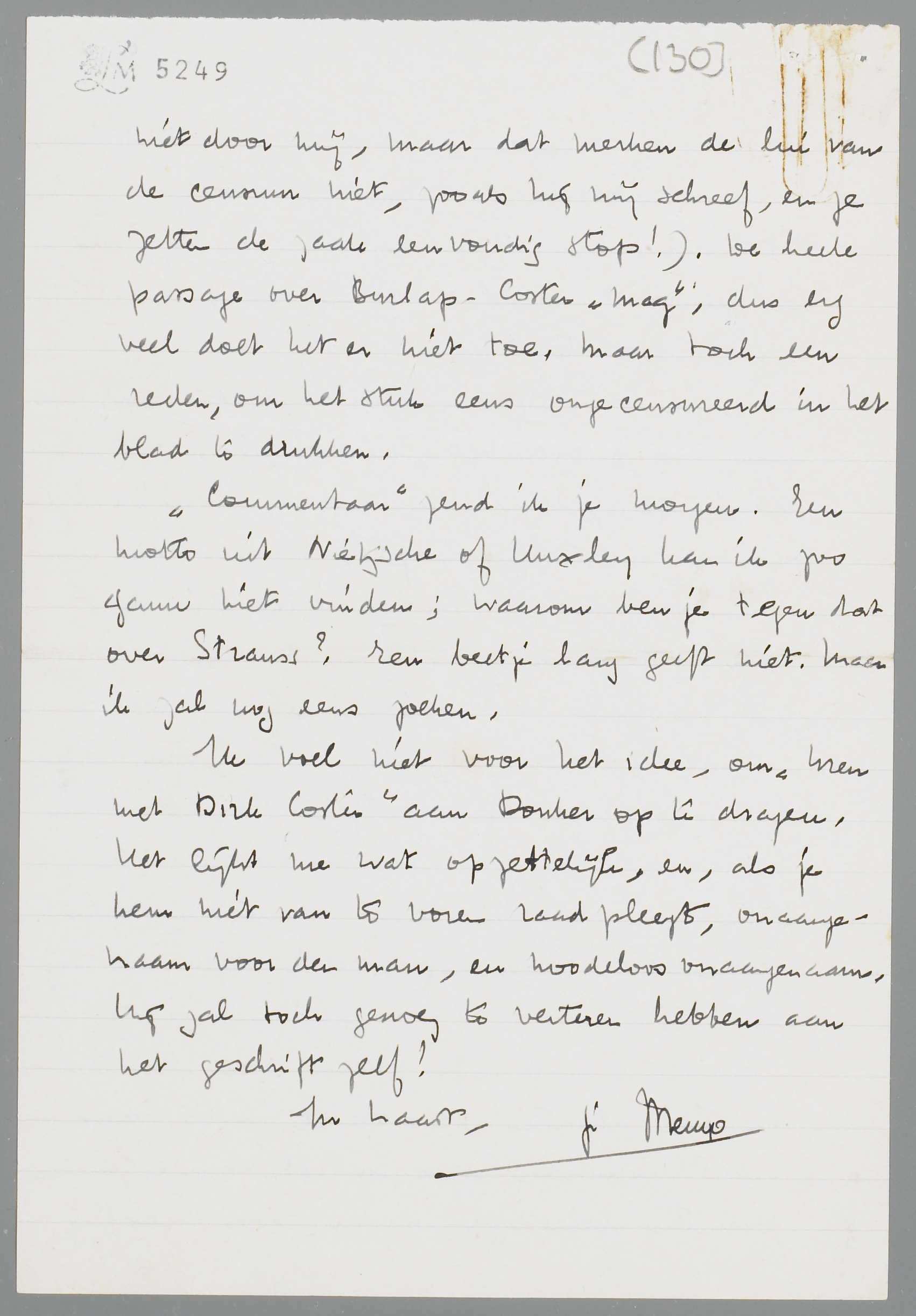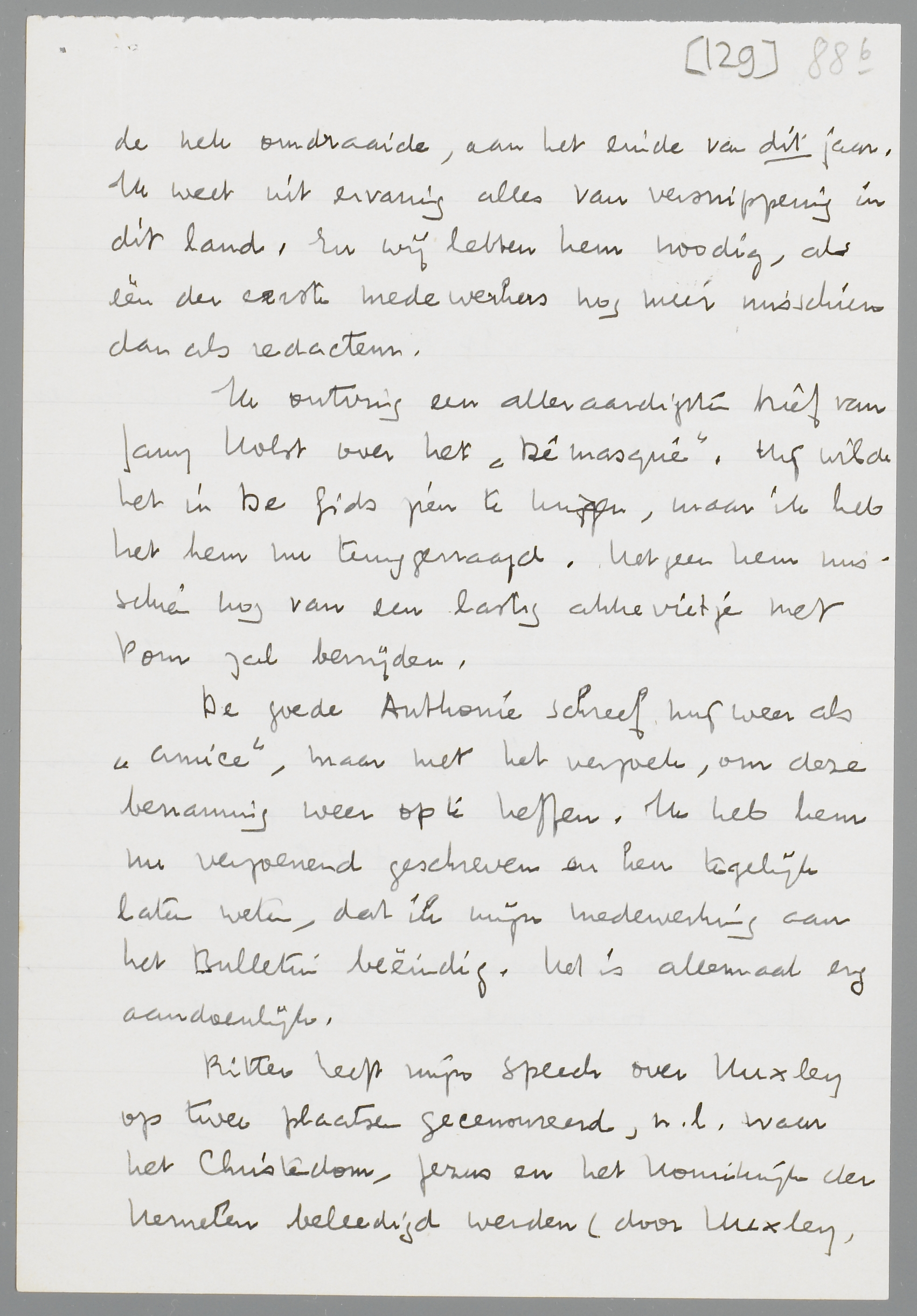 Ritter heeft mijn speech over Huxley op twee plaatsen gecensureerd, n.l. waar het Christendom, Jezus en het Koninkrijk der Hemelen beleedigd werden (door Huxley, niet door mij, maar dat merken de lui van de censuur niet, zooals hij mij schreef, en ze zetten de zaak eenvoudig stop!). De heele passage over Burlap - Coster ‘mag’; dus erg veel doet het er niet toe. Maar toch een reden, om het stuk eens ongecensureerd in het blad te drukken.