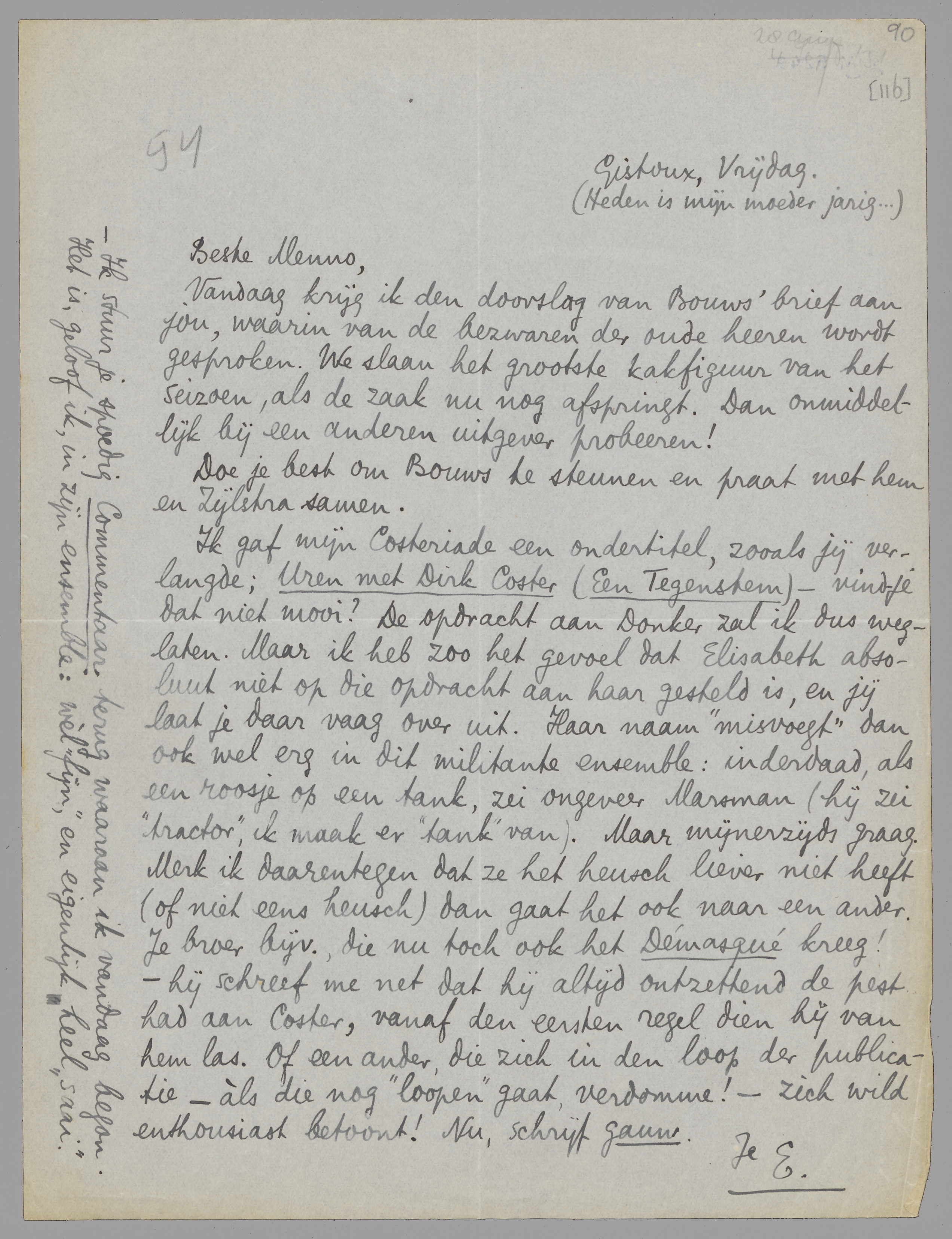 Ik gaf mijn Costeriade een ondertitel, zooals jij verlangde; Uren met Dirk Coster (Een Tegenstem) - vind-je dat niet mooi? De opdracht aan Donker zal ik dus weglaten. Maar ik heb zoo het gevoel dat Elisabeth absoluut niet op die opdracht aan haar gesteld is, en jij laat je daar vaag over uit. Haar naam ‘misvoegt’ dan ook wel erg in dit militante ensemble: inderdaad, als een roosje op een tank, zei ongeveer Marsman (hij zei ‘tractor’, ik maak er ‘tank’ van). Maar mijnerzijds graag. Merk ik daarentegen dat ze het heusch liever niet heeft (of niet eens heusch) dan gaat het ook naar een ander. Je broer bijv., die nu toch ook het Démasqué kreeg! - hij schreef me net dat hij altijd ontzettend de pest had aan Coster, vanaf den eersten regel dien hij van hem las. Of een ander, die zich in den loop der publicatie - àls die nog ‘loopen’ gaat, verdomme! - zich wild enthousiast betoont! Nu, schrijf gauw. Je