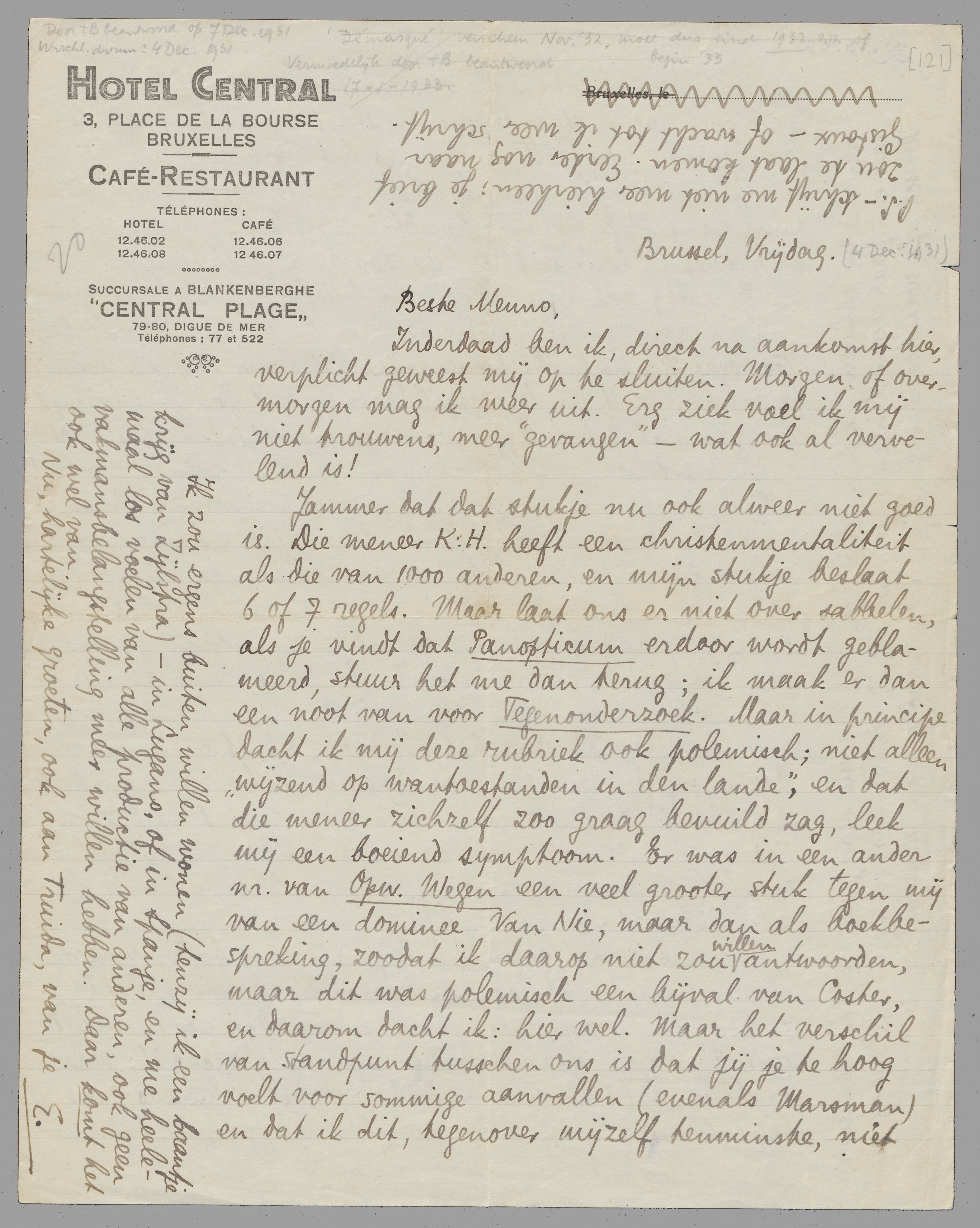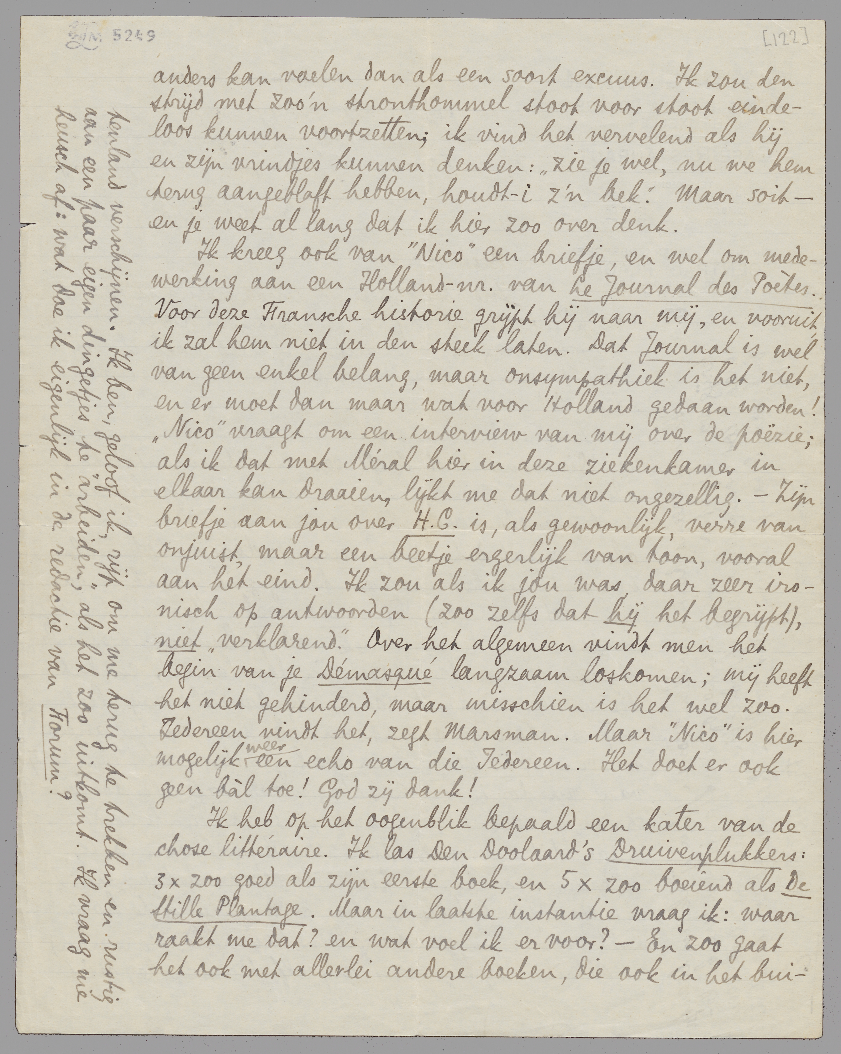 Ik kreeg ook van ‘Nico’ een briefje, en wel om medewerking aan een Holland-nr. van Le Journal des Poètes. Voor deze Fransche historie grijpt hij naar mij, en vooruit, ik zal hem niet in den steek laten. Dat Journal is wel van geen enkel belang, maar onsympathiek is het niet, en er moet dan maar wat voor Holland gedaan worden! ‘Nico’ vraagt om een interview van mij over de poëzie; als ik dat met Méral hier in deze ziekenkamer in elkaar kan draaien, lijkt me dat niet ongezellig. - Zijn briefje aan jou over H.C. is, als gewoonlijk, verre van onjuist, maar een beetje ergerlijk van toon, vooral aan het eind. Ik zou als ik jou was, daar zeer ironisch op antwoorden (zoo zelfs dat hij het begrijpt), niet ‘verklarend’. Over het algemeen vindt men het begin van je Démasqué langzaam loskomen; mij heeft het niet gehinderd, maar misschien is het wel zoo. Iedereen vindt het, zegt Marsman. Maar ‘Nico’ is hier mogelijk weer een echo van die Iedereen. Het doet er ook geen bàl toe! God zij dank!