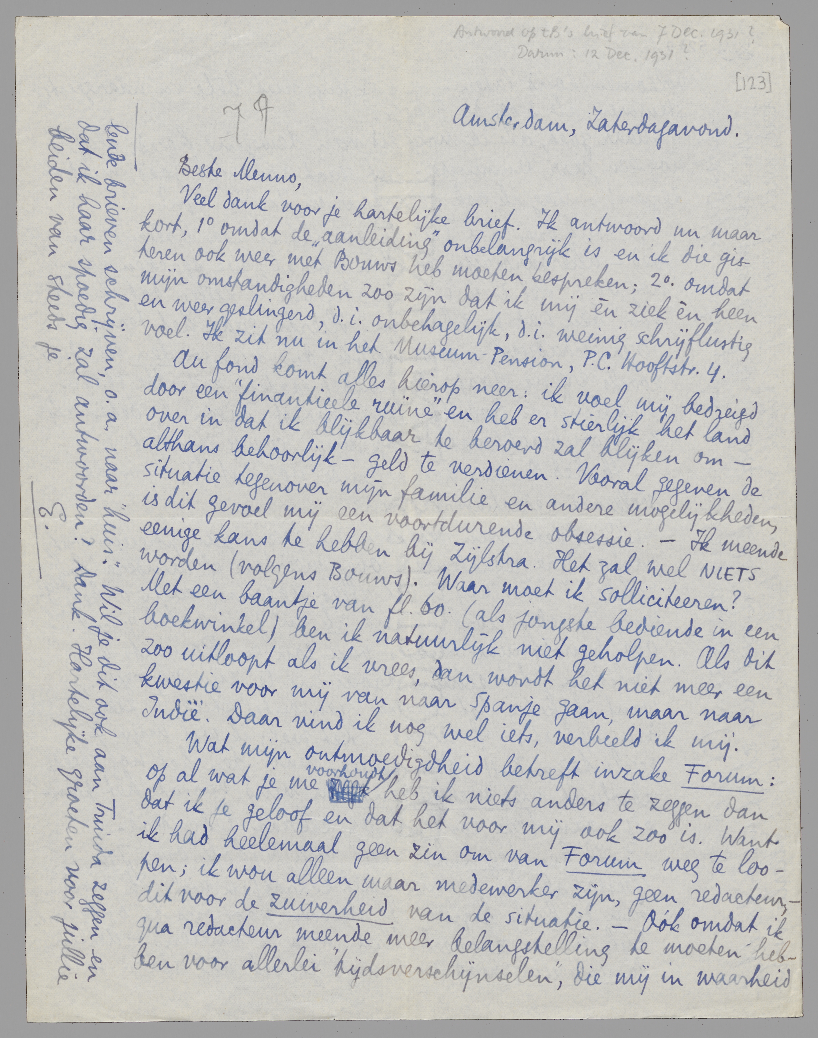 Veel dank voor je hartelijke brief. Ik antwoord nu maar kort, 1o omdat de ‘aanleiding’ onbelangrijk is en ik die gisteren ook weer met Bouws heb moeten bespreken; 2o omdat mijn omstandigheden zoo zijn dat ik mij èn ziek èn heen en weer geslingerd, d.i. onbehagelijk, d.i. weinig schrijflustig voel. Ik zit nu in het Museum-Pension, P.C. Hooftstr. 4.