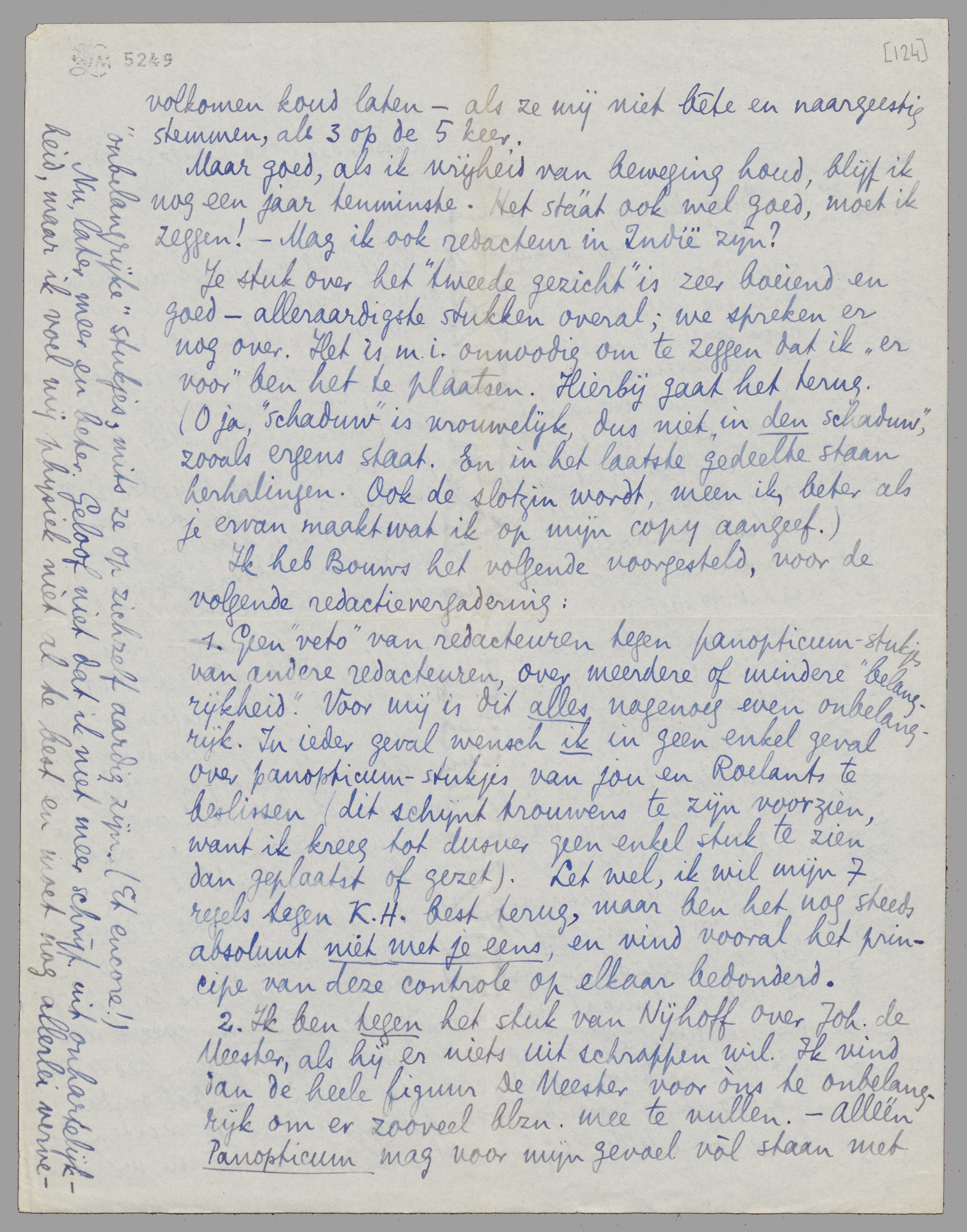 1. Geen ‘veto’ van redacteuren tegen panopticum-stukjes van andere redacteuren, over meerdere of mindere ‘belangrijkheid’. Voor mij is dit alles nagenoeg even onbelangrijk. In ieder geval wensch ik in geen enkel geval over panopticum-stukjes van jou en Roelants te beslissen (dit schijnt trouwens te zijn voorzien, want ik kreeg tot dusver geen enkel stuk te zien dan geplaatst of gezet). Let wel, ik wil mijn 7 regels tegen K.H. best terug, maar ben het nog steeds absoluut niet met je eens, en vind vooral het principe van deze controle op elkaar bedonderd. 2. Ik ben tegen het stuk van Nijhoff over Joh. de Meester, als hij er niets uit schrappen wil. Ik vind dan de heele figuur De Meester voor òns te onbelangrijk om er zooveel blzn. mee te vullen. - Alléén Panopticum mag voor mijn gevoel vòl staan met ‘onbelangrijke’ stukjes, mits ze op zichzelf aardig zijn. (Et encore!)