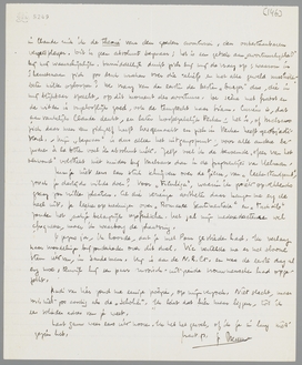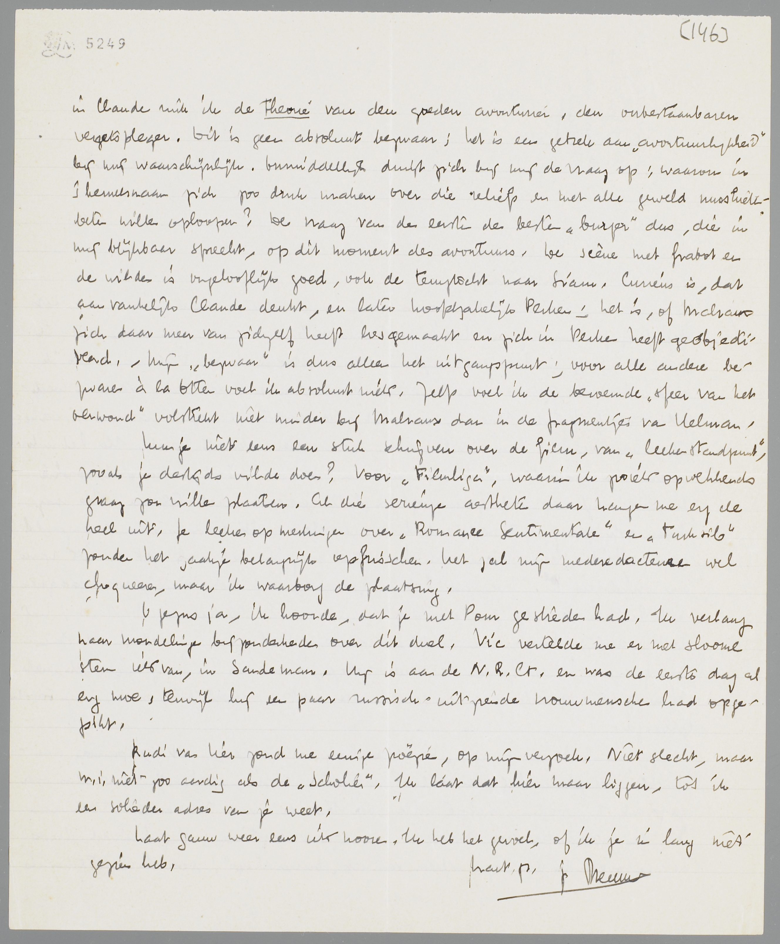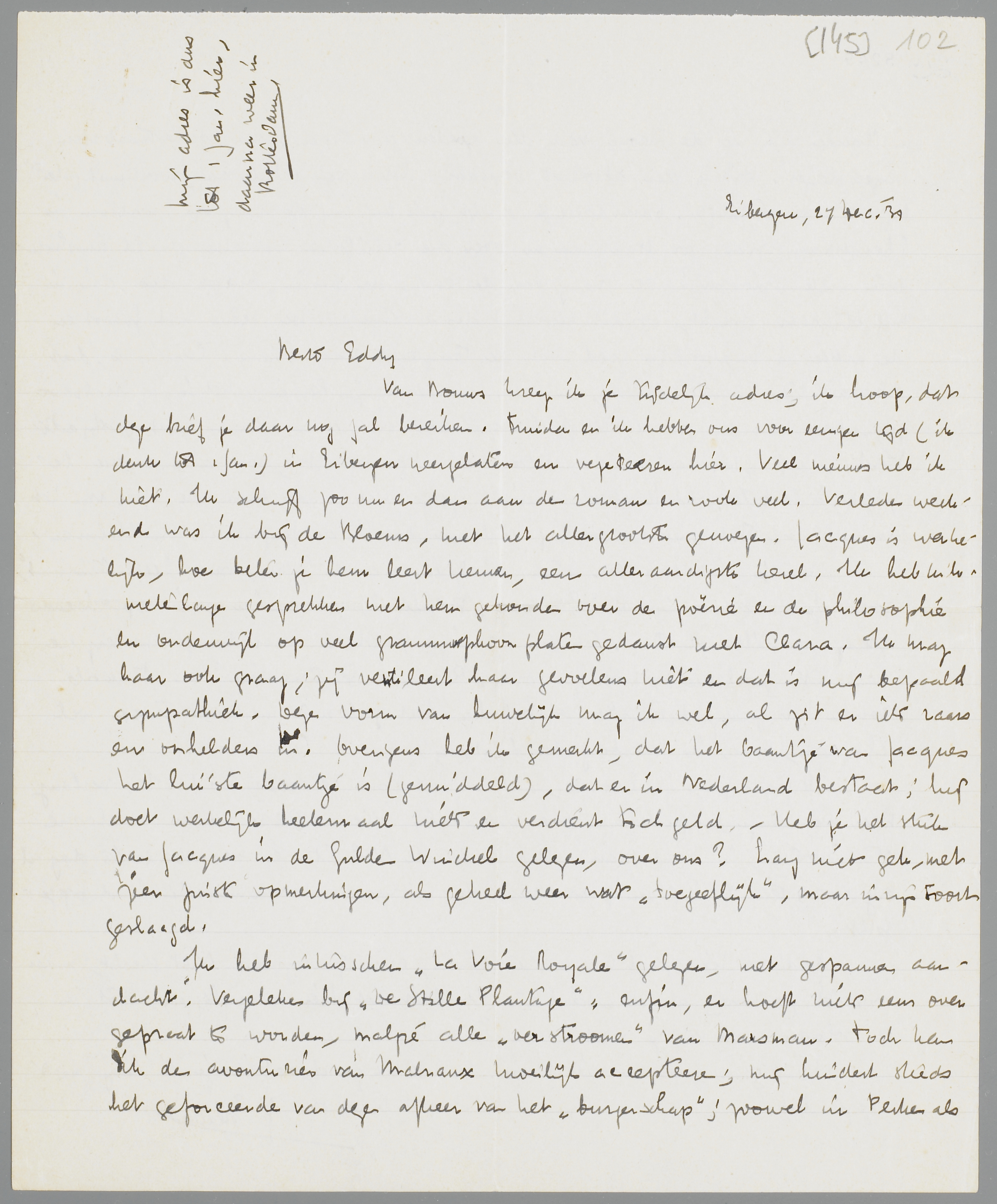 Ik heb intusschen La Voie Royale gelezen, met gespannen aandacht. Vergeleken bij De Stille Plantage: enfin, er hoeft niet eens over gepraat te worden, malgré alle ‘oerstroomen’ van Marsman. Toch kan ik den avonturier van Malraux moeilijk accepteeren; mij hindert steeds het geforceerde van deze afkeer van het ‘burgerschap’; zoowel in Perken als in Claude ruik ik de theorie van den goeden avonturier, den onbestaanbaren verzetspleger. Dit is geen absoluut bezwaar; het is een gebrek aan ‘avontuurlijkheid’ bij mij waarschijnlijk. Onmiddellijk dringt zich bij mij de vraag op: waarom in 's hemelsnaam zich zoo druk maken over die reliëfs en met alle geweld muskietenbeten willen oploopen? De vraag van den eersten den besten ‘burger’ dus, die in mij blijkbaar spreekt, op dit moment des avontuurs. De scène met Grabot en de wilden is ongelooflijk goed, ook de terugtocht naar Siam. Curieus is, dat aanvankelijk Claude denkt, en later hoofdzakelijk Perken; het is, of Malraux zich daar meer van zichzelf heeft losgemaakt en zich in Perken heeft geobjectiveerd. - Mijn ‘bezwaar’ is dus alleen het uitgangspunt; voor alle andere bezwaren à la Otten voel ik absoluut niets. Zelfs voel ik de beroemde ‘sfeer van het oerwoud’ volstrekt niet minder bij Malraux dan in de fragmentjes van Helman.