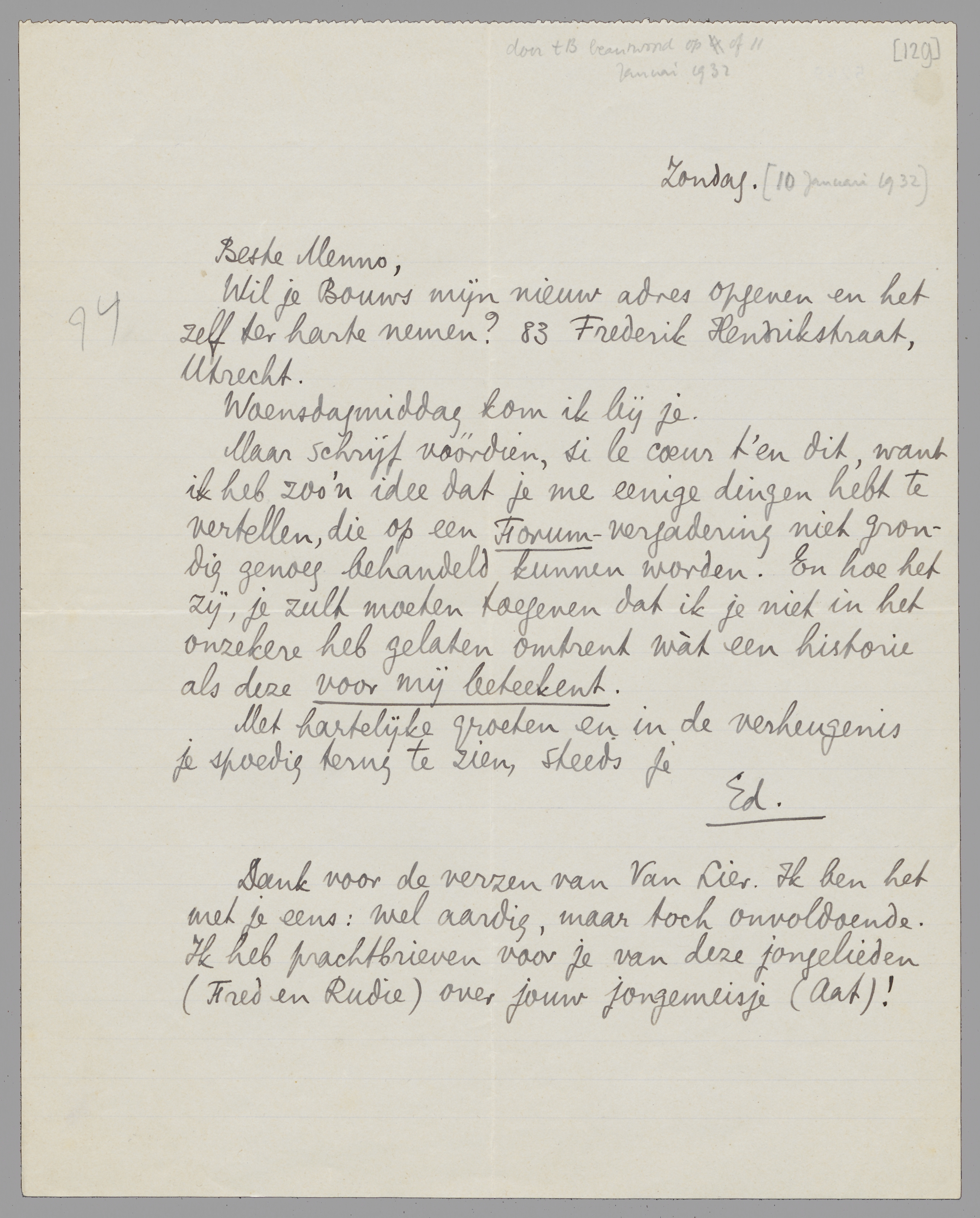 Dank voor de verzen van Van Lier. Ik ben het met je eens: wel aardig, maar toch onvoldoende. Ik heb prachtbrieven voor je van deze jongelieden (Fred en Rudie) over jouw jongemeisje (Aat)!