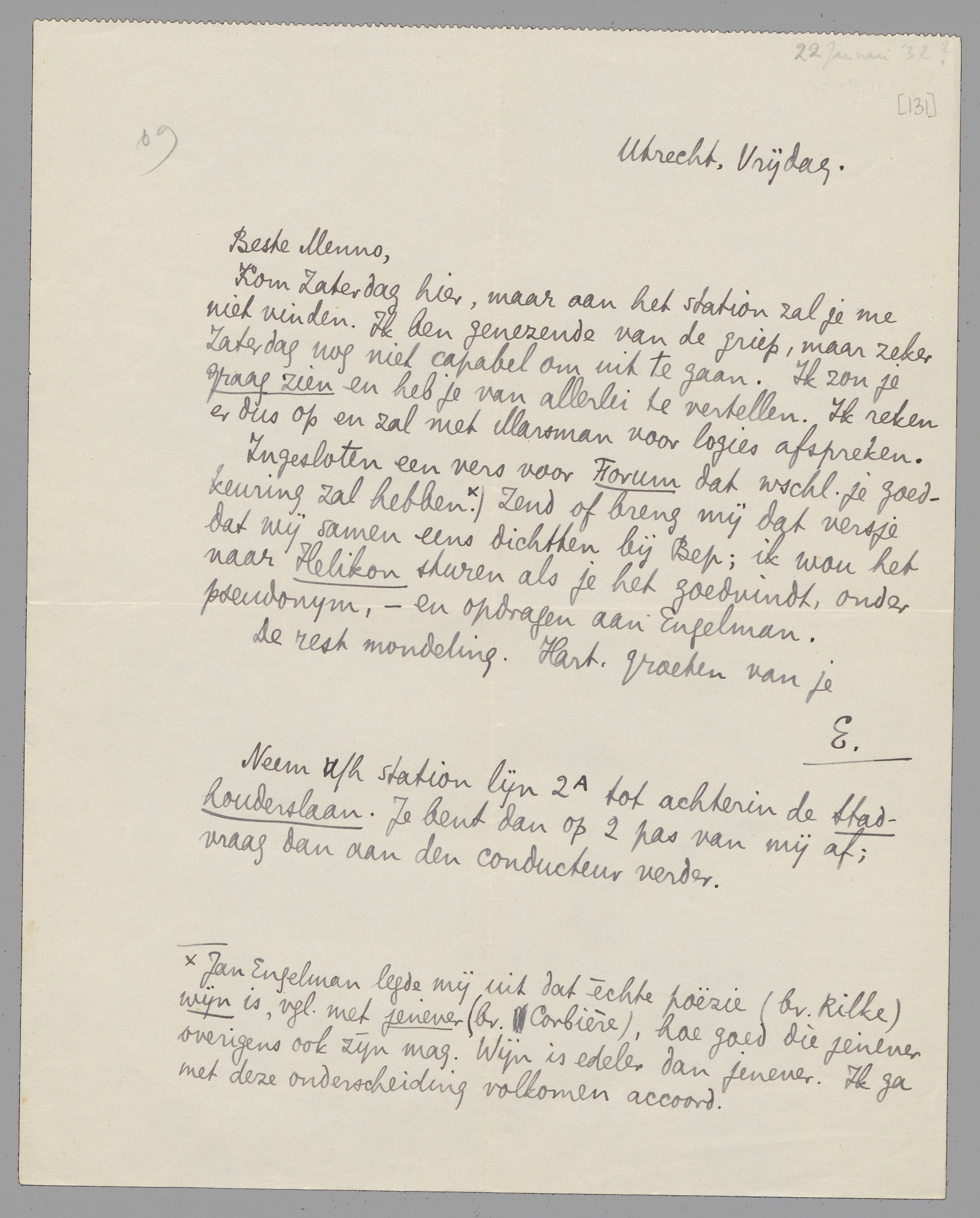 Ingesloten een vers voor Forum dat wschl. je goedkeuring zal hebben. Jan Engelman legde mij uit dat èchte poëzie (bv. Rilke) wijn is, vgl. met jenever (bv. Corbière), hoe goed die jenever overigens ook zijn mag. Wijn is edeler dan jenever. Ik ga met deze onderscheiding volkomen accoord. Zend of breng mij dat versje dat wij samen eens dichtten bij Bep; ik wou het naar Helikon sturen als je het goedvindt, onder pseudonym, - en opdragen aan Engelman.