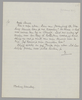 Hier is mijn adres: Laan van Oostenburg 27, Voorburg. Wanneer kom je me opzoeken? De kamer is heel wat ruimer dan die in Utrecht. Laat ons anders afspreken voor Den Haag of Rotterdam zoodra jij kunt. Schrijf me wat je vindt van mijn Scenario voor de Prijs. Gaf Bouws je mijn sonnetten door?