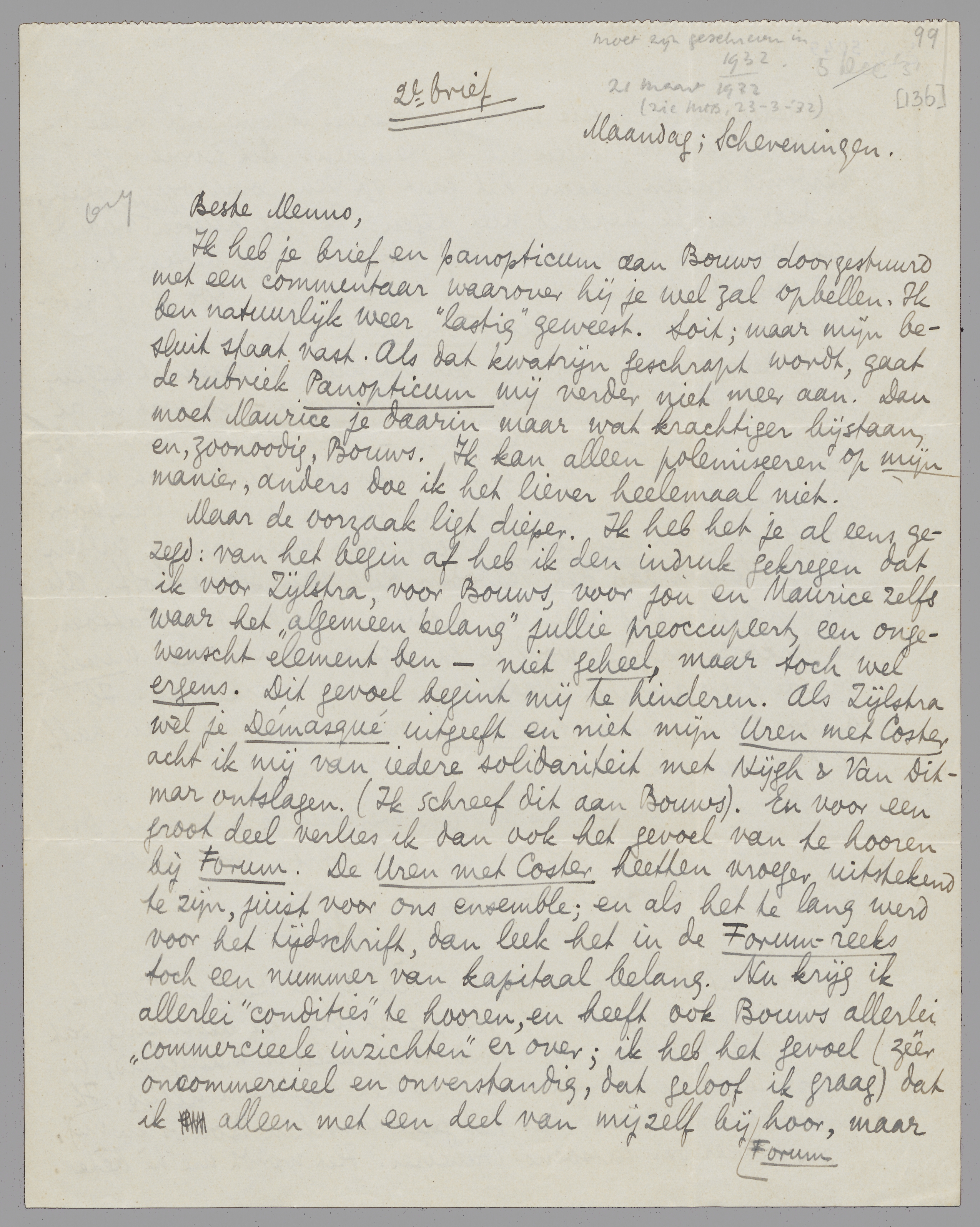 Maar de oorzaak ligt dieper. Ik heb het je al eens gezegd: van het begin af heb ik den indruk gekregen dat ik voor Zijlstra, voor Bouws, voor jou en Maurice zelfs waar het ‘algemeen belang’ jullie preoccupeert, een ongewenscht element ben - niet geheel, maar toch wel ergens. Dit gevoel begint mij te hinderen. Als Zijlstra wèl je Démasqué uitgeeft en niet mijn Uren met Coster acht ik mij van iedere solidariteit met Nijgh & Van Ditmar ontslagen. (Ik schreef dit aan Bouws). En voor een groot deel verlies ik dan ook het gevoel van te hooren bij Forum. De Uren met Coster heetten vroeger uitstekend te zijn, juist voor ons ensemble; en als het te lang werd voor het tijdschrift, dan leek het in de Forum-reeks toch een nummer van kapitaal belang. Nu krijg ik allerlei ‘condities’ te hooren, en heeft ook Bouws allerlei ‘commercieele inzichten’ er over; ik heb het gevoel (zéér oncommercieel en onverstandig, dat geloof ik graag) dat ik alleen met een deel van mijzelf bij Forum hoor, maar dat iedereen in laatste instantie bereid is om (uit welke overwegingen dan ook) tegen mij te stemmen. Dit gevoel is mij verdomd onaangenaam; het gaat op een compromis lijken, en daar kan ik bepaald niet tegen. Ik geef heusch liever voor de rest van mijn levensdagen bij Stols uit, en betaal dan nog mijn boekjes, als dat moet en kan, dan zoo half getolereerd een ‘voorman’ van Forum te zijn.