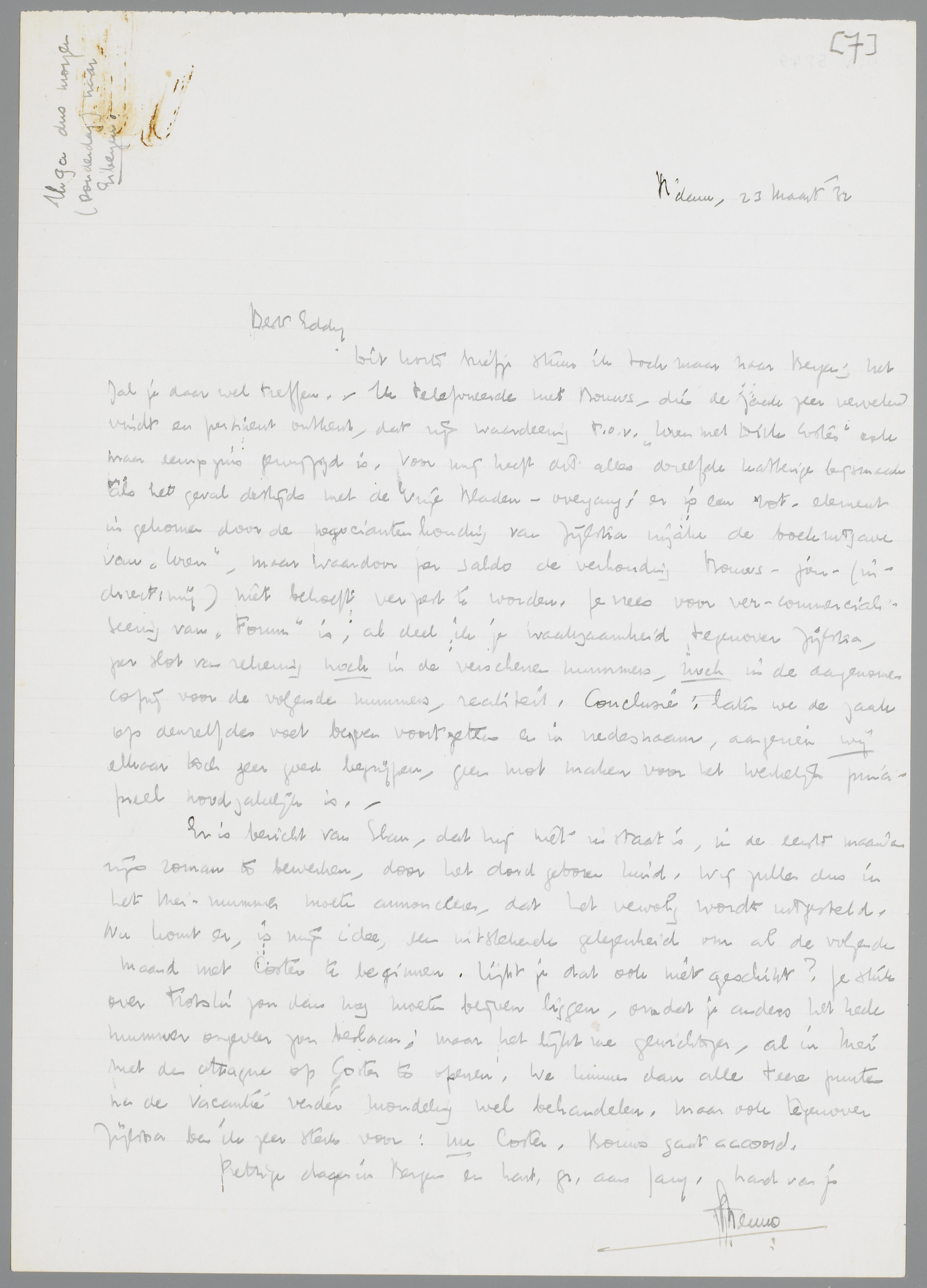 Er is bericht van Slau, dat hij niet in staat is, in de eerste maanden zijn roman te bewerken, door het dood geboren kind. Wij zullen dus in het Meinummer moeten annonceeren, dat het vervolg wordt uitgesteld. Nu komt er, is mijn idee, een uitstekende gelegenheid om al de volgende maand met Coster te beginnen. Lijkt je dat ook niet geschikt? Je stuk over Trotski zou dan nog moeten blijven liggen, omdat je anders het heele nummer ongeveer zou beslaan; maar het lijkt me gewichtiger, al in Mei met den attaque op Coster te openen. We kunnen dan alle teere punten na de vacantie verder mondeling wel behandelen. Maar ook tegenover Zijlstra ben ik zeer sterk voor: nu Coster, Bouws gaat accoord.