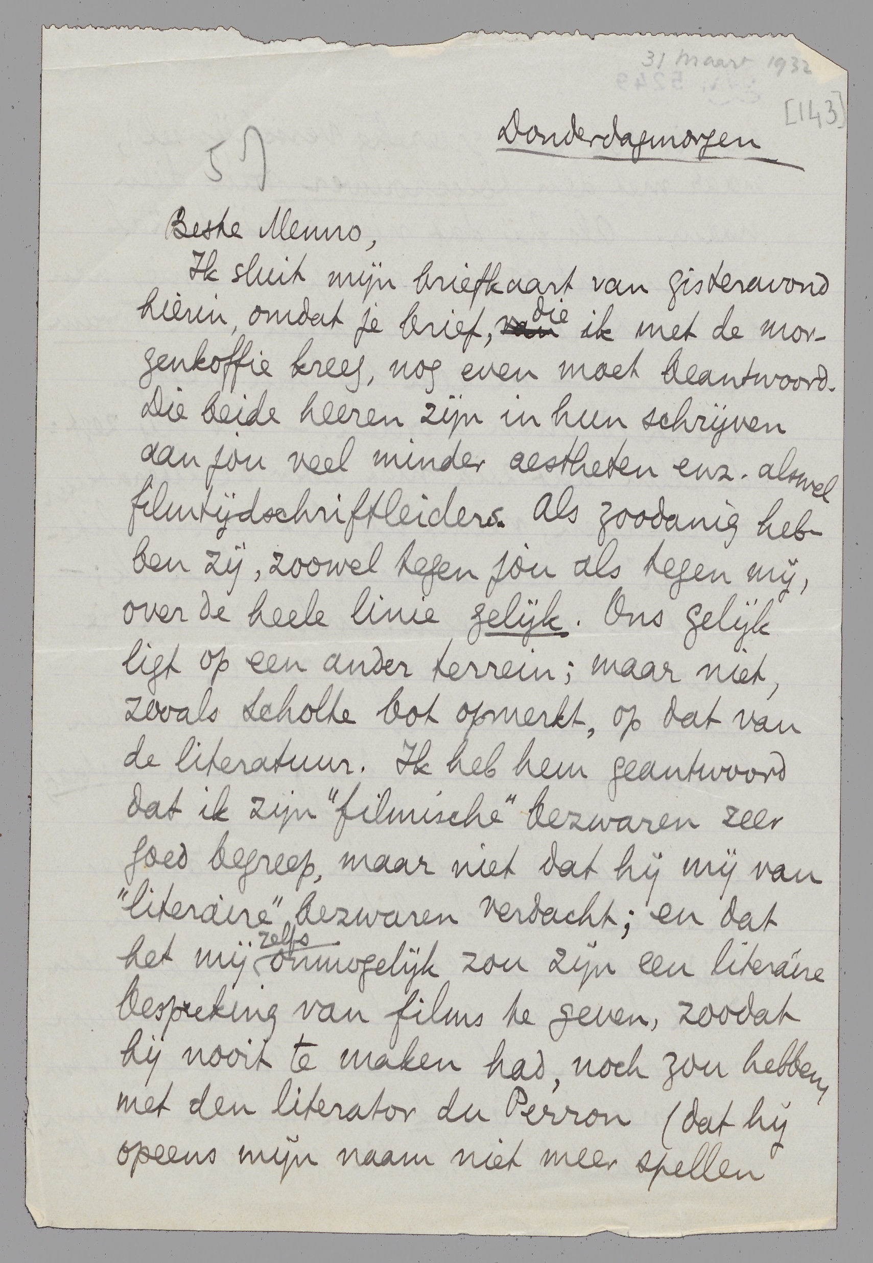 Ik sluit mijn briefkaart van gisteravond hierin, omdat je brief, die ik met de morgenkoffie kreeg, nog even moet beantwoord. Die beide heeren zijn in hun schrijven aan jou veel minder aestheten enz. alswel filmtijdschriftleiders. Als zoodanig hebben zij, zoowel tegen jou als tegen mij, over de heele linie gelijk. Ons gelijk ligt op een ander terrein; maar niet, zooals Scholte bot opmerkt, op dat van de literatuur. Ik heb hem geantwoord dat ik zijn ‘filmische’ bezwaren zeer goed begreep, maar niet dat hij mij van ‘literaire’ bezwaren verdacht; en dat het mij zelfs onmogelijk zou zijn een literaire bespreking van films te geven, zoodat hij nooit te maken had, noch zou hebben met den literator du Perron (dat hij opeens mijn naam niet meer spellen kan is ook een griezelig verschijnsel), maar met den toeschouwer van dien naam. Als hij dat niet begrijpt, zal ik hem dat op een scherper manier aan het verstand zien te brengen - in Forum dan maar - al zou hij van ‘heftige bitterheid’ groen worden. - Als hij zegt: ‘de film laat zich niet door de literatuur overwinnen’, neemt hij het woord ‘literatuur’ in een anderen zin dan ik; - want ik zou zeggen: inhoud. En die inhoud, die jammerlijk rot is, kàn met geen mogelijkheid literair worden besproken, aangezien hij filmisch bestaat, en met deze film, die door Scholte koek genoemd wordt, één is. Wanneer zijn koek door de ‘literatuur’ nog altijd naar zand en grint smaakt, dan wòrdt de film ook door de ‘literatuur’ overwonnen, of althans grondig verpest, wat meer is dan ik zou willen beweren!
