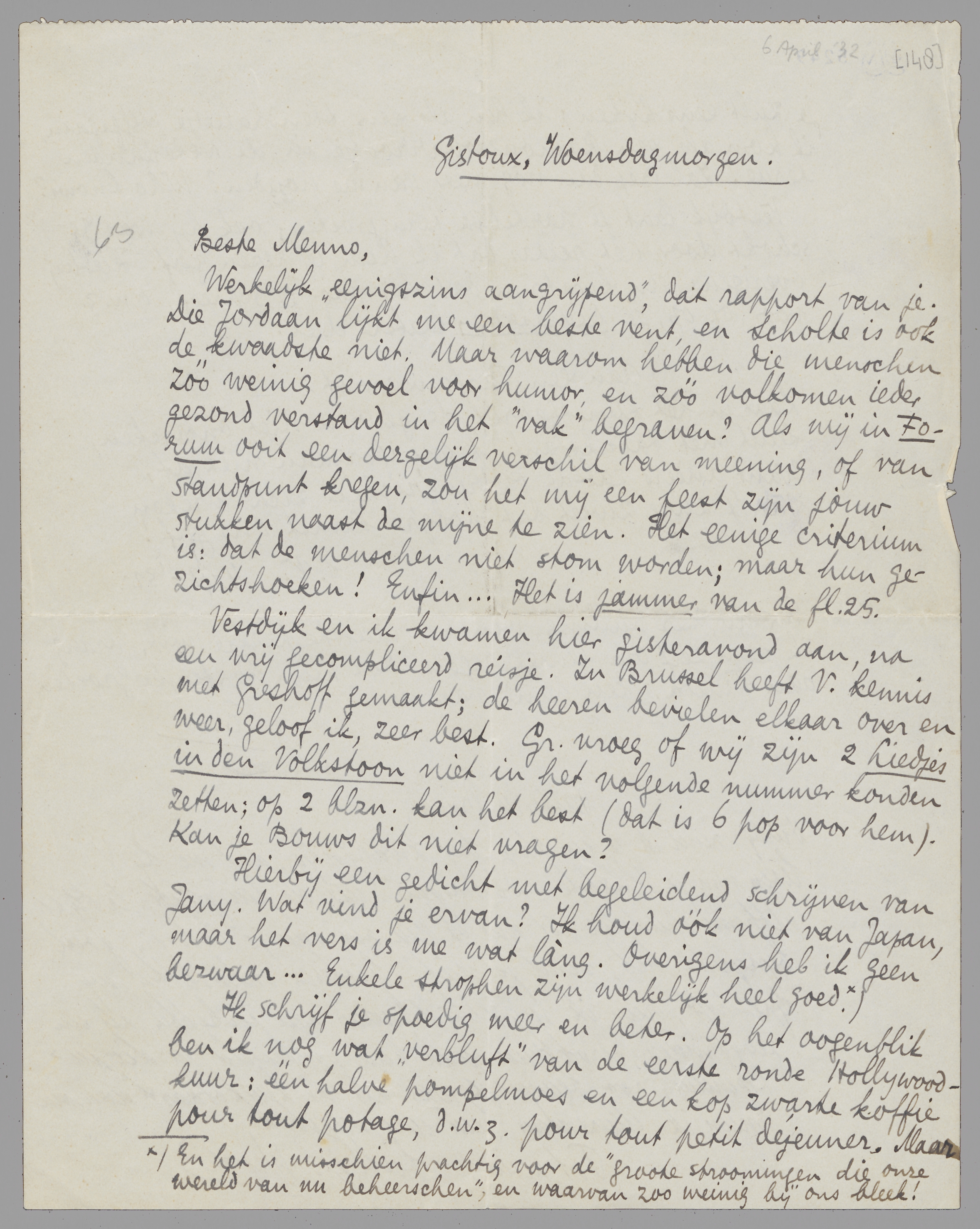 Werkelijk ‘eenigszins aangrijpend,’ dat rapport van je. Die Jordaan lijkt me een beste vent, en Scholte is ook de kwaadste niet. Maar waarom hebben die menschen zóó weinig gevoel voor humor, en zóó volkomen ieder gezond verstand in het ‘vak’ begraven? Als wij in Forum ooit een dergelijk verschil van meening, of van standpunt kregen, zou het mij een feest zijn jouw stukken naast de mijne te zien. Het eenige criterium is: dat de menschen niet stom worden; maar hun gezichtshoeken! Enfin... Het is jammer van de fl. 25.