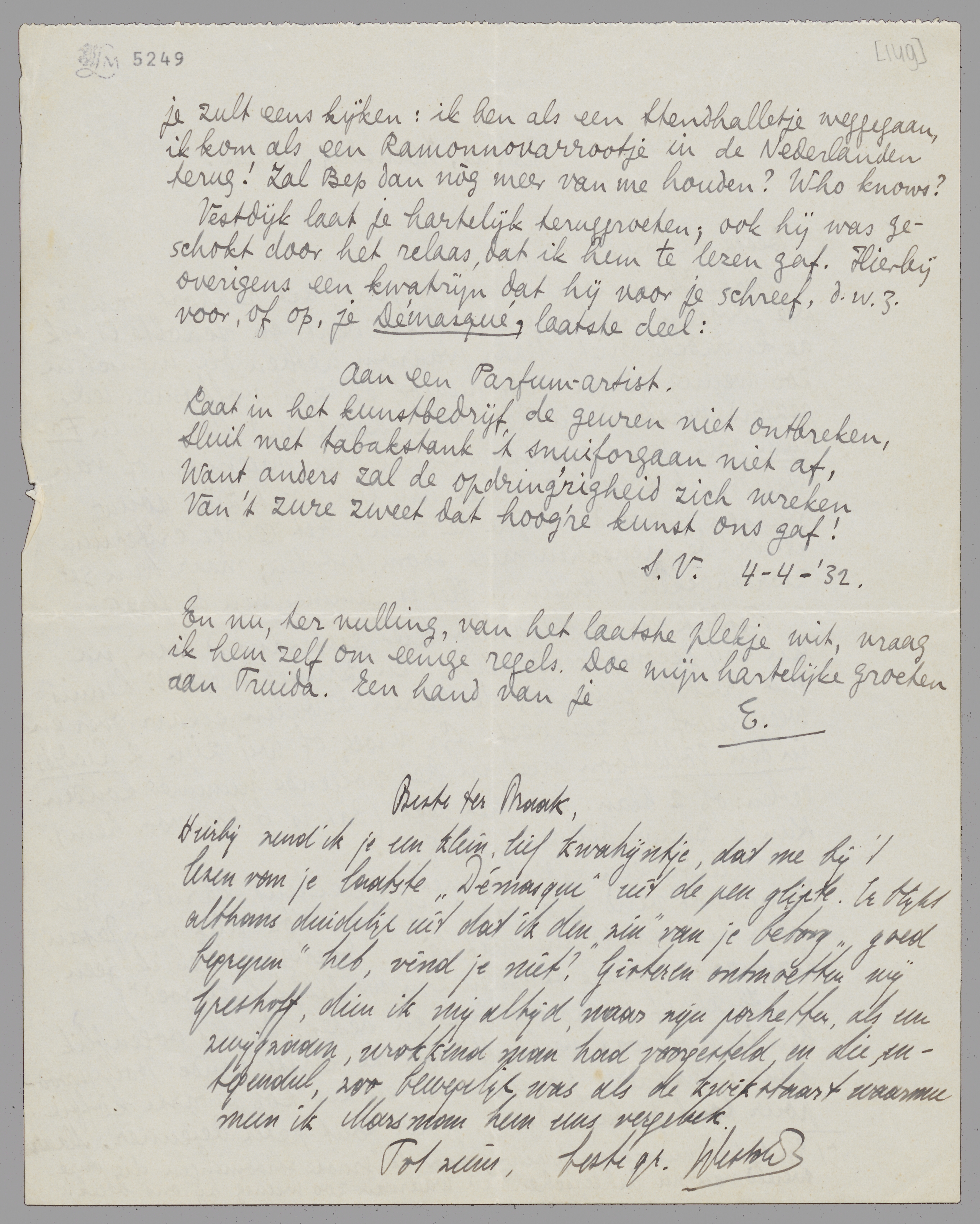 Vestdijk laat je hartelijk teruggroeten; ook hij was geschokt door het relaas, dat ik hem te lezen gaf Hierbij overigens een kwatrijn dat hij voor je schreef, d.w.z. voor, of op, je Démasqué, laatste deel:
