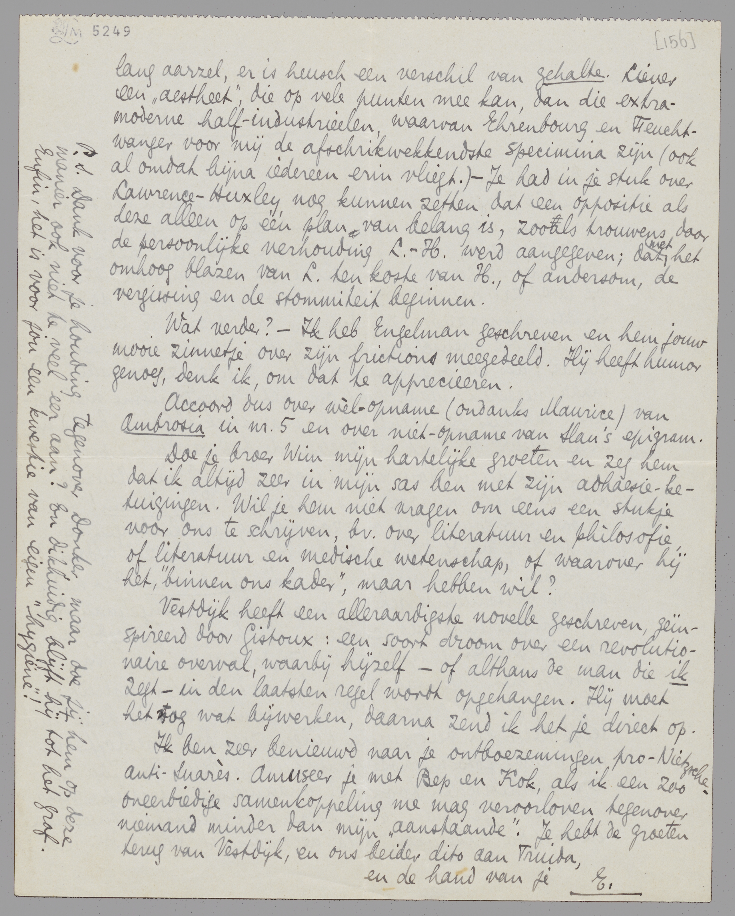 Ik ben zeer blij met je stem vóór Ambrosia. Het had mij, om verschillenden redenen, zeer gespeten als Engelman dat vers teruggestuurd had gekregen; ik schreef ze je reeds, en nog uitgebreider aan Bouws. Vandaag ontving ik van Greshoff het Engelmansche stukje dat ik hier insluit; objectief gezien geloof ik dat Engelman over de heele linie gelijk heeft en veel juister dingen zegt dan Greshoff over die nieuwe foto-methode van Luc en Paul H. Jou zal zijn ‘aesthetischen’ toon wel onaangenaam treffen, maar ik moet zeggen: als ik te kiezen heb tusschen Engelman en van die zakelijken à la de Haesaerts, dat ik dan niet lang aarzel, er is heusch een verschil van gehalte. Liever een ‘aestheet’, die op vele punten mee kan, dan die extramoderne half-industrieelen, waarvan Ehrenbourg en Feuchtwanger voor mij de afschrikwekkendste specimina zijn (ook al omdat bijna iedereen erin vliegt.) - Je had in je stuk over Lawrence-Huxley nog kunnen zetten dat een oppositie als deze alleen op één plan van belang is, zooals trouwens door de persoonlijke verhouding L.-H. werd aangegeven; dat met het omhoog blazen van L. ten koste van H., of andersom, de vergissing en de stommiteit beginnen.