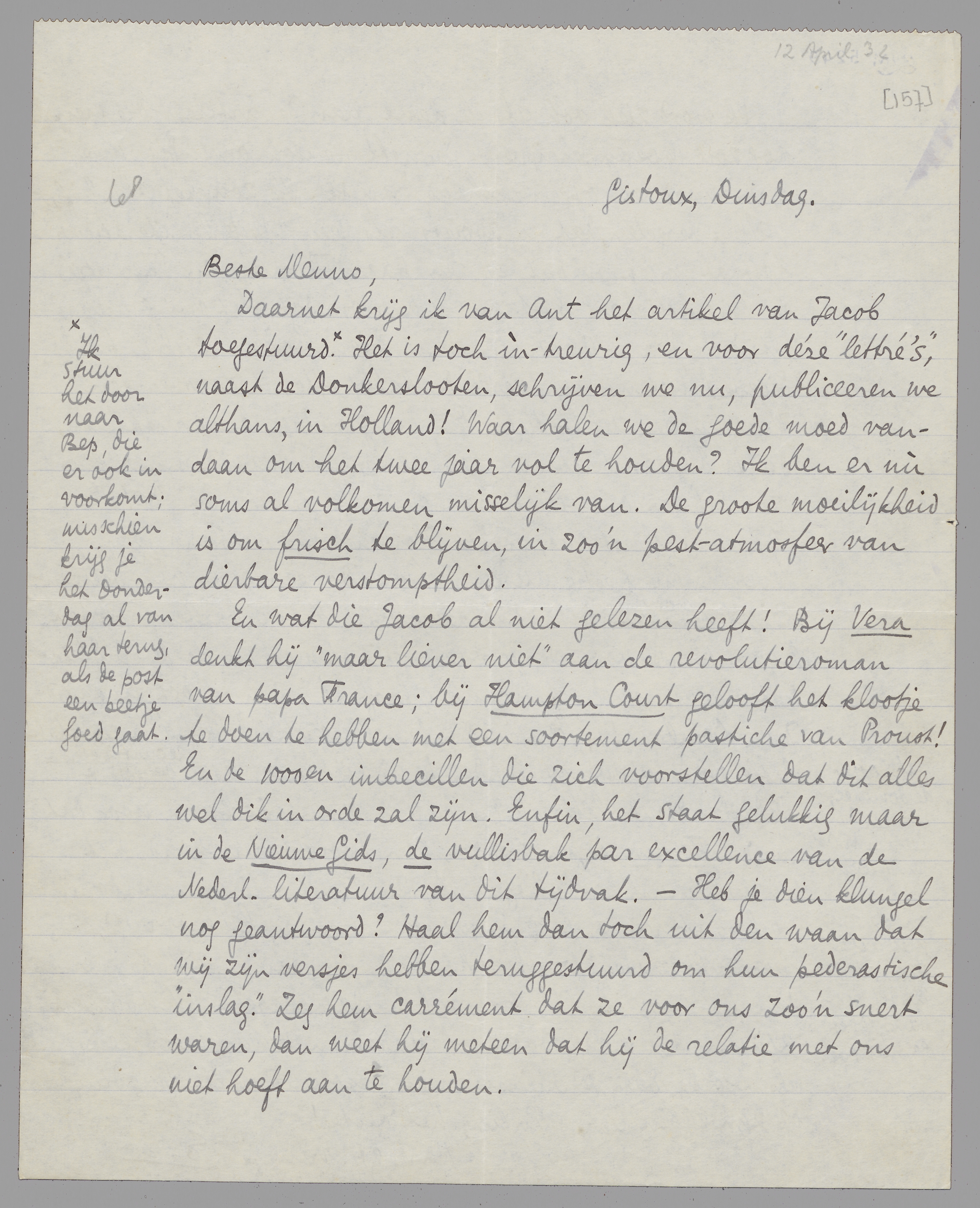 En wat die Jacob al niet gelezen heeft! Bij Vera denkt hij ‘maar liever niet’ aan de revolutieroman van papa France; bij Hampton Court gelooft het klootje te doen te hebben met een soortement pastiche van Proust! En de 1000en imbecillen die zich voorstellen dat dit alles wel dik in orde zal zijn. Enfin, het staat gelukkig maar in de Nieuwe Gids, de vullisbak par excellence van de Nederl. literatuur van dit tijdvak. - Heb je dien klungel nog geantwoord? Haal hem dan toch uit den waan dat wij zijn versjes hebben teruggestuurd om hun pederastische ‘inslag’. Zeg hem carrément dat ze voor ons zoo’n snert waren, dan weet hij meteen dat hij de relatie met ons niet hoeft aan te houden.