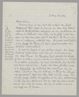 Daarnet krijg ik van Ant het artikel van Jacob toegestuurd*. Het is toch ìn-treurig, en voor déze ‘lettré's’, naast de Donkerslooten, schrijven we nu, publiceeren we althans, in Holland! Waar halen we de goede moed vandaan om het twee jaar vol te houden? Ik ben er nù soms al volkomen misselijk van. De groote moeilijkheid is om frisch te blijven, in zoo'n pest-atmosfeer van dierbare verstomptheid.