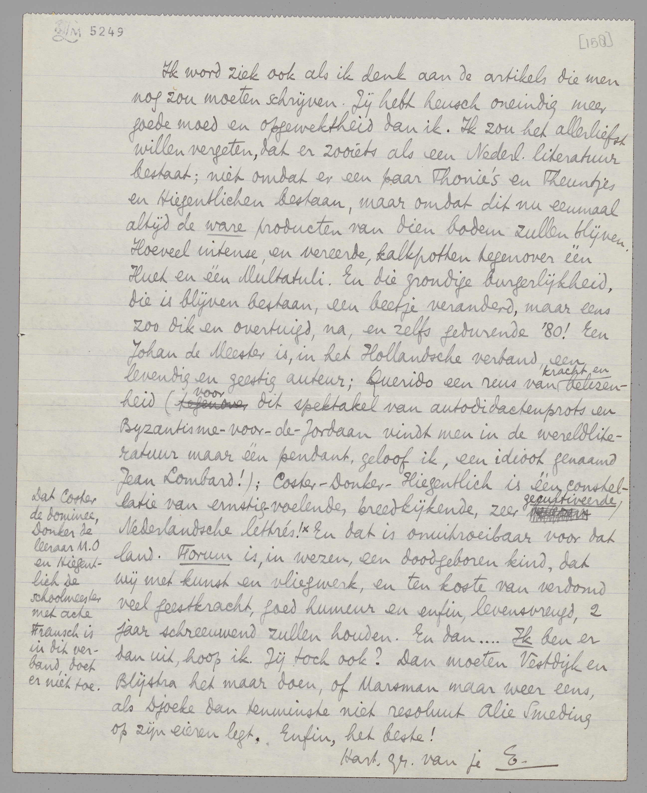 Ik word ziek ook als ik denk aan de artikels die men nog zou moeten schrijven. Jij hebt heusch oneindig meer goede moed en opgewektheid dan ik. Ik zou het allerliefst willen vergeten, dat er zooiets als een Nederl. literatuur bestaat; niet omdat er een paar Thonie's en Theuntjes en Hiegentlichen bestaan, maar omdat dit nu eenmaal altijd de ware producten van dien bodem zullen blijven. Hoeveel intense, en vereerde, kalkpotten tegenover één Huet en één Multatuli. En die grondige burgerlijkheid, die is blijven bestaan, een beetje veranderd, maar eens zoo dik en overtuigd, na, en zelfs gedurende '80! Een Johan de Meester is, in het Hollandsche verband, een levendig en geestig auteur; Querido een reus van kracht en belezenheid (voor dit spektakel van autodidactenprots en Byzantisme-voor-de-Jordaan vindt men in de wereldliteratuur maar één pendant, geloof ik, een idioot genaamd Jean Lombard!); Coster-Donker-Hiegentlich is één constellatie van ernstig-voelende, breedkijkende, zeer gecultiveerde Nederlandsche lettrés!** En dat is onuitroeibaar voor dat land. Forum is, in wezen, een doodgeboren kind, dat wij met kunst en vliegwerk, en ten koste van verdomd veel geestkracht, goed humeur en enfin, levensvreugd, 2 jaar schreeuwend zullen houden. En dan... Ik ben er dan uit, hoop ik. Jij toch ook? Dan moeten Vestdijk en Blijstra het maar doen, of Marsman maar weer eens, als Djoeke dan tenminste niet resoluut Alie Smeding op zijn eieren legt. Enfin, het beste! Hart. gr. van je